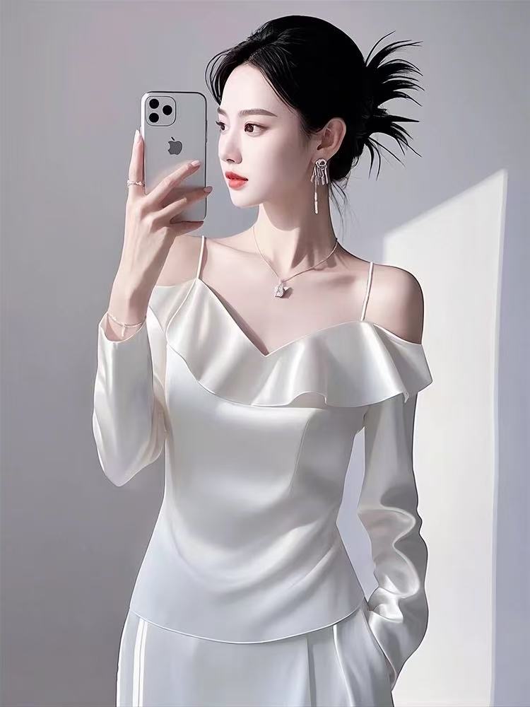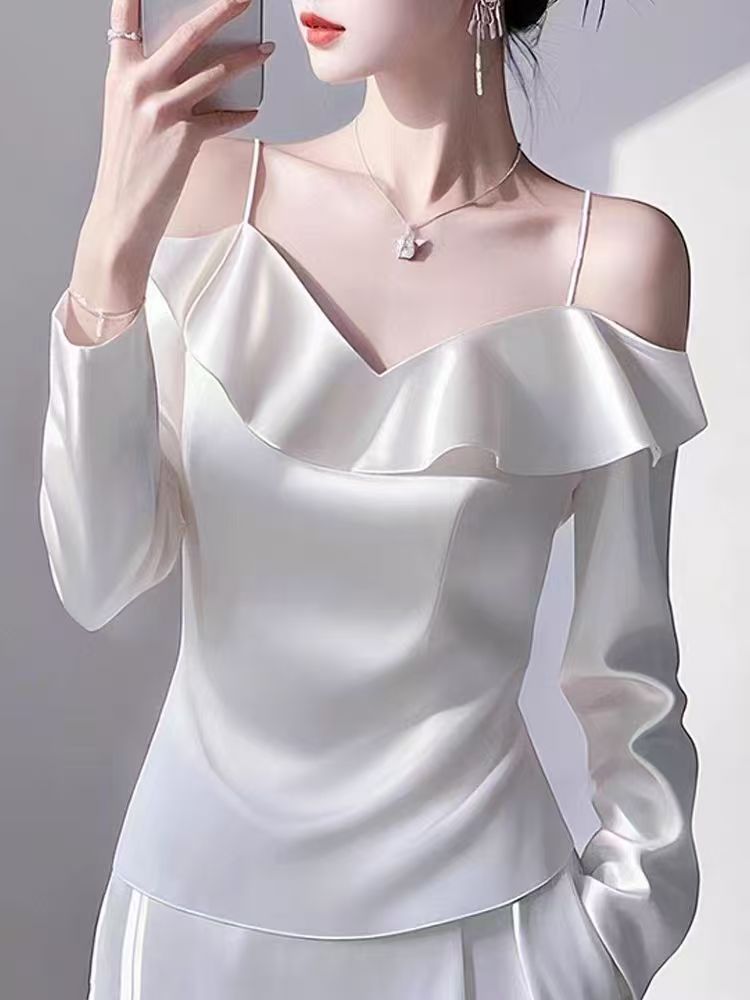 MY16390# 新款设计感高级白色吊带缎面衬衫女荷叶边衬衣女裝貨源服裝批發