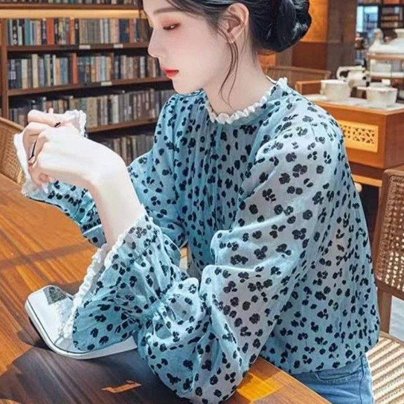 MY16395# 新款法式甜美轻熟小衫宽松蓝色碎花泡泡袖衬衫女裝貨源服裝批發