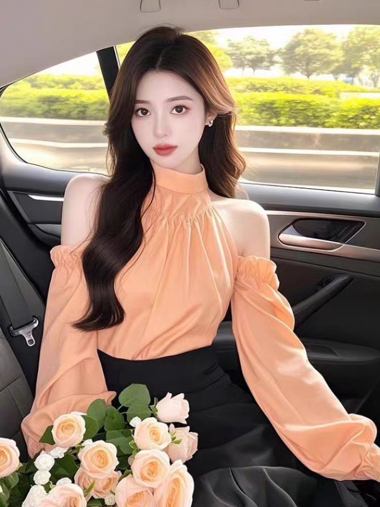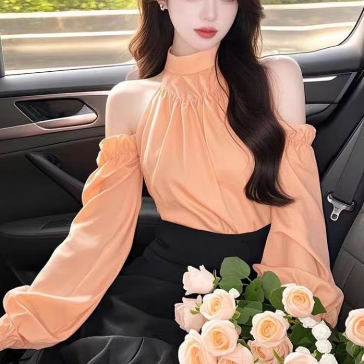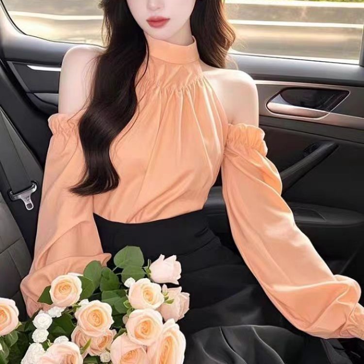 MY16396# 新款橙色法式设计感长袖衬衫女露肩宽松上衣女裝貨源服裝批發