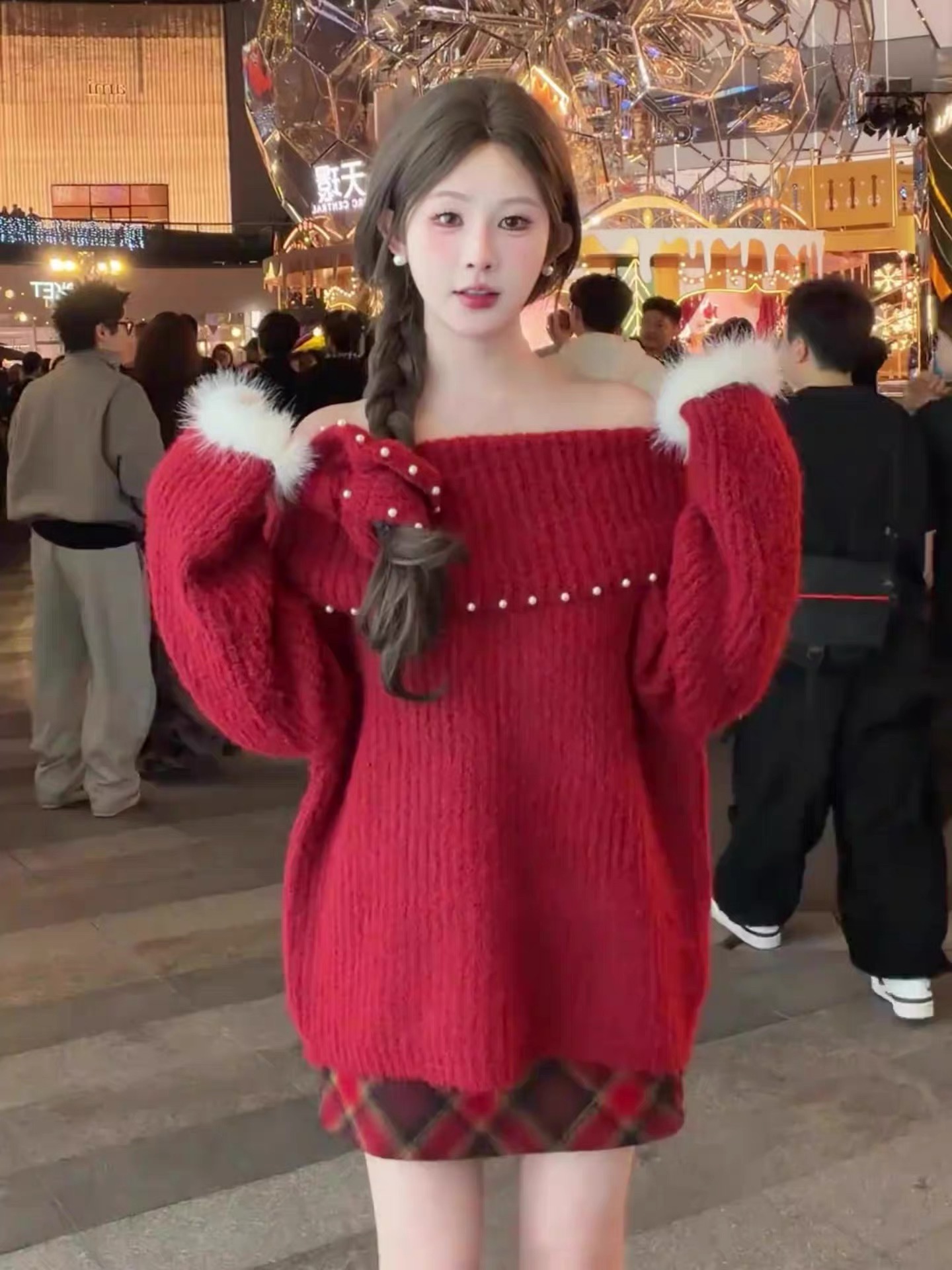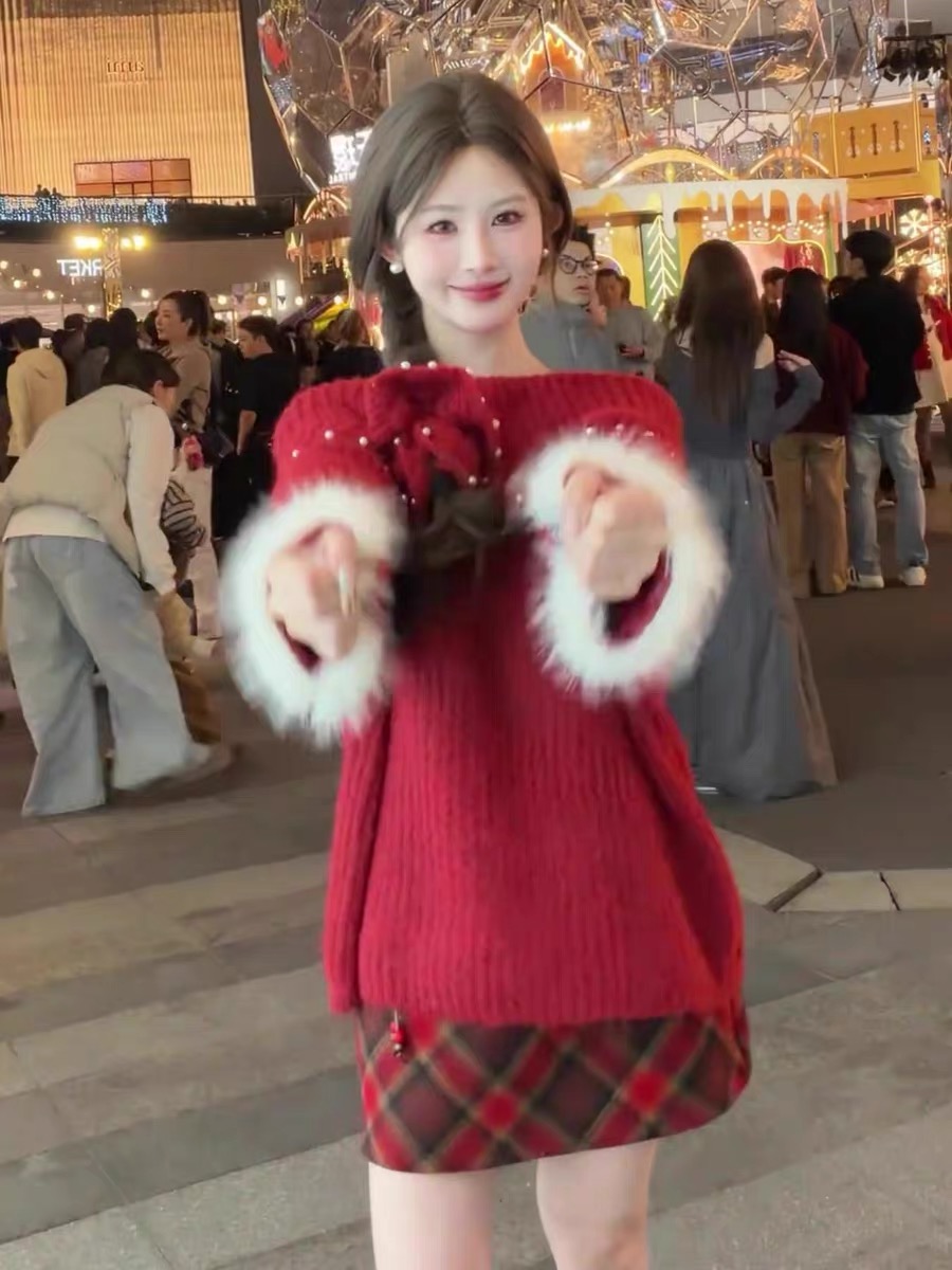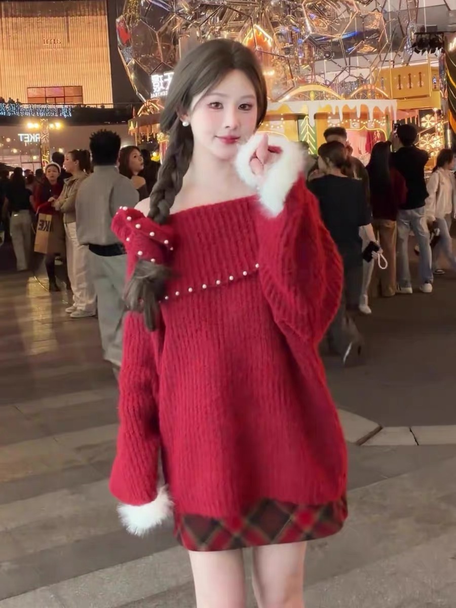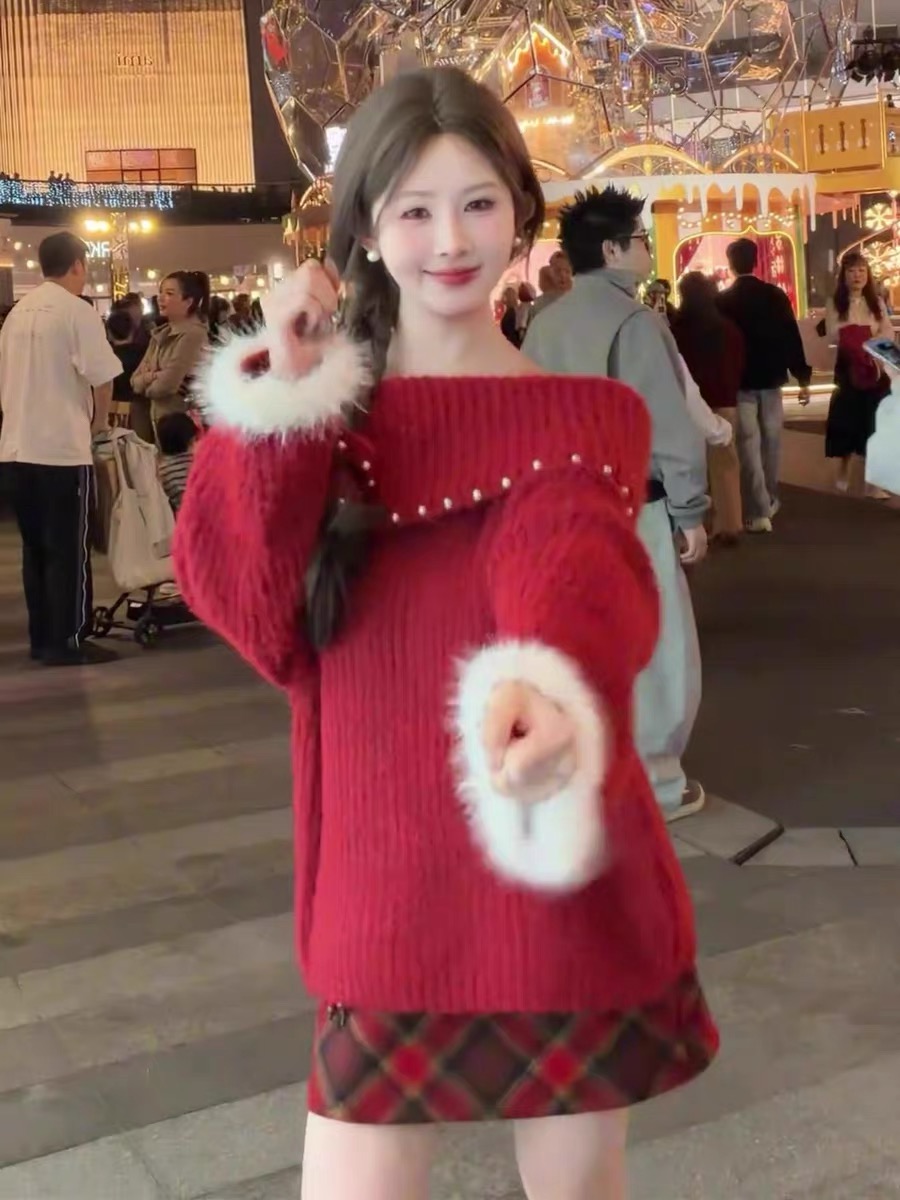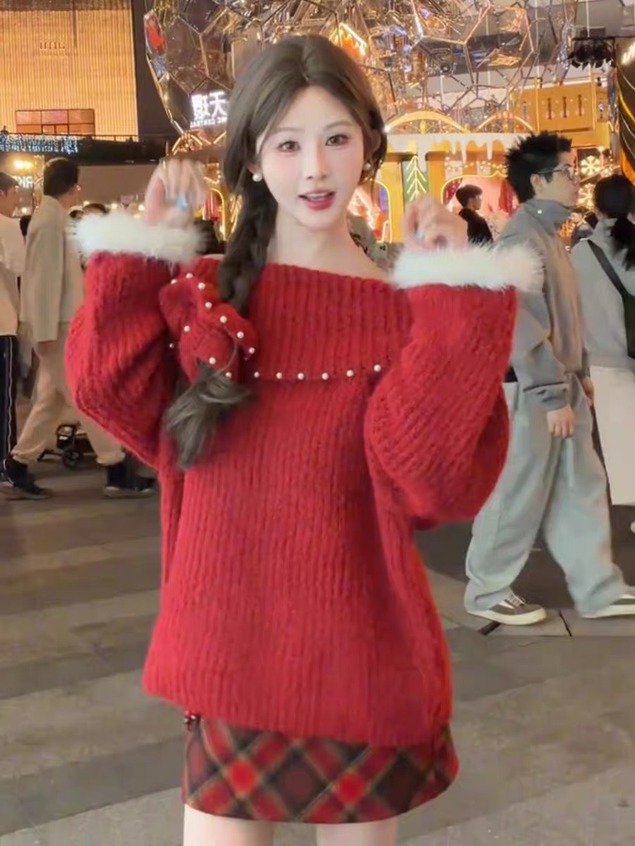 MY16402# 圣诞红色钉珠一字肩针织毛衣加厚氛围感慵懒宽松露肩上衣女裝貨源服裝批發