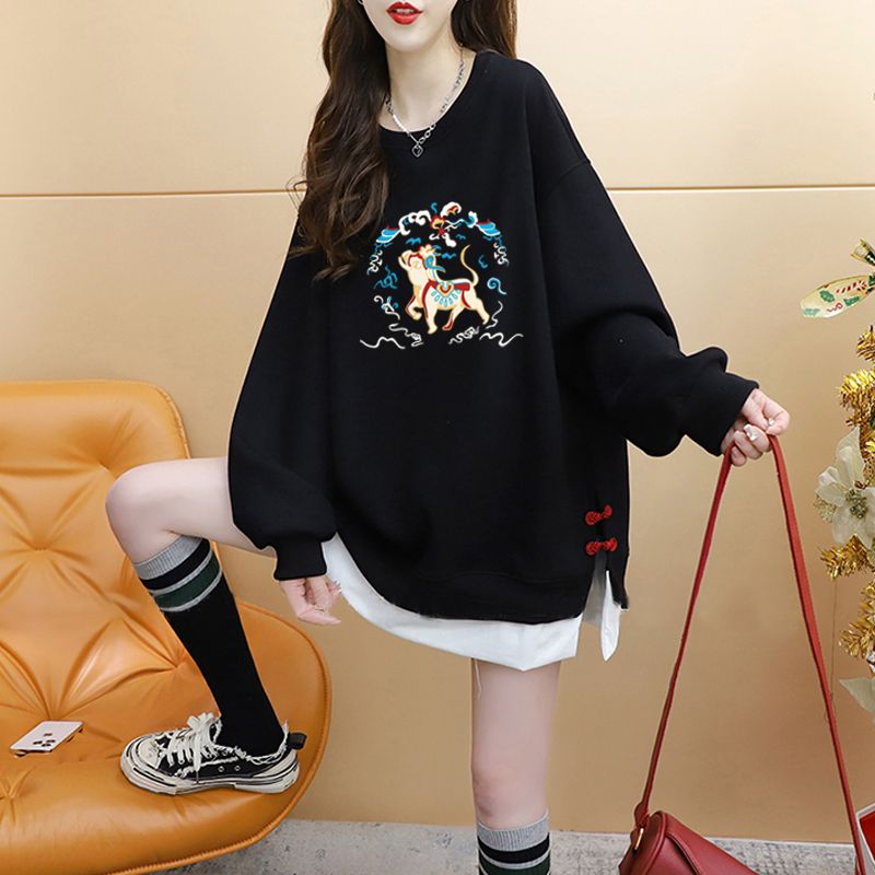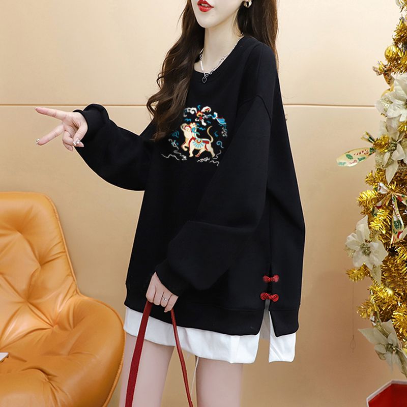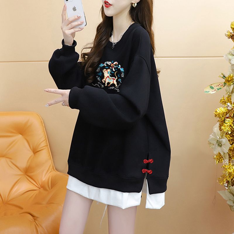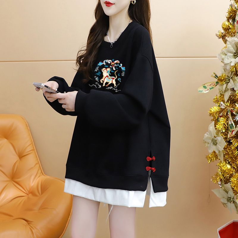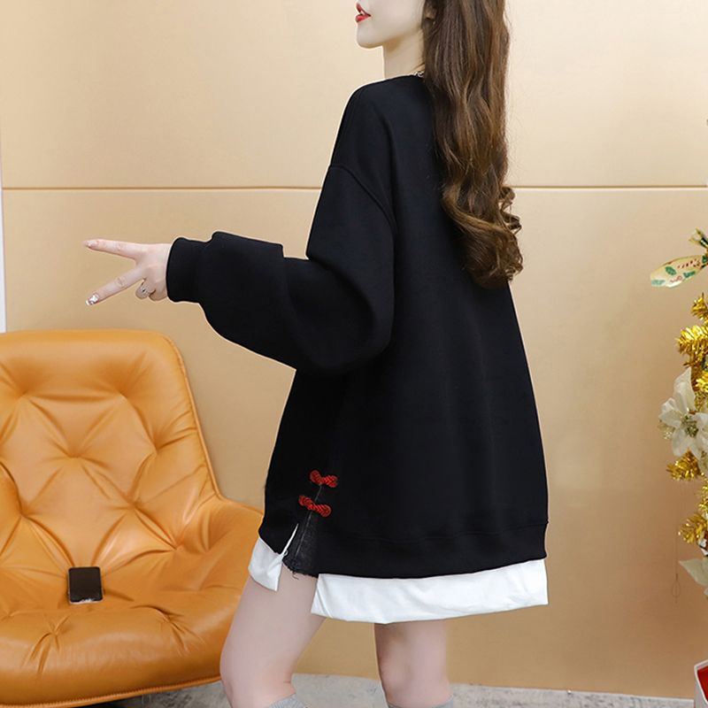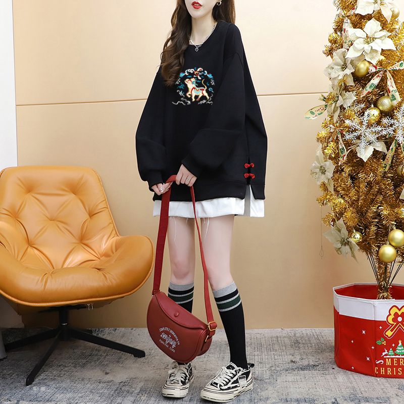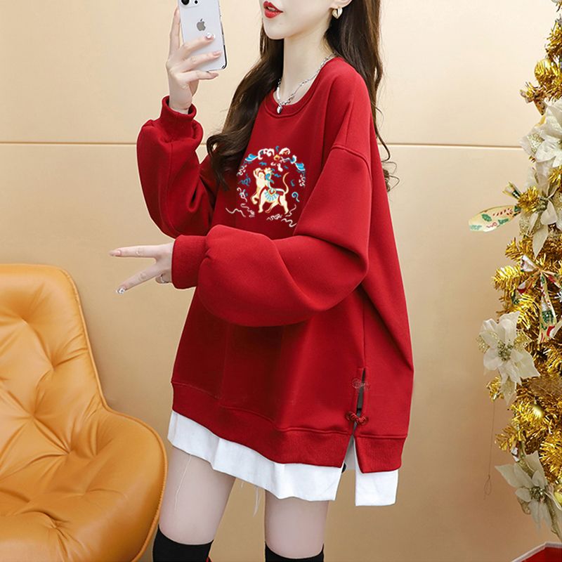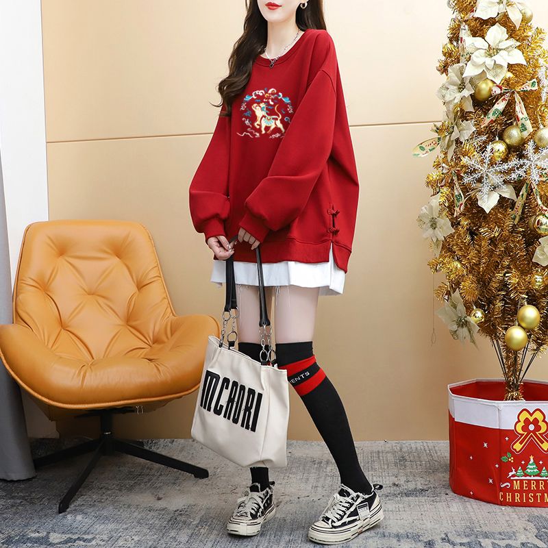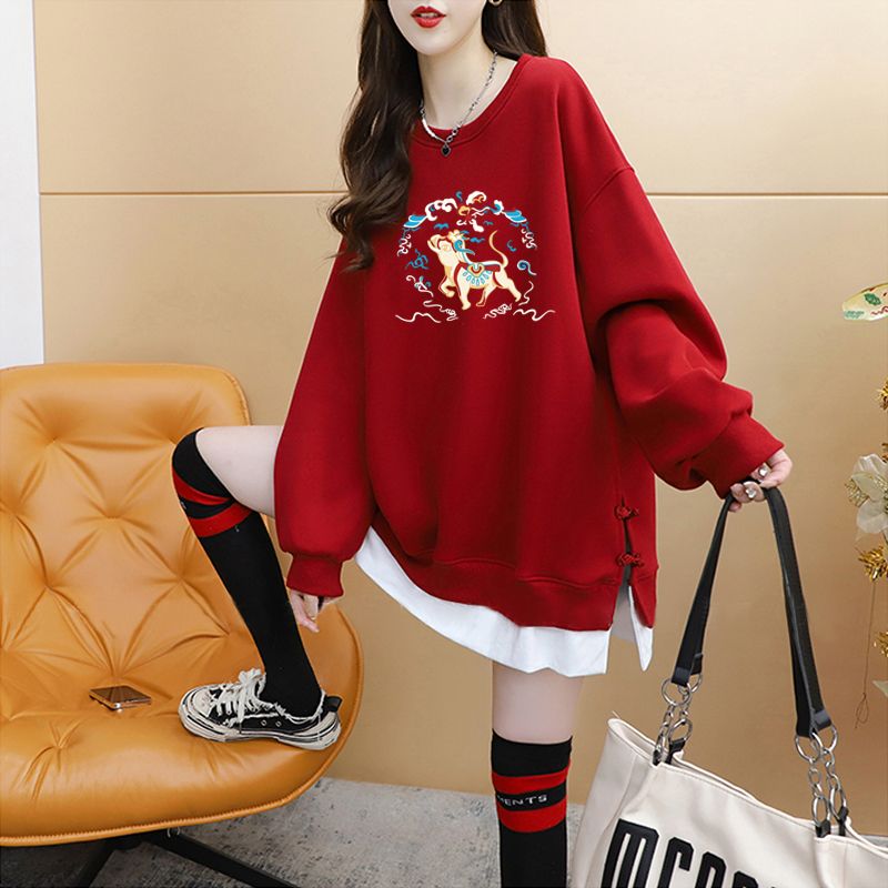 MY16403# 后包领~华棉韩版中长款时尚印花女新年红色假两件卫衣冬加绒加厚女裝貨源服裝批發