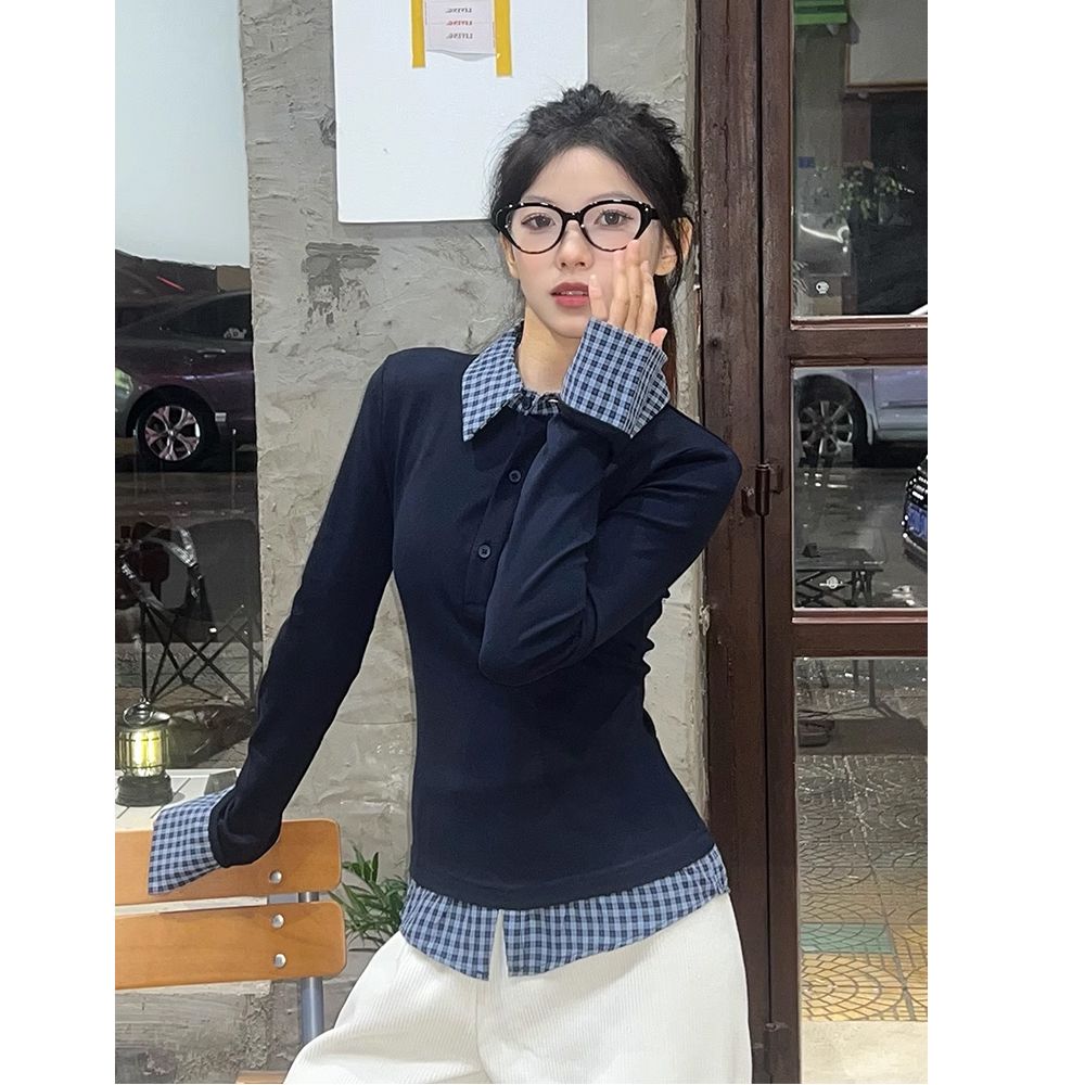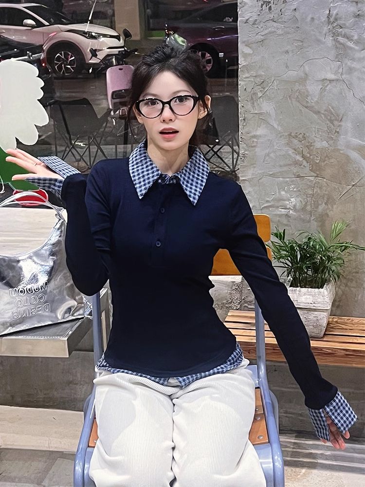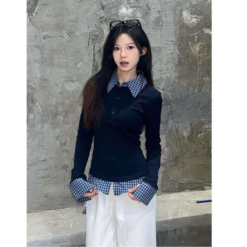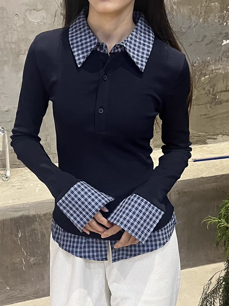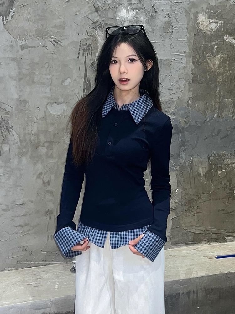 MY16408# 人棉藏青蓝撞色翻领假两件T恤女拼接短款Polo衫修身上衣女裝貨源服裝批發