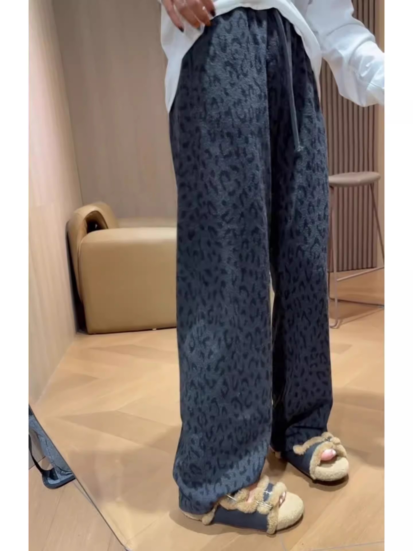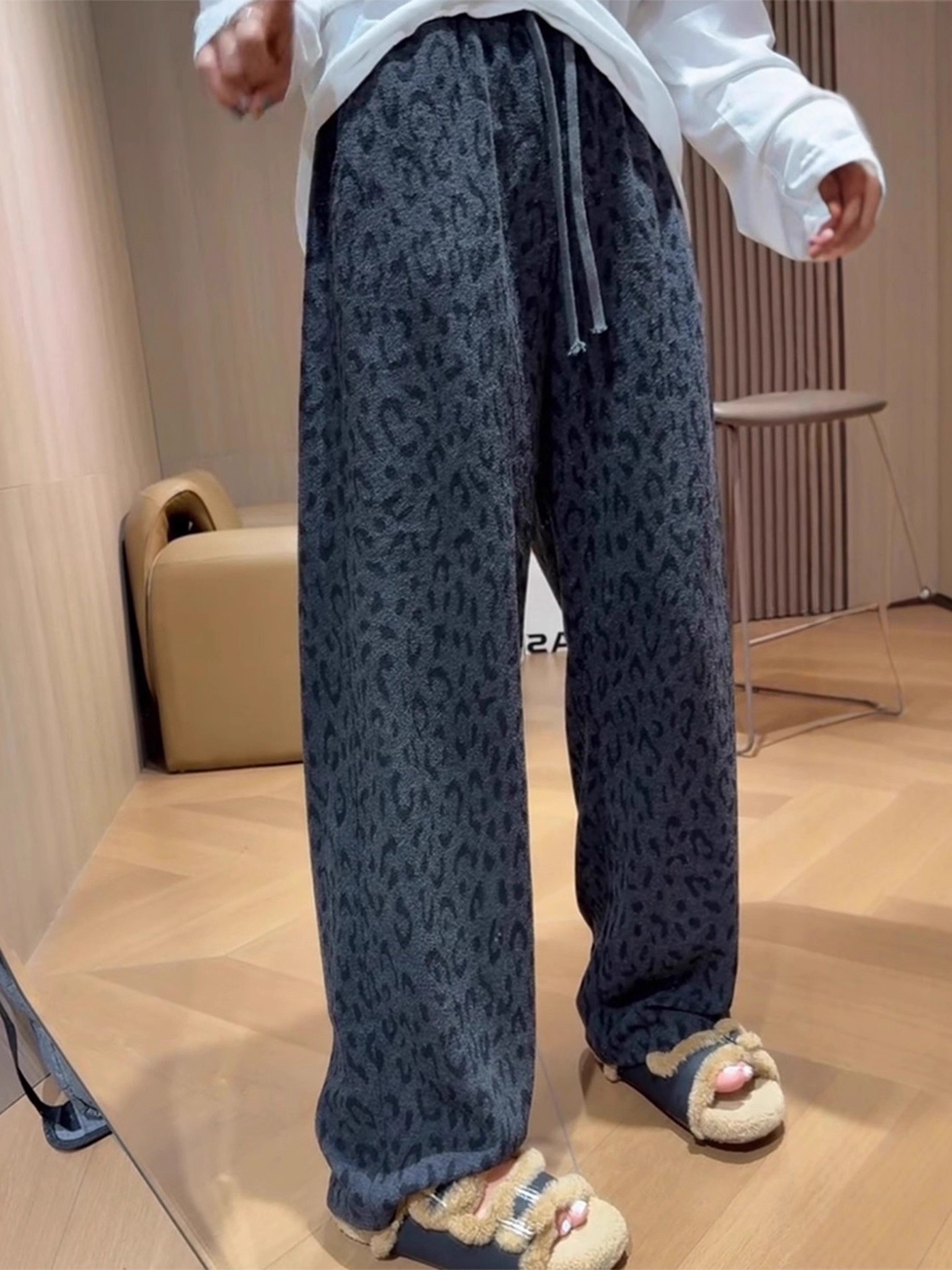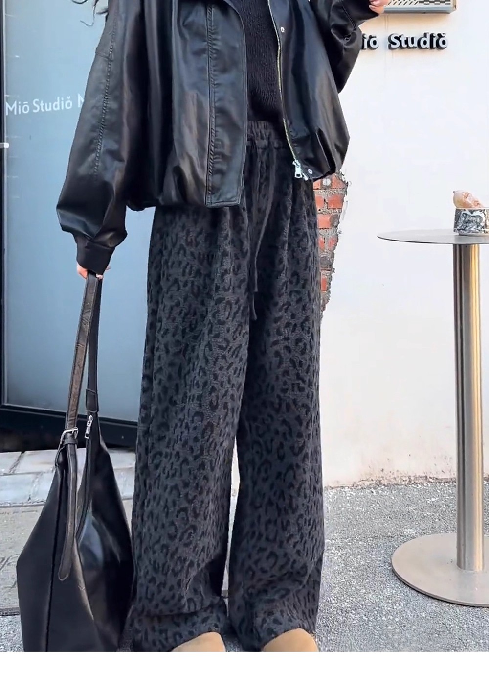 MY16410# 大码豹纹休闲裤女宽松慵懒阔腿裤秋冬胖MM高腰显瘦垂感设计感裤子女裝貨源服裝批發
