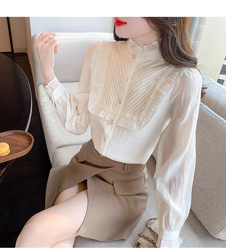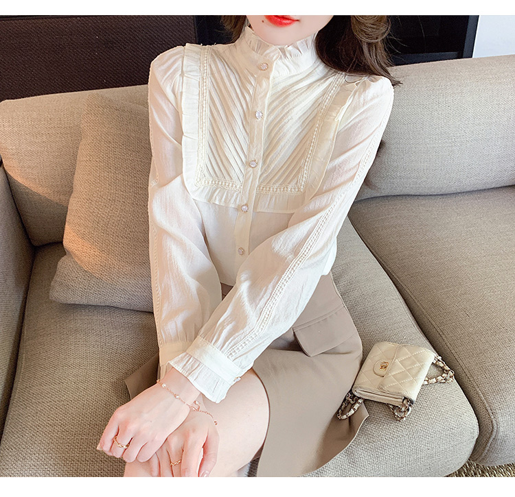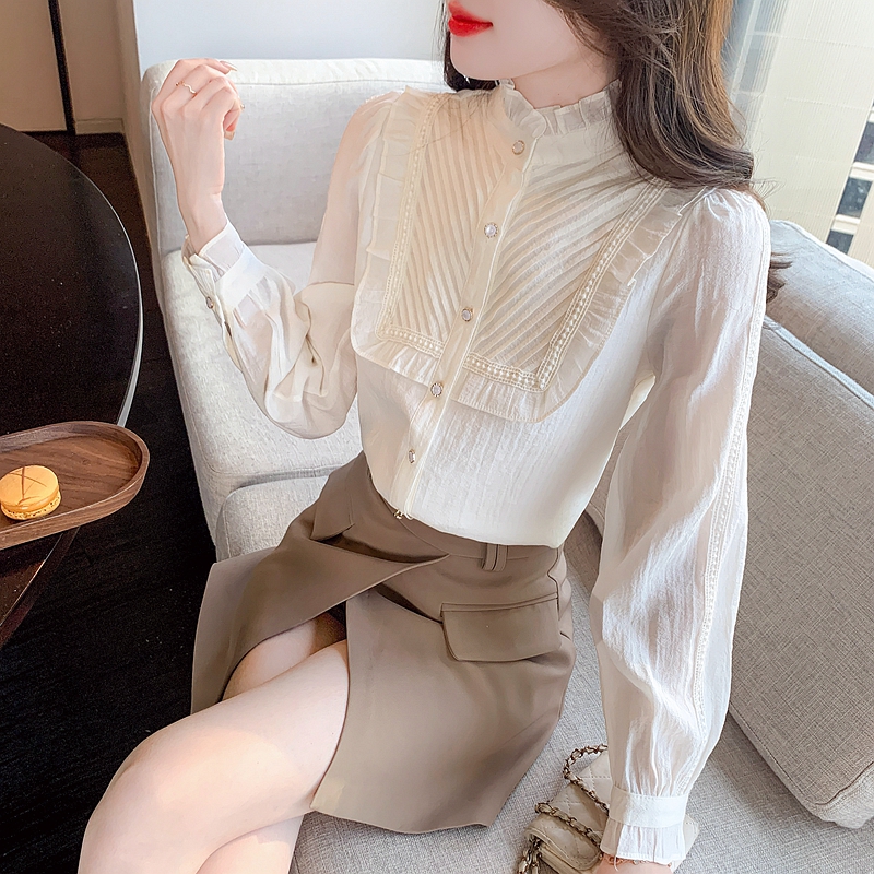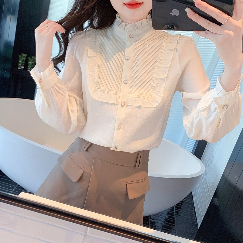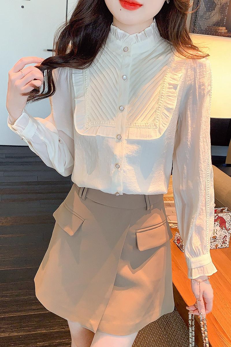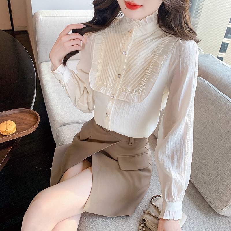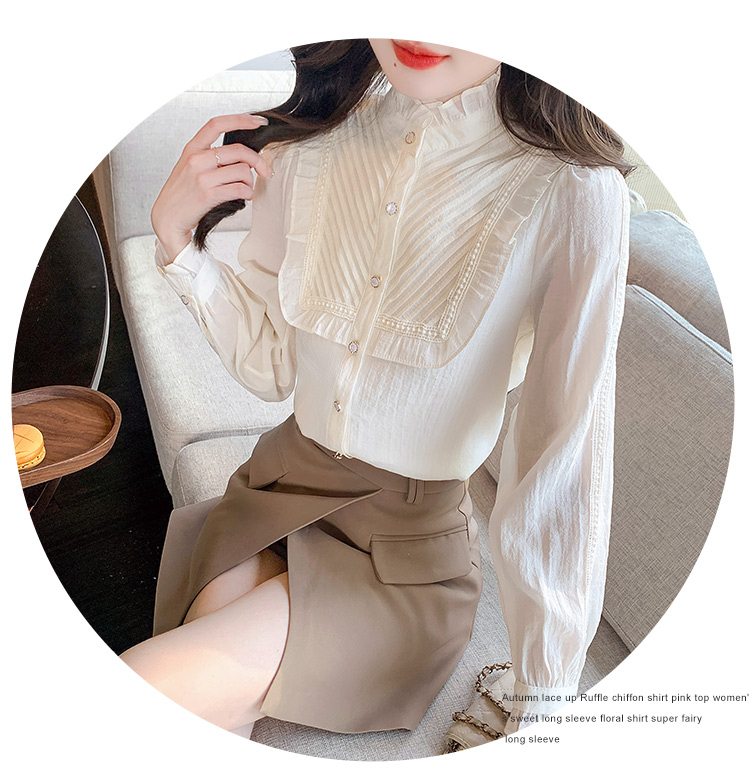 MY16417#立领杏色雪纺衬衫新款女装木耳花边上衣轻熟法式小众女裝貨源服裝批發