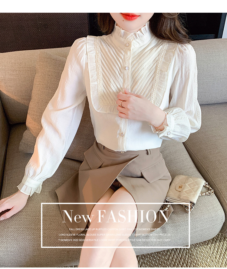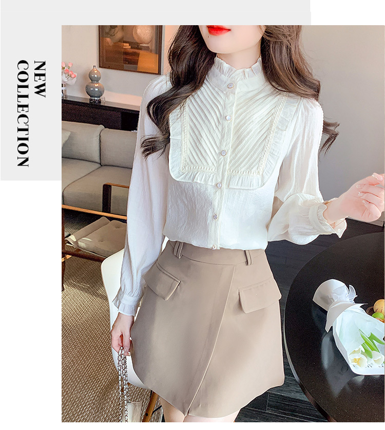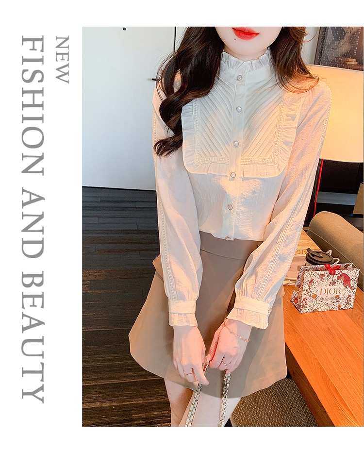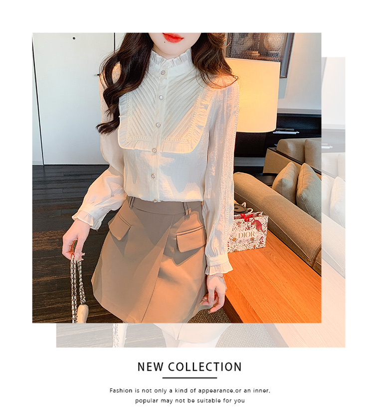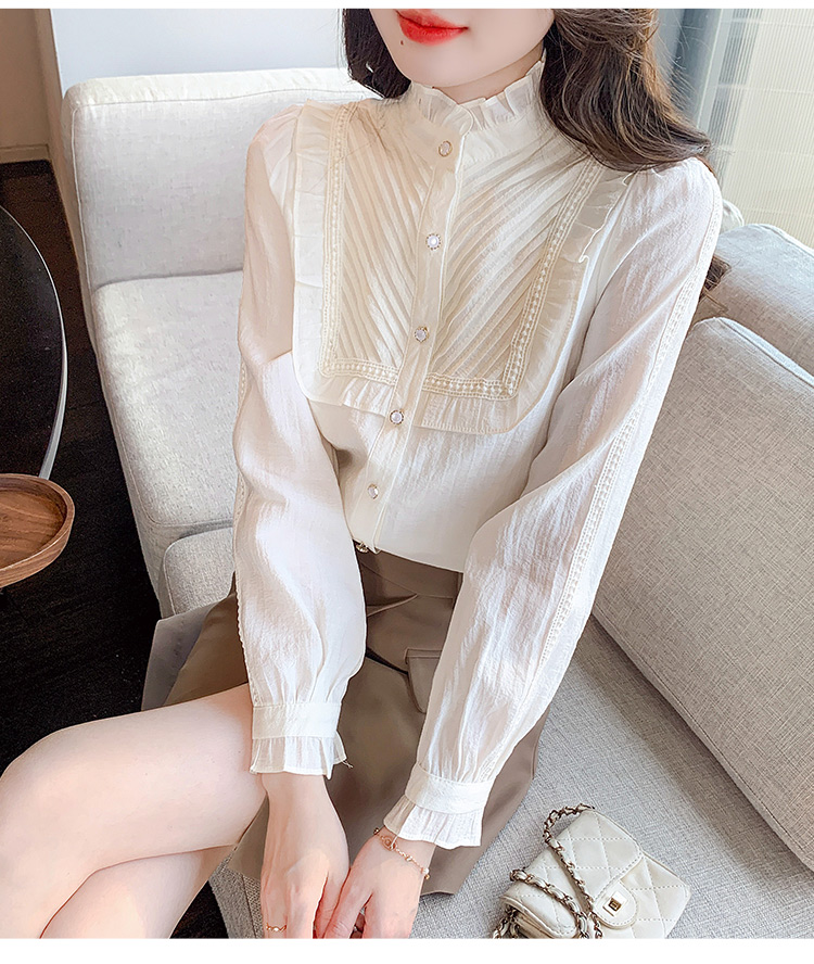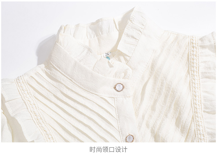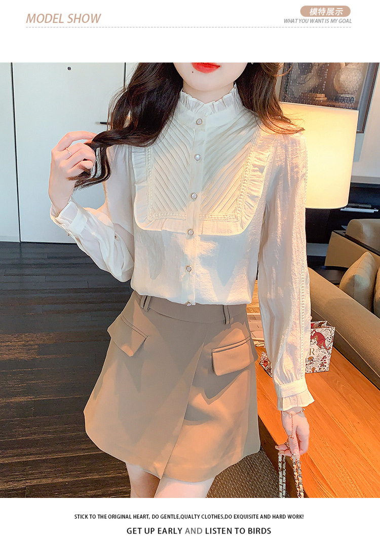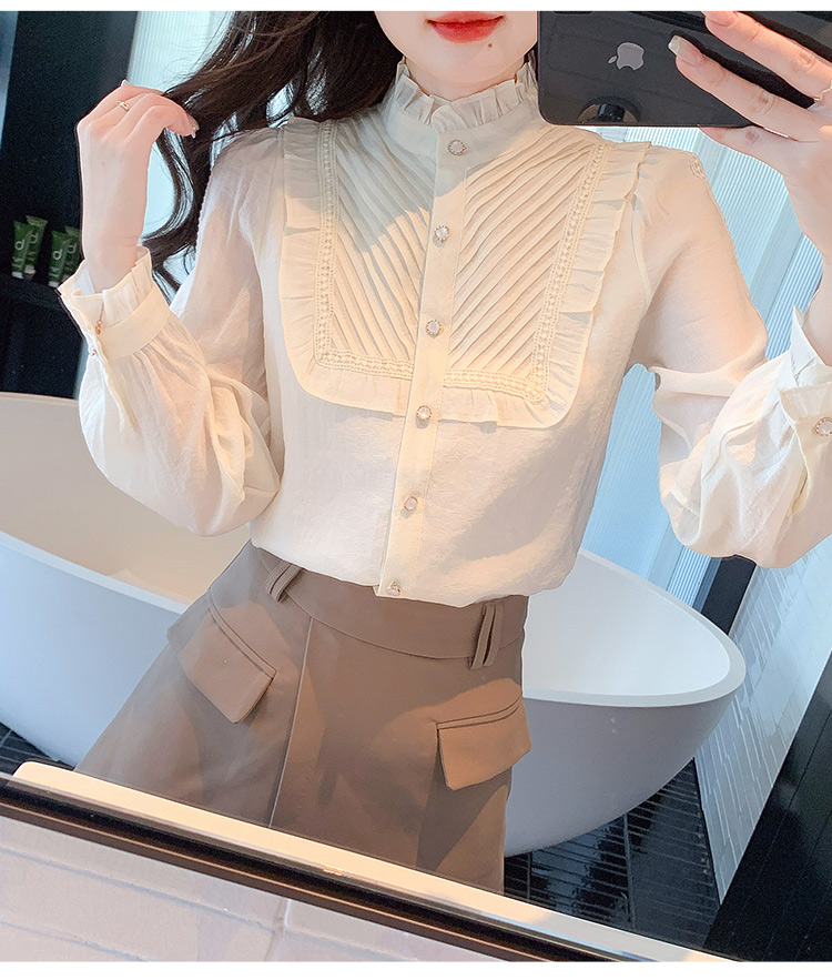 MY16417#立领杏色雪纺衬衫新款女装木耳花边上衣轻熟法式小众女裝貨源服裝批發