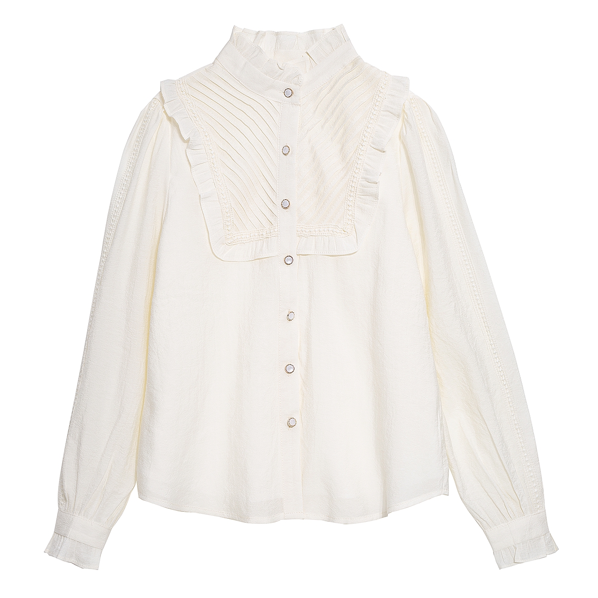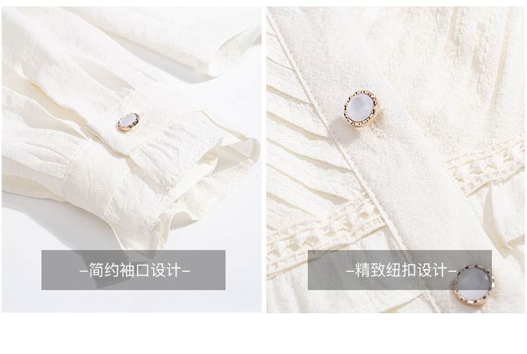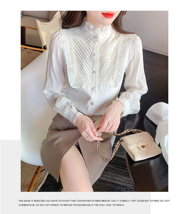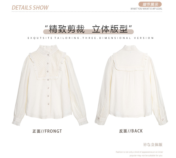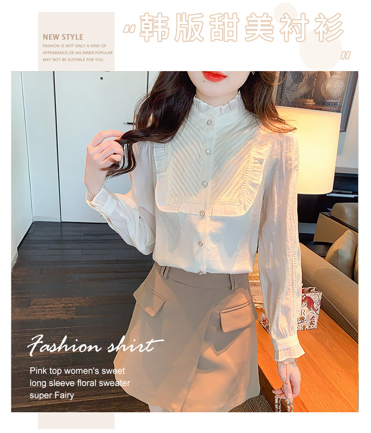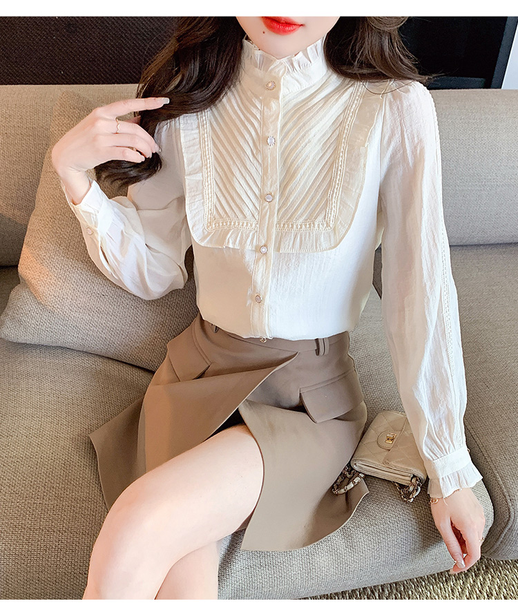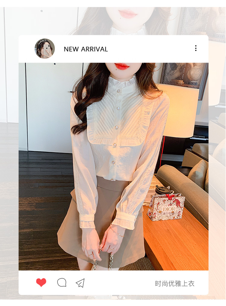 MY16417#立领杏色雪纺衬衫新款女装木耳花边上衣轻熟法式小众女裝貨源服裝批發
