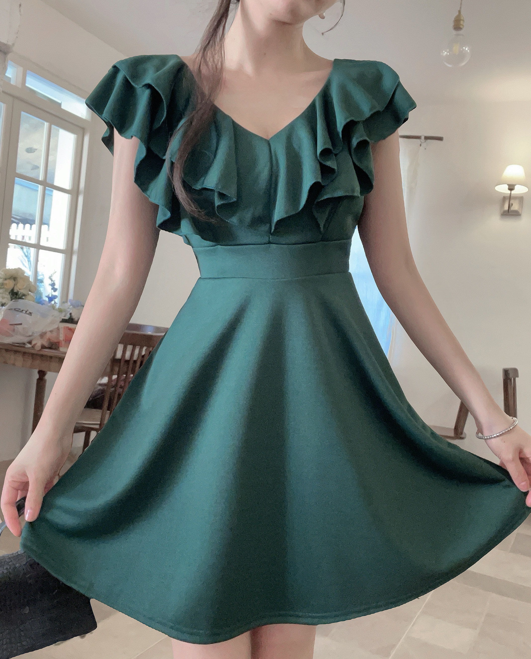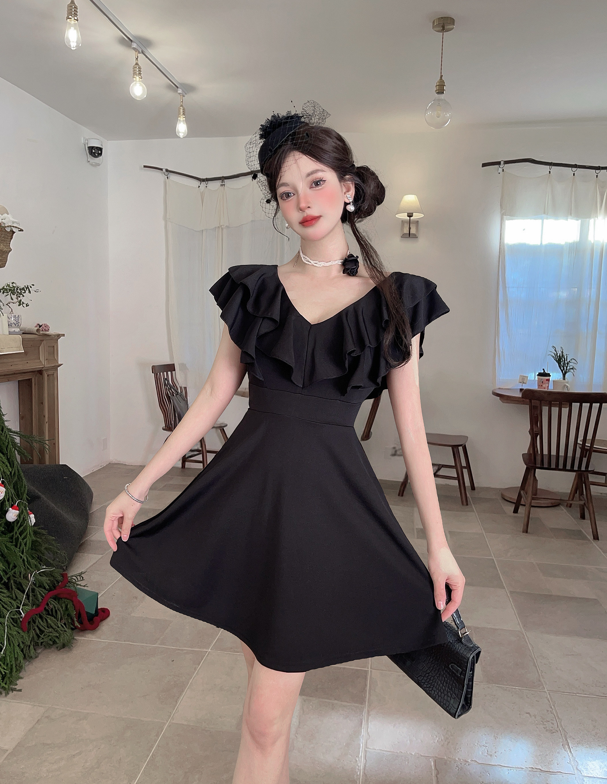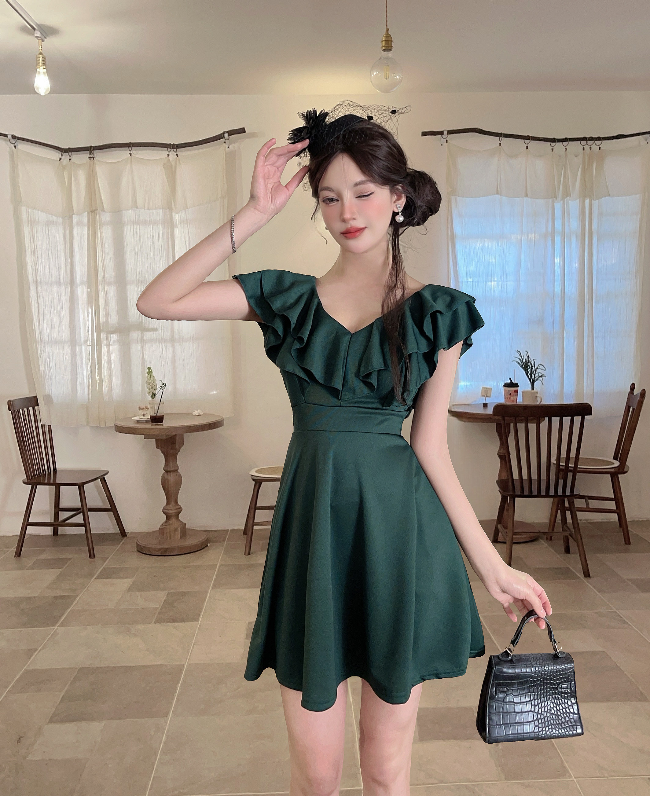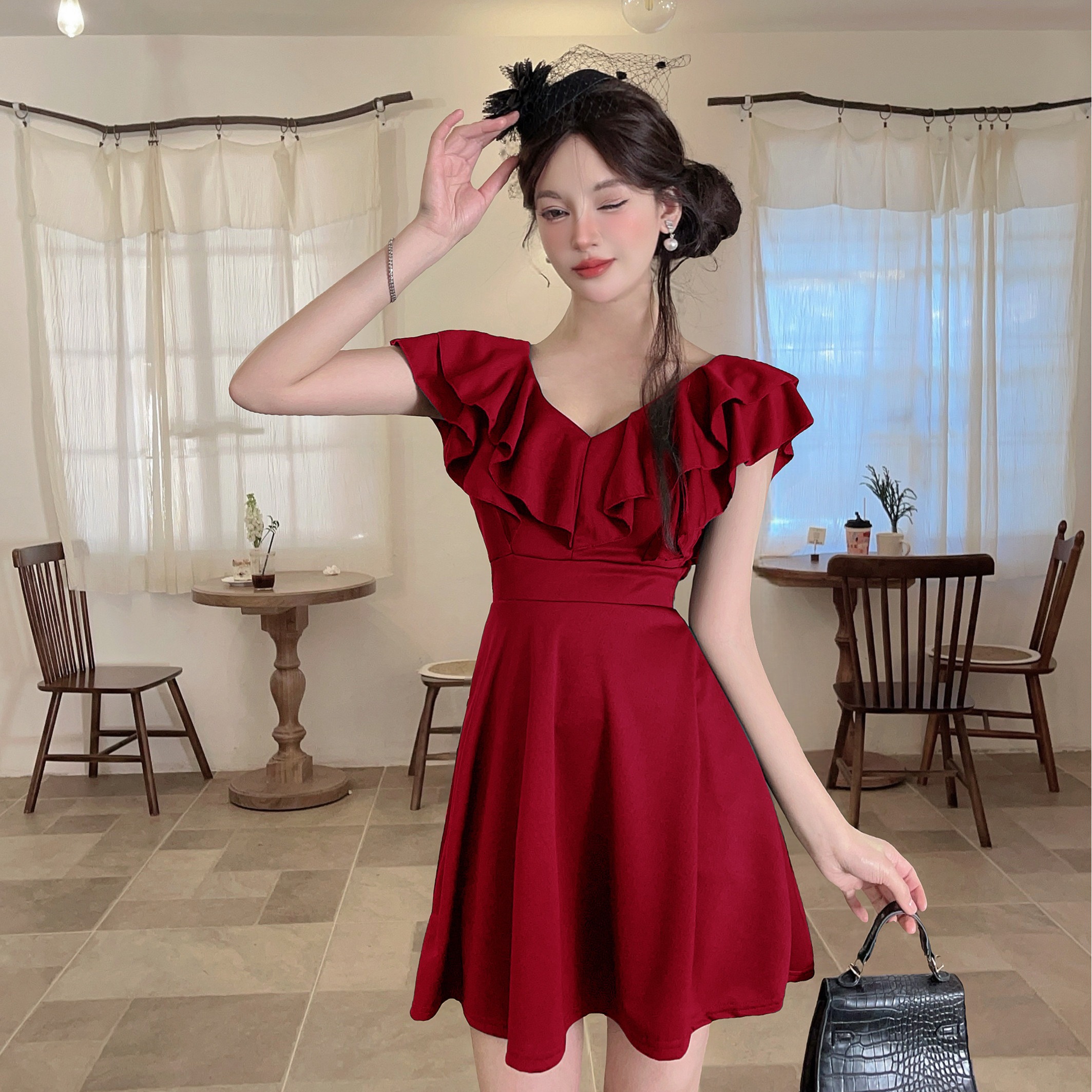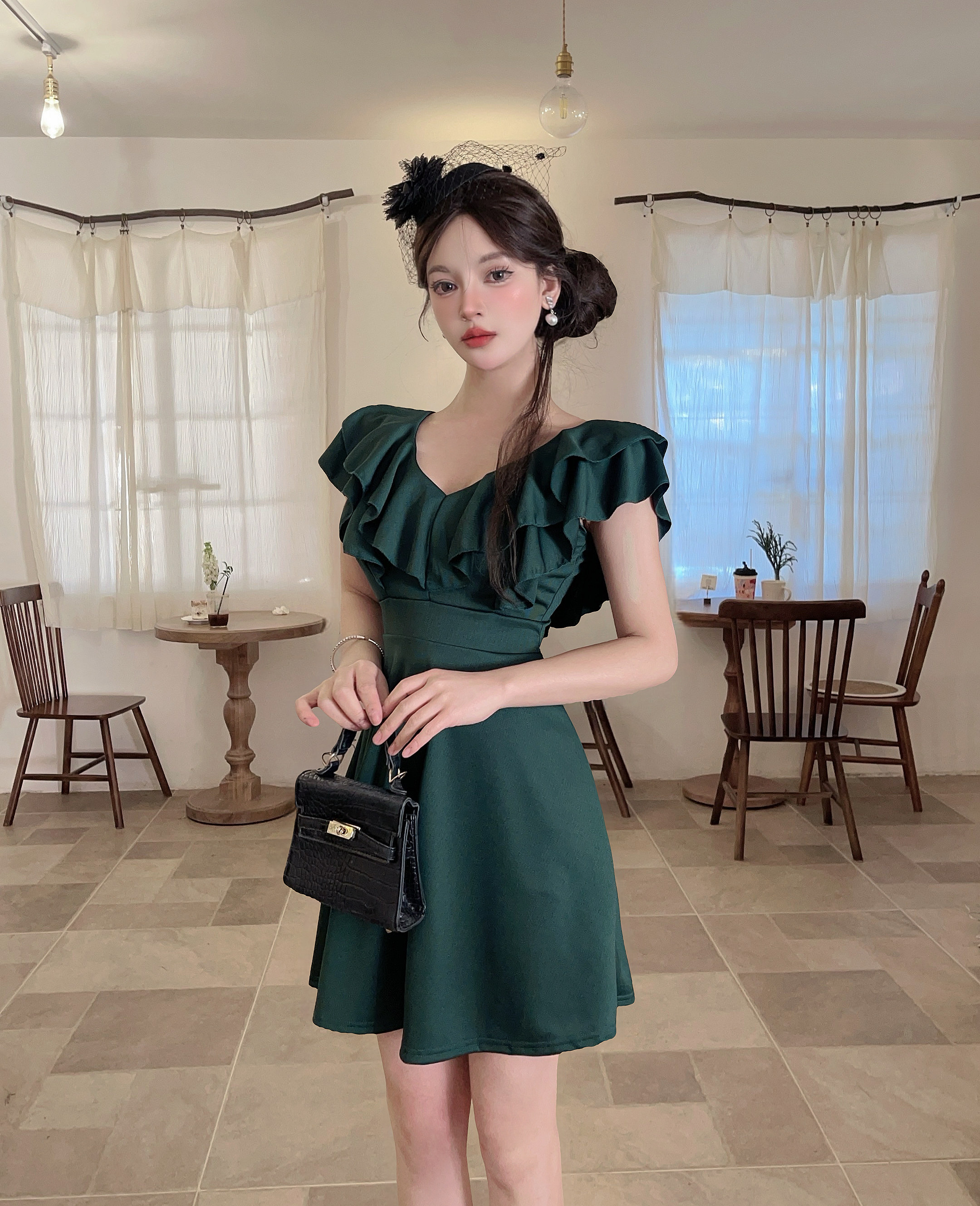 MY16423#法式复古荷叶边 V 领连衣裙女收腰显瘦小个子气质约会小礼裙