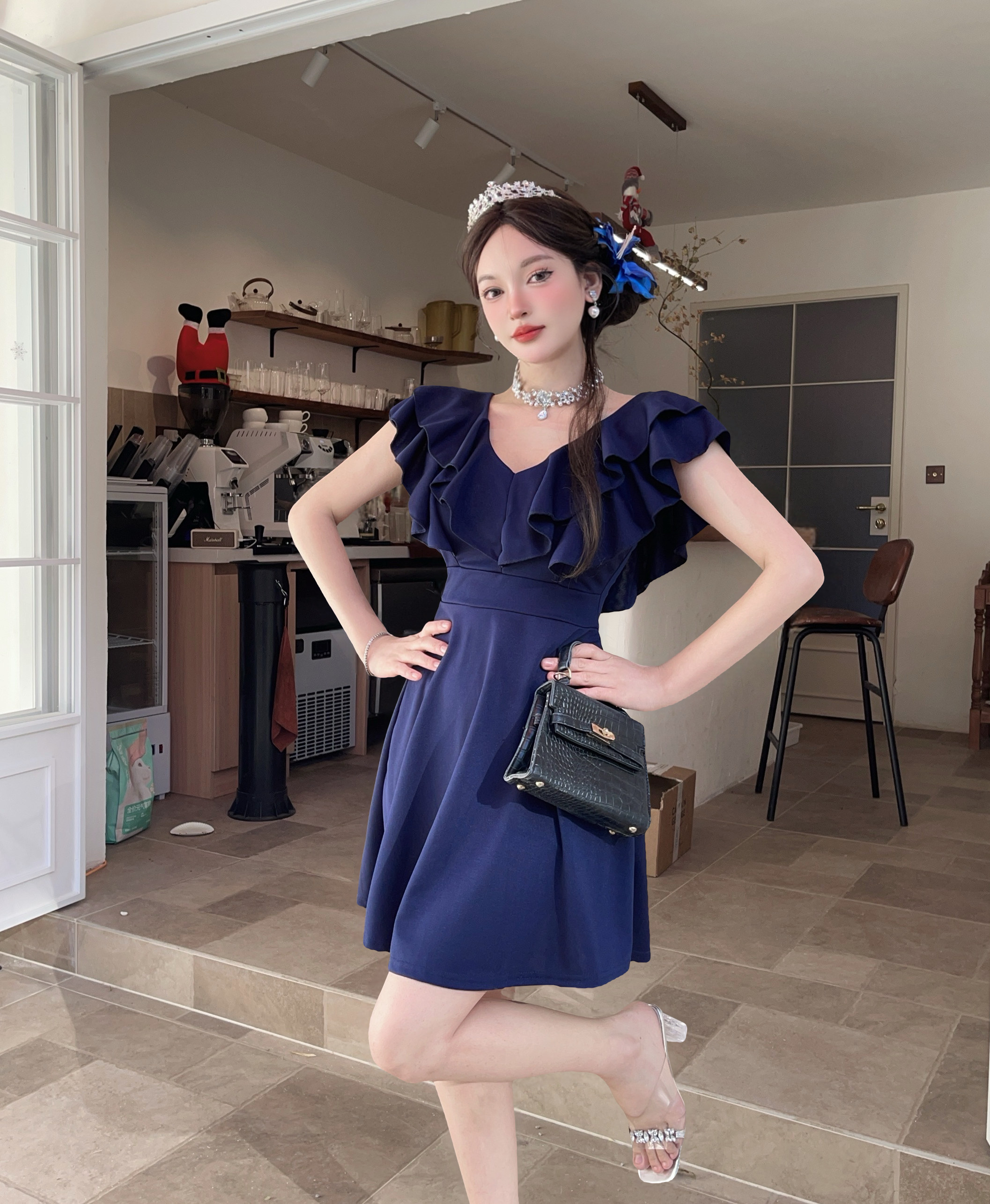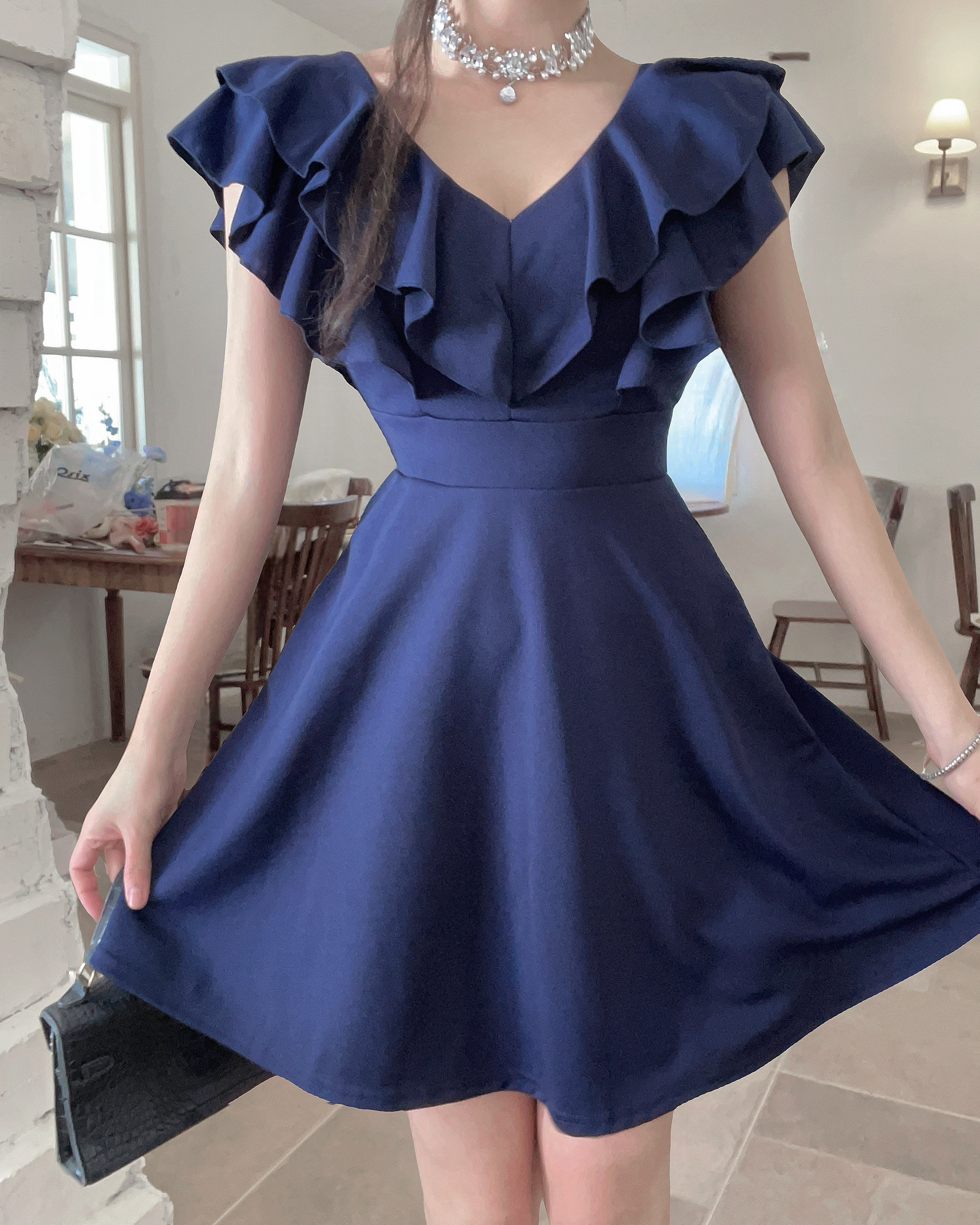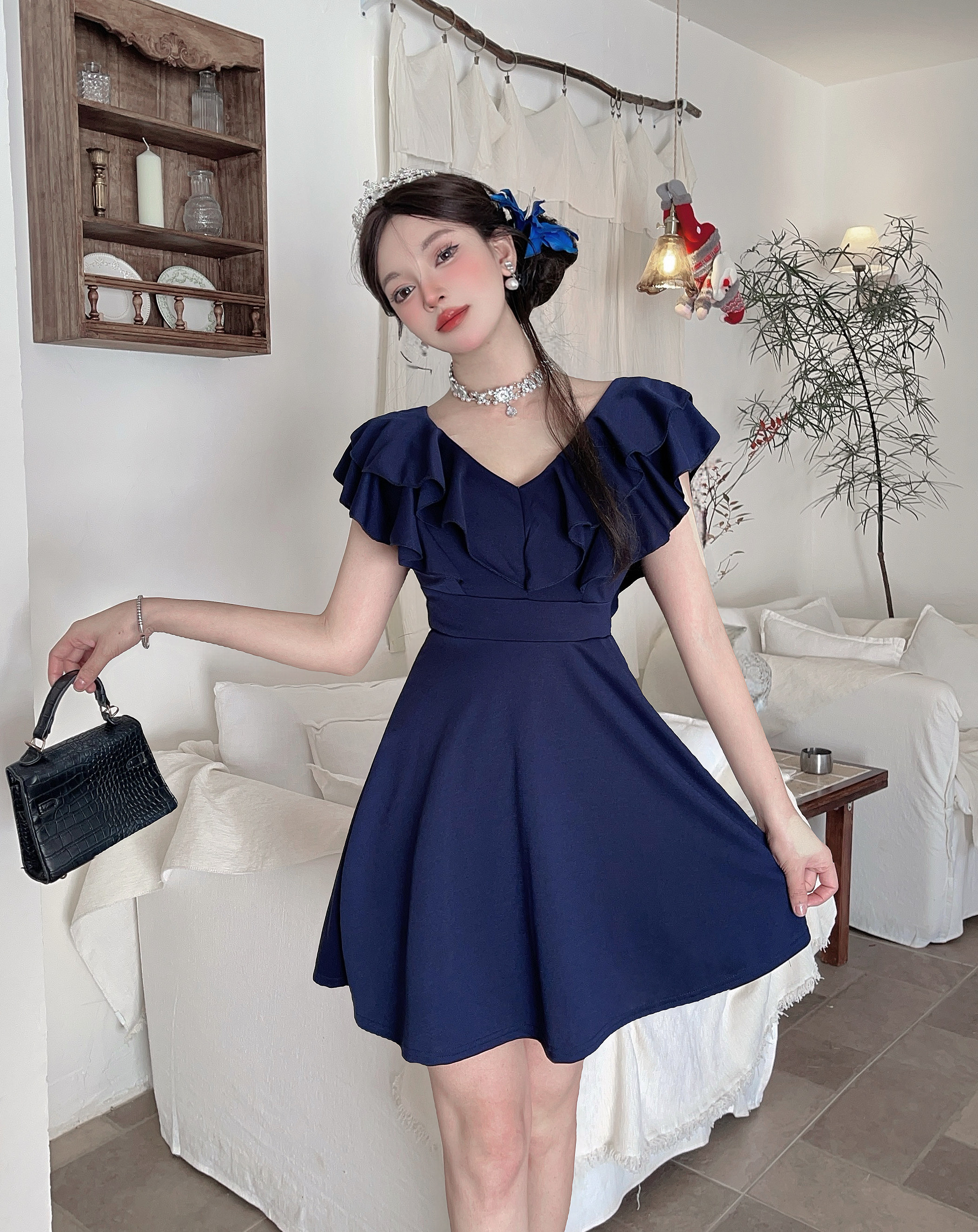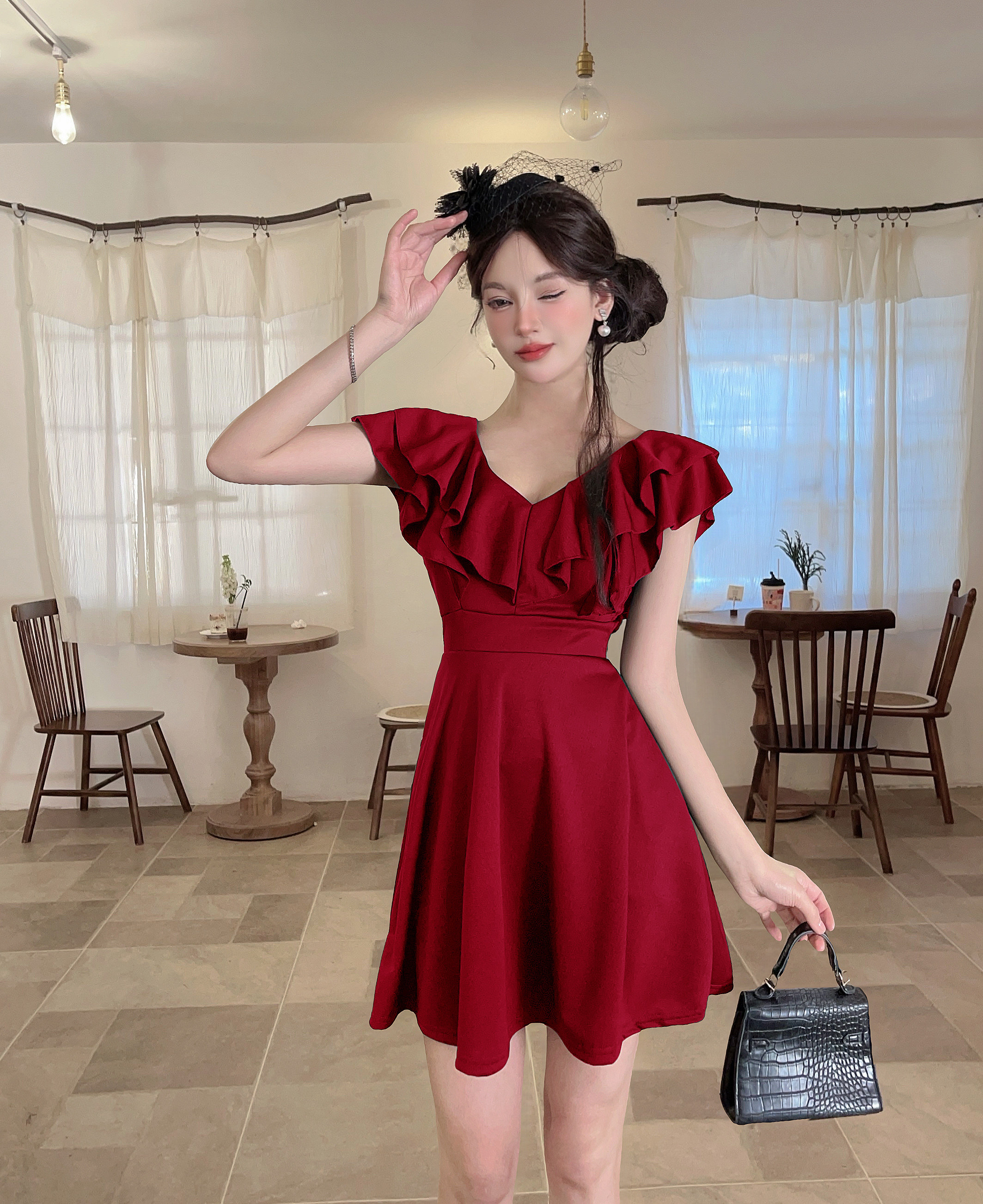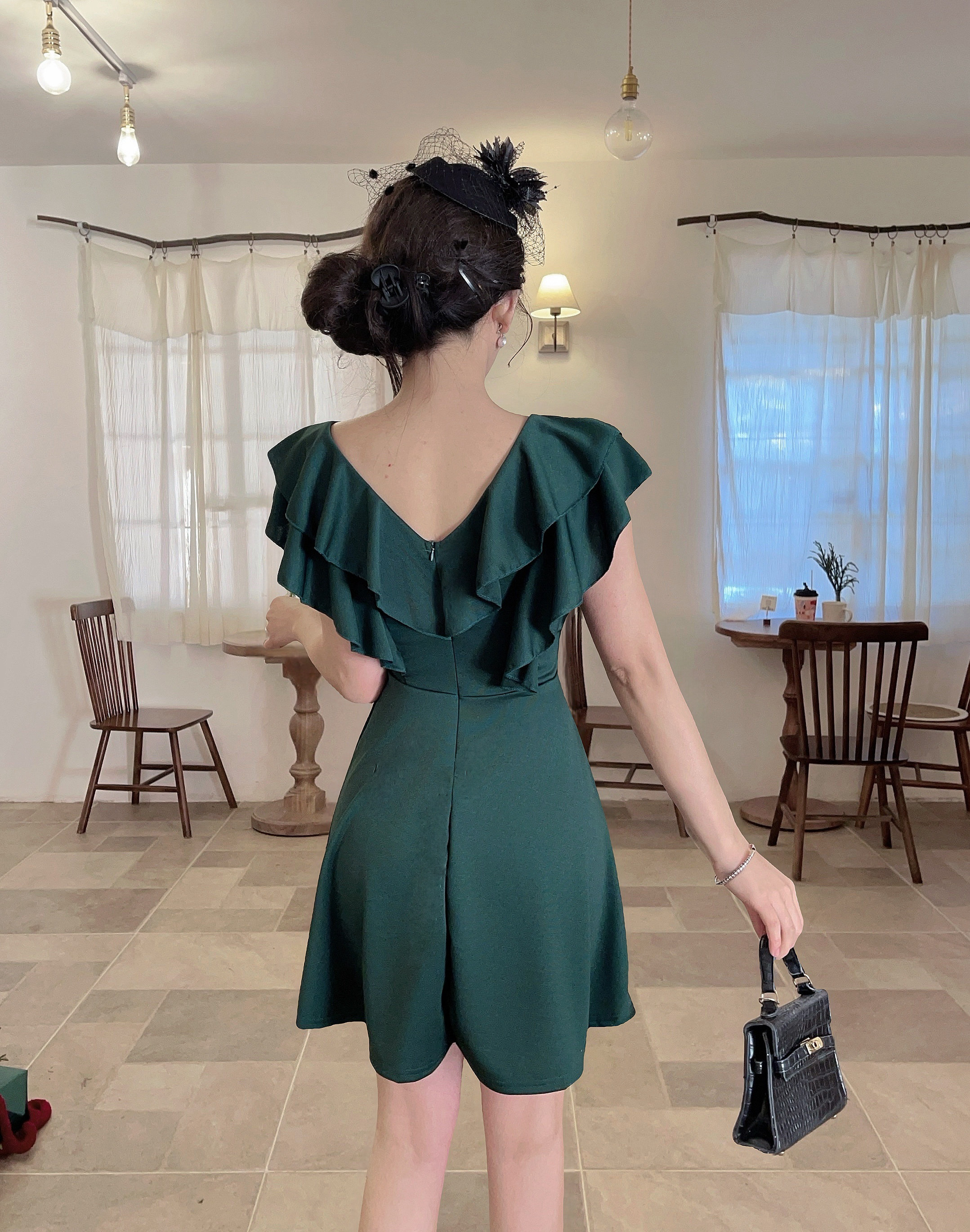 MY16423#法式复古荷叶边 V 领连衣裙女收腰显瘦小个子气质约会小礼裙