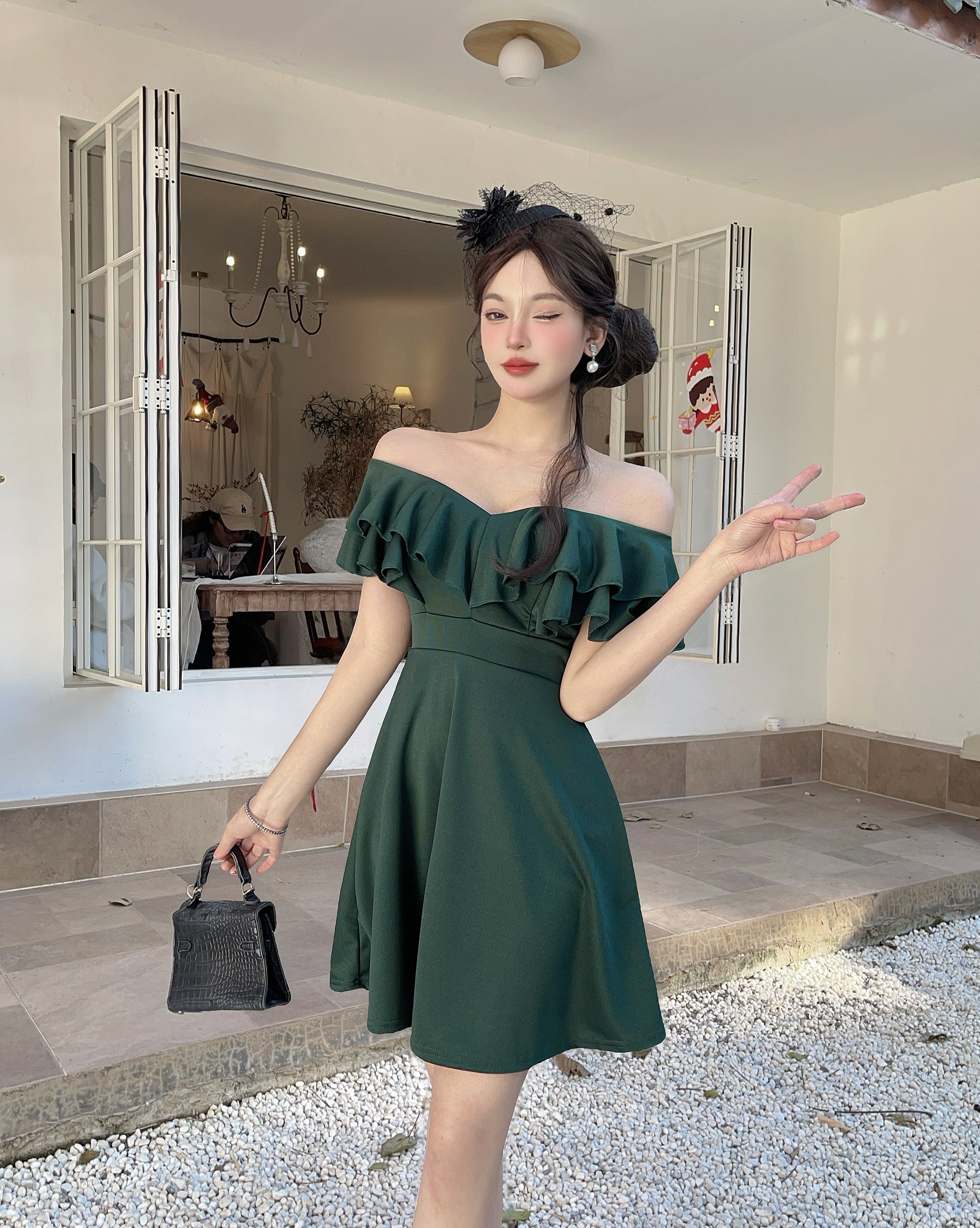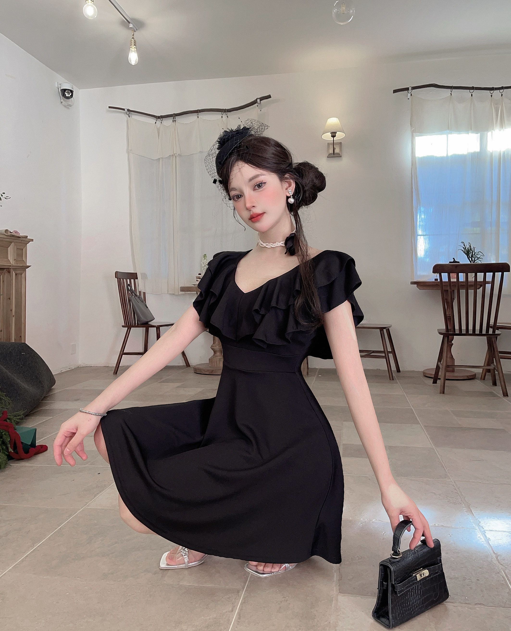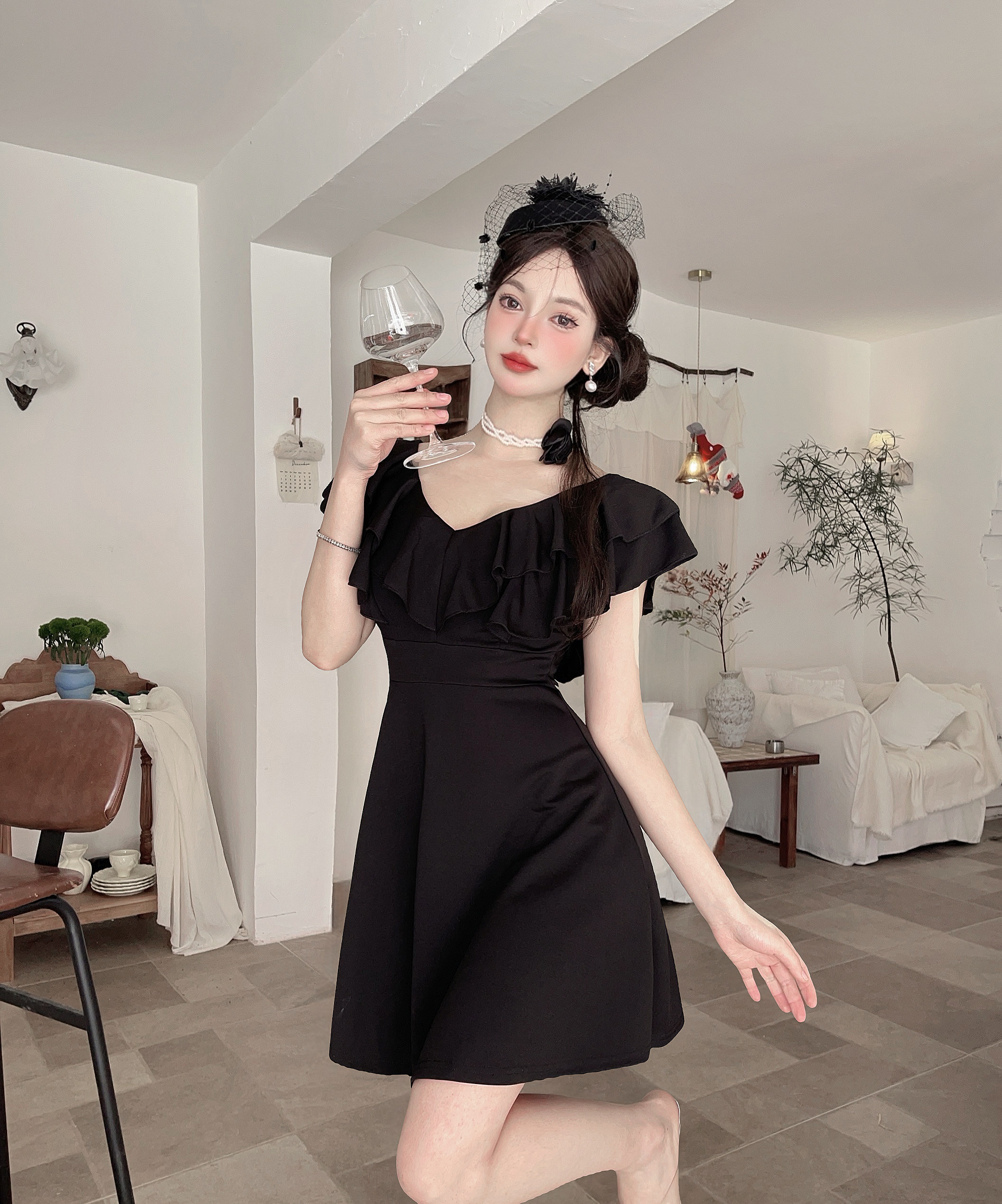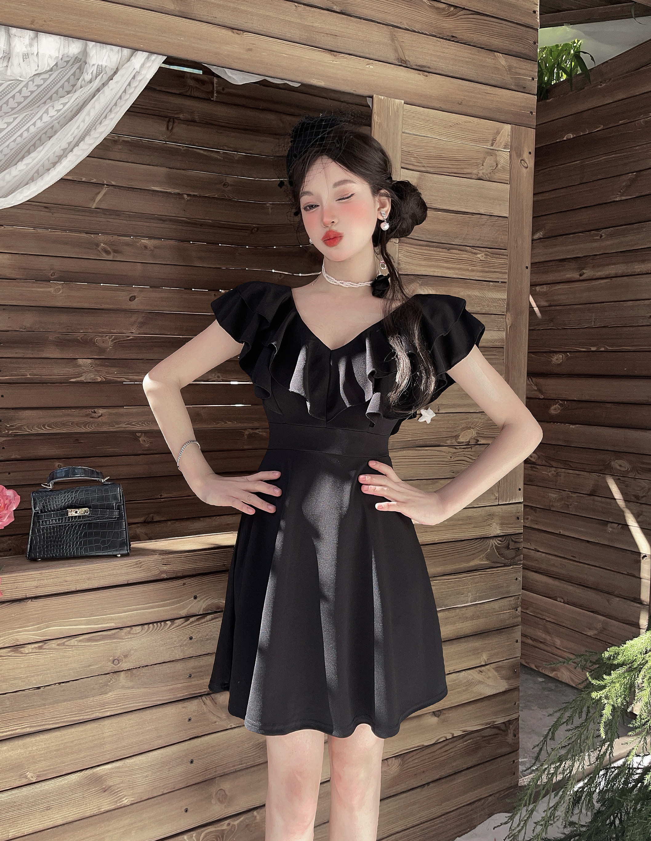 MY16423#法式复古荷叶边 V 领连衣裙女收腰显瘦小个子气质约会小礼裙