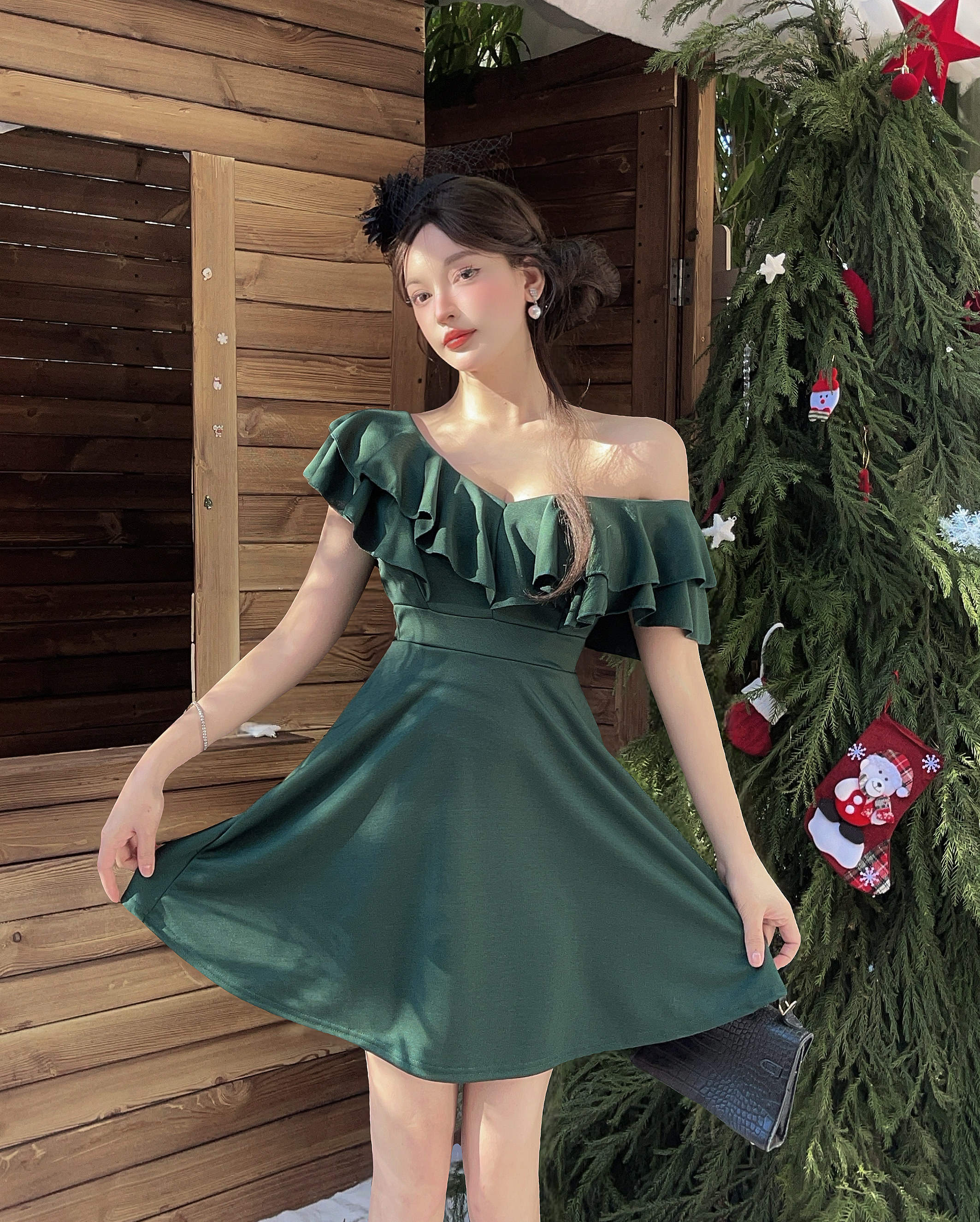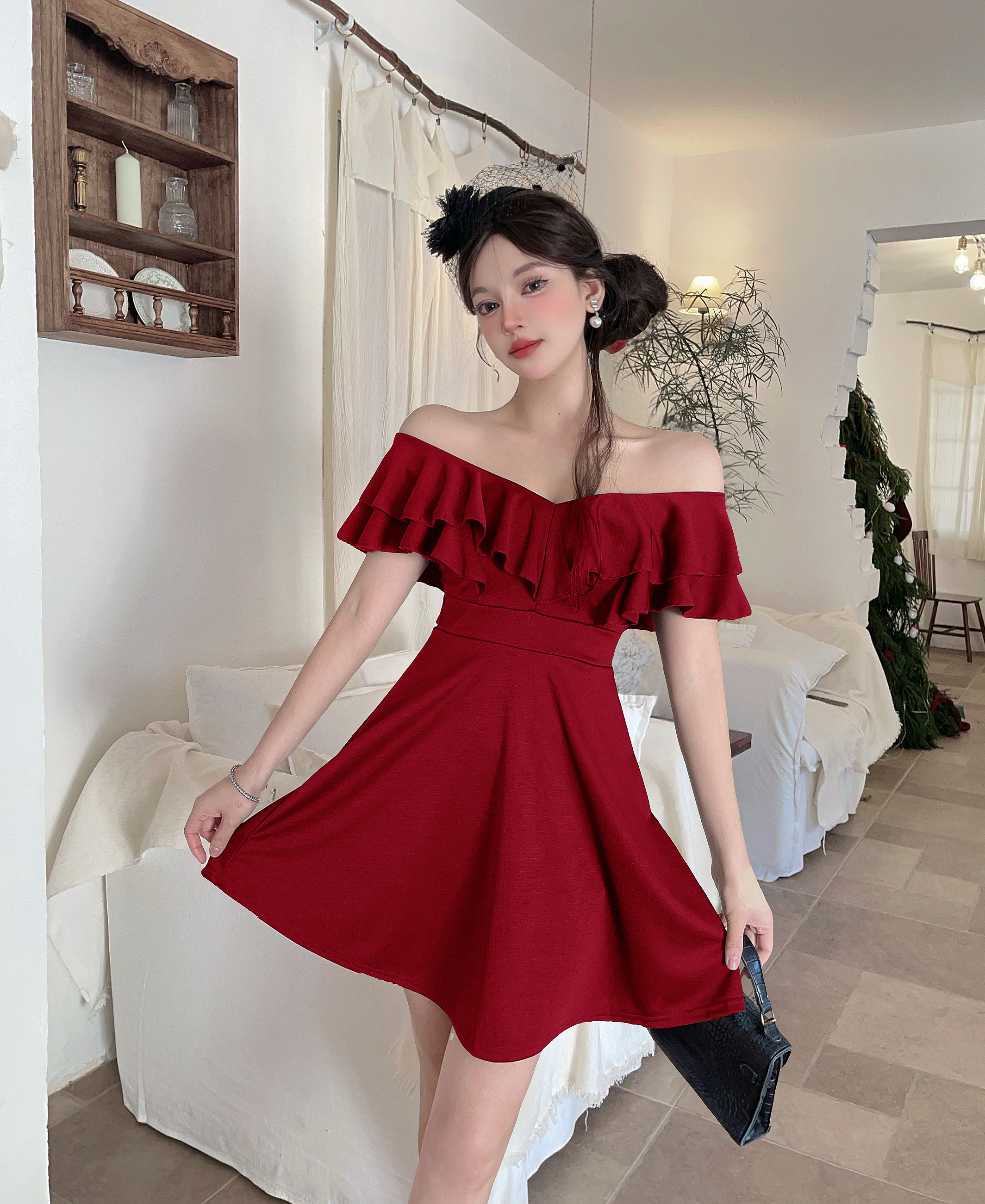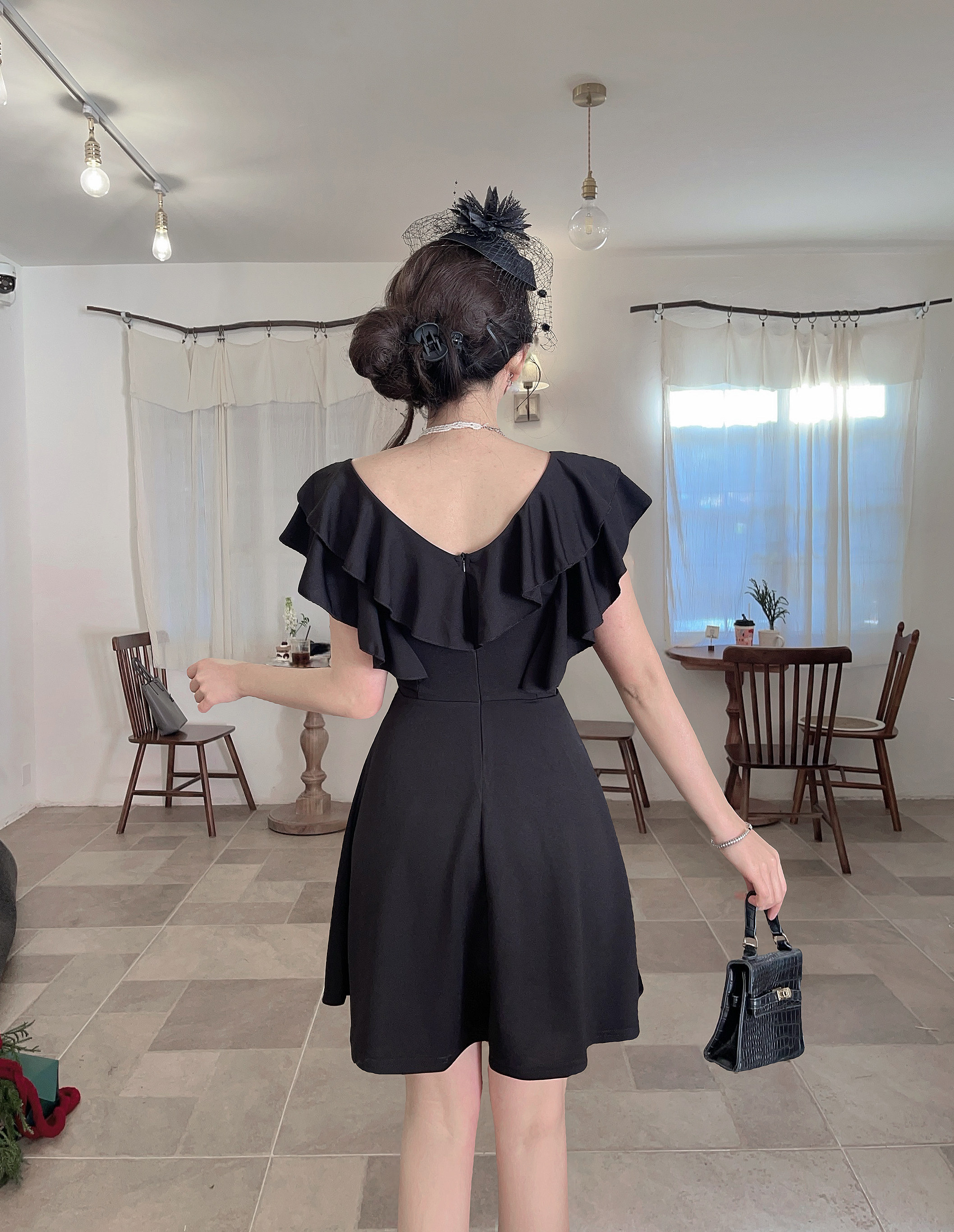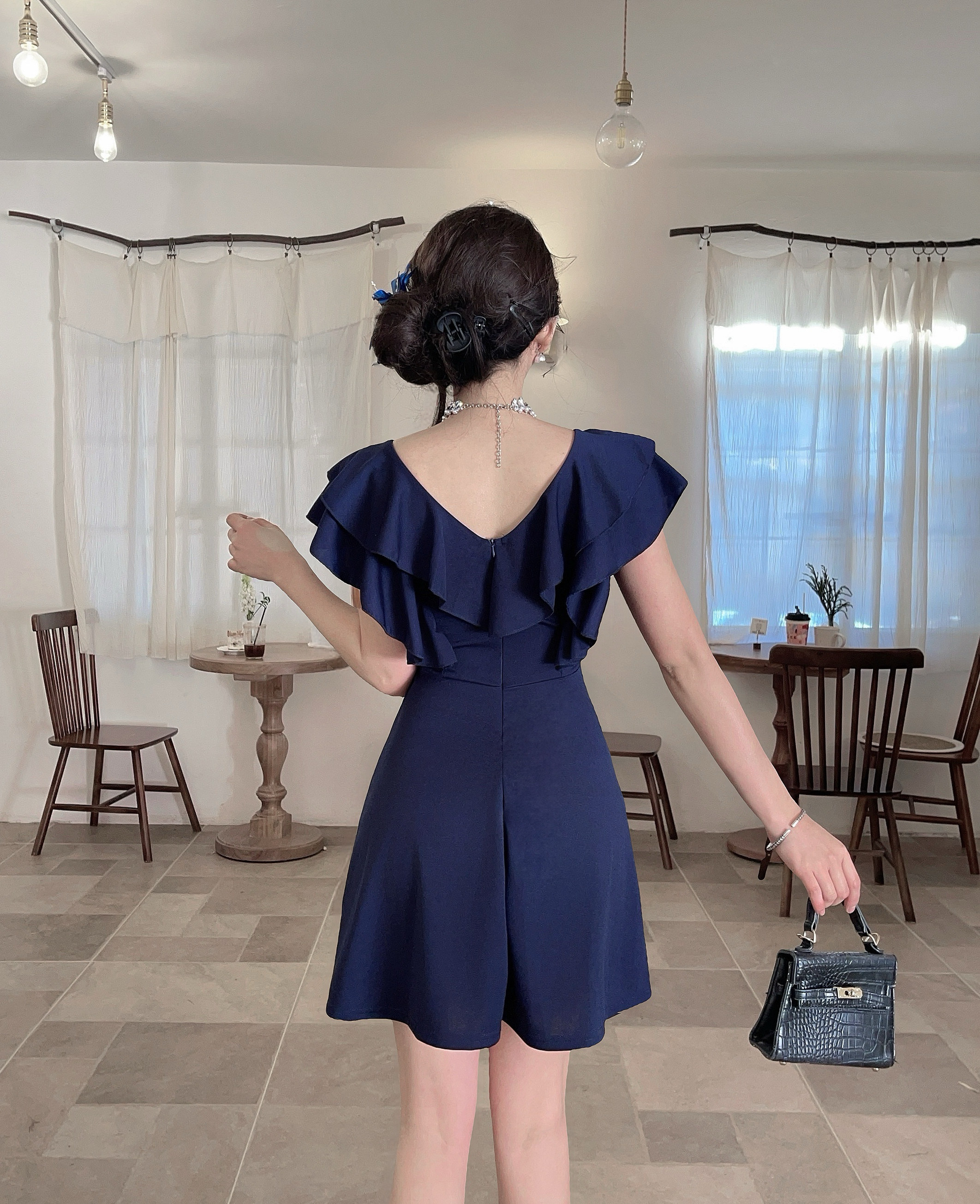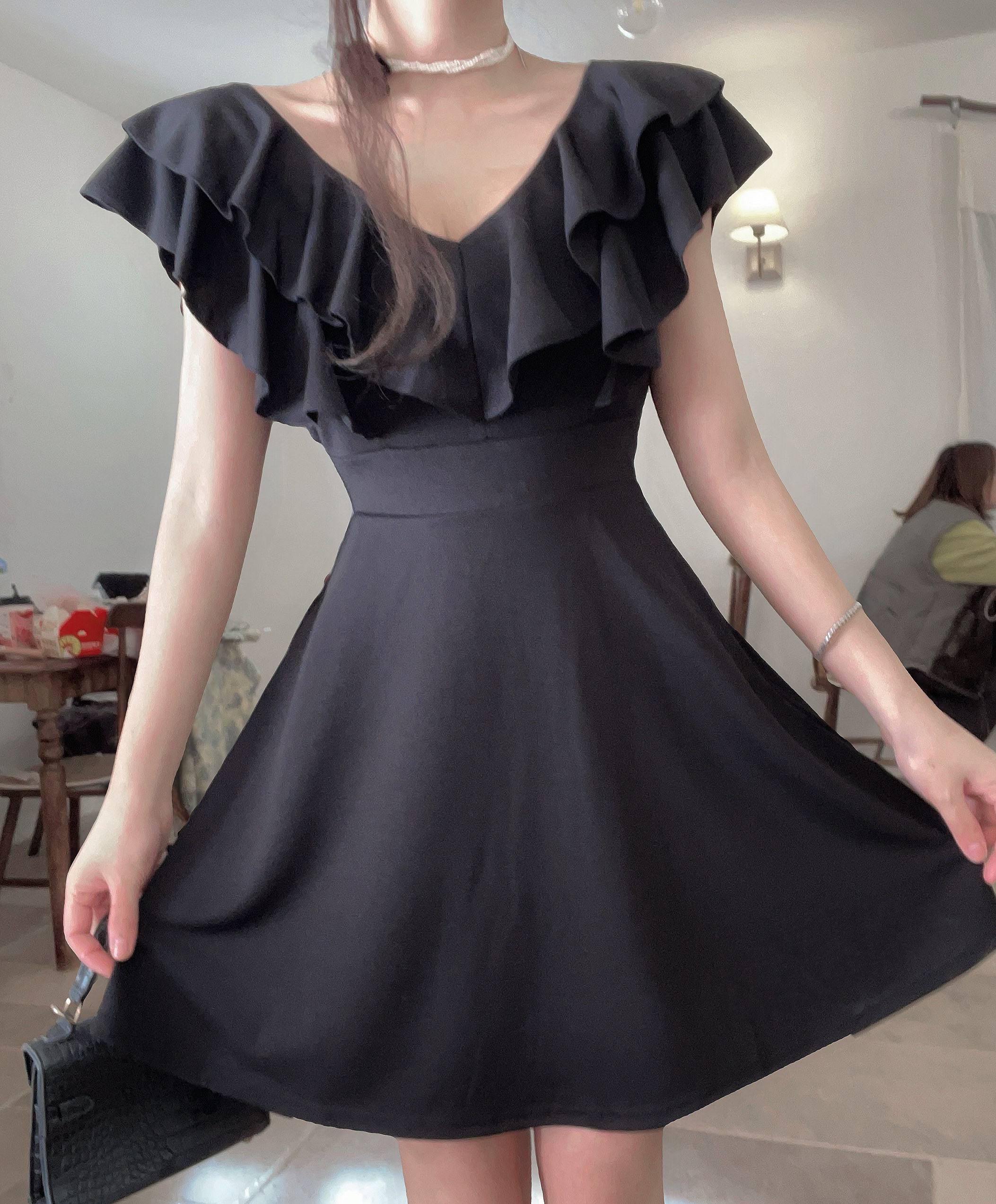 MY16423#法式复古荷叶边 V 领连衣裙女收腰显瘦小个子气质约会小礼裙