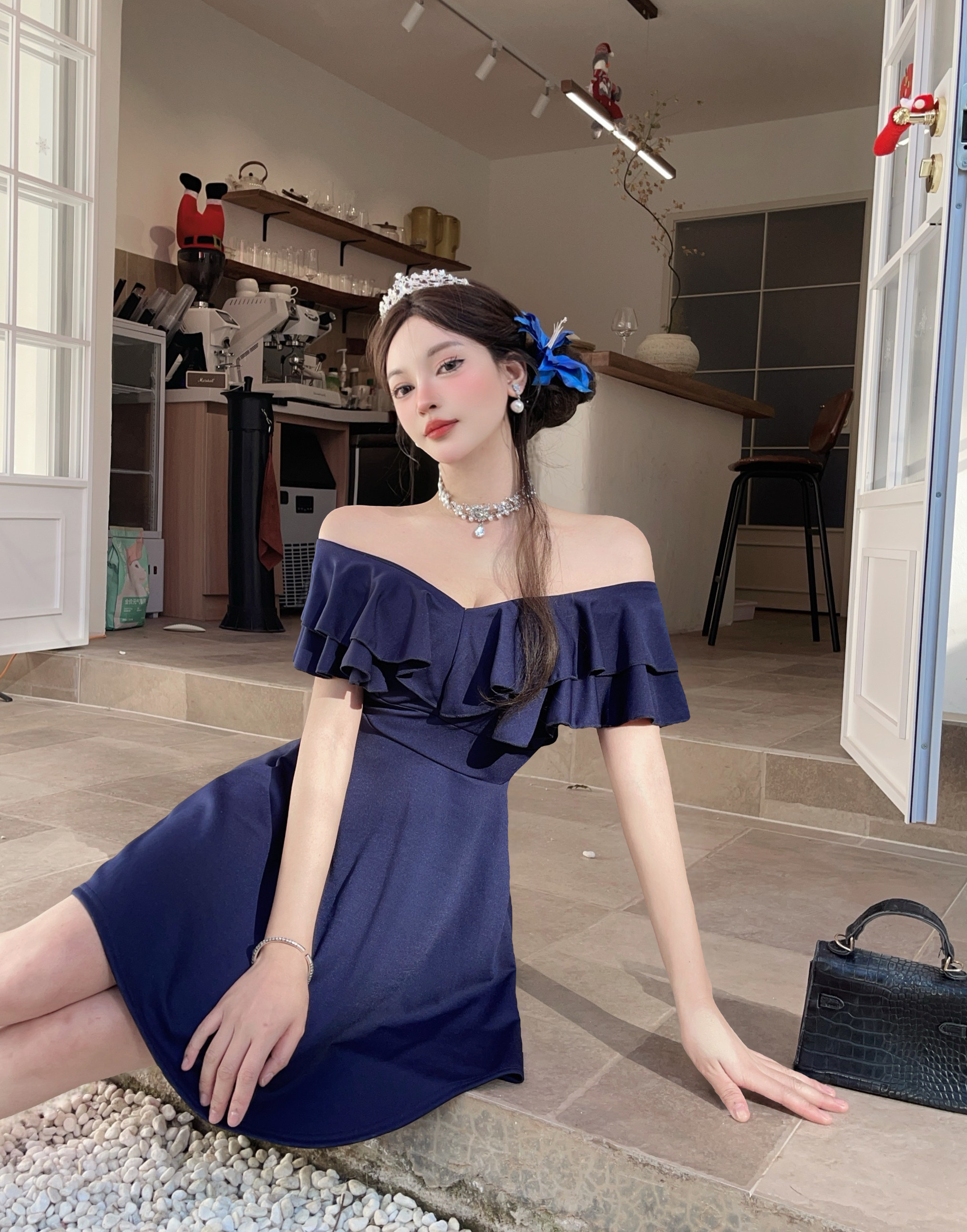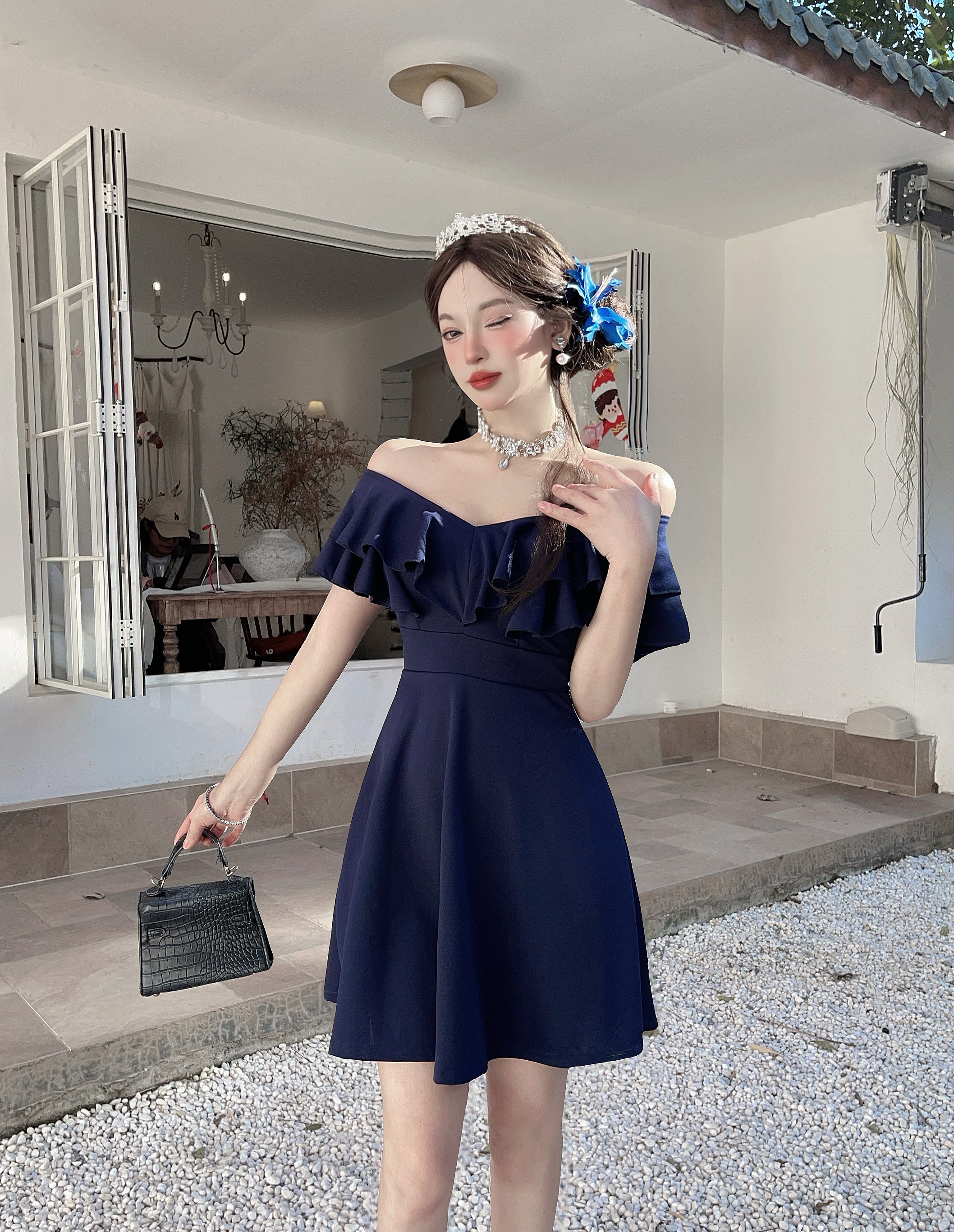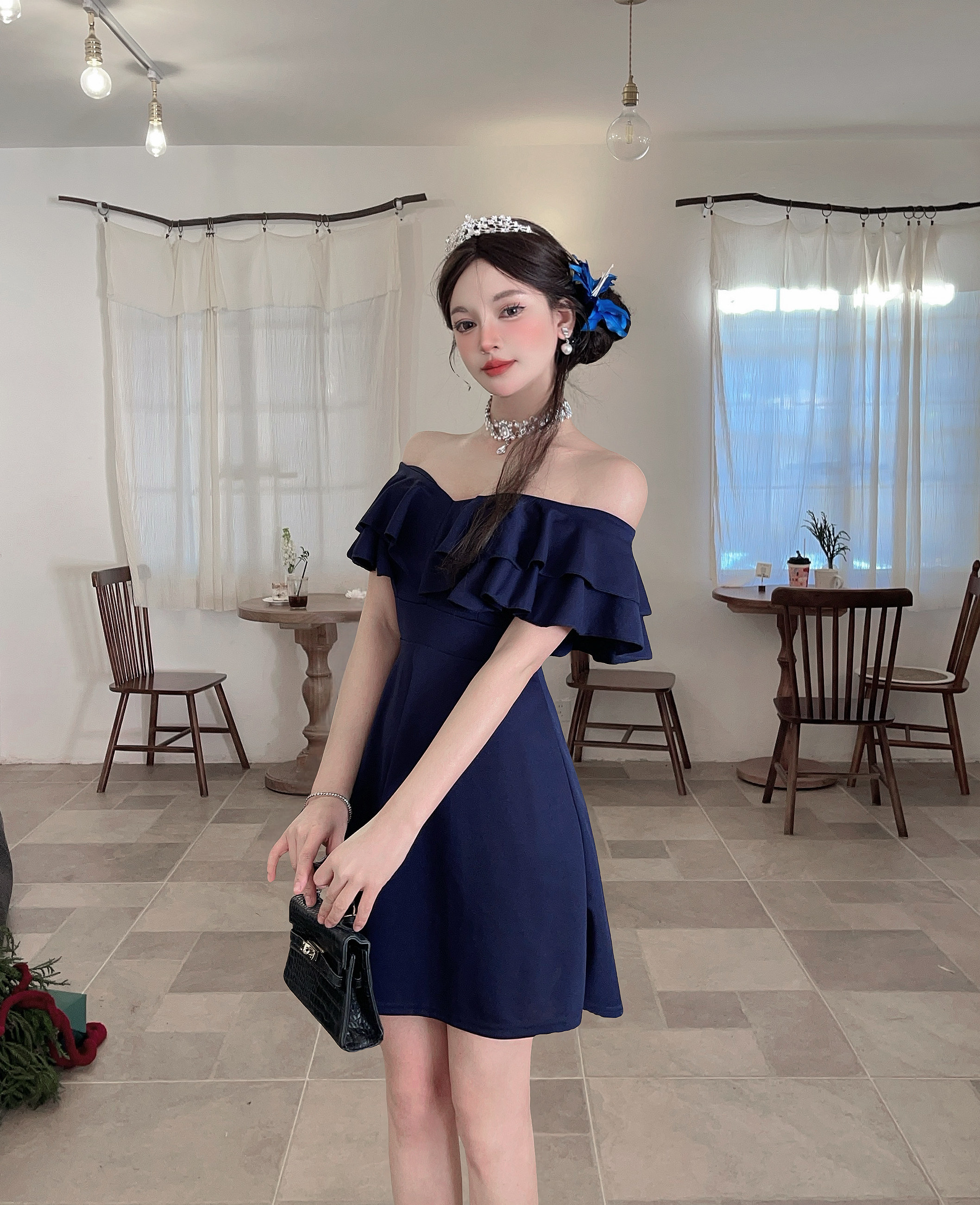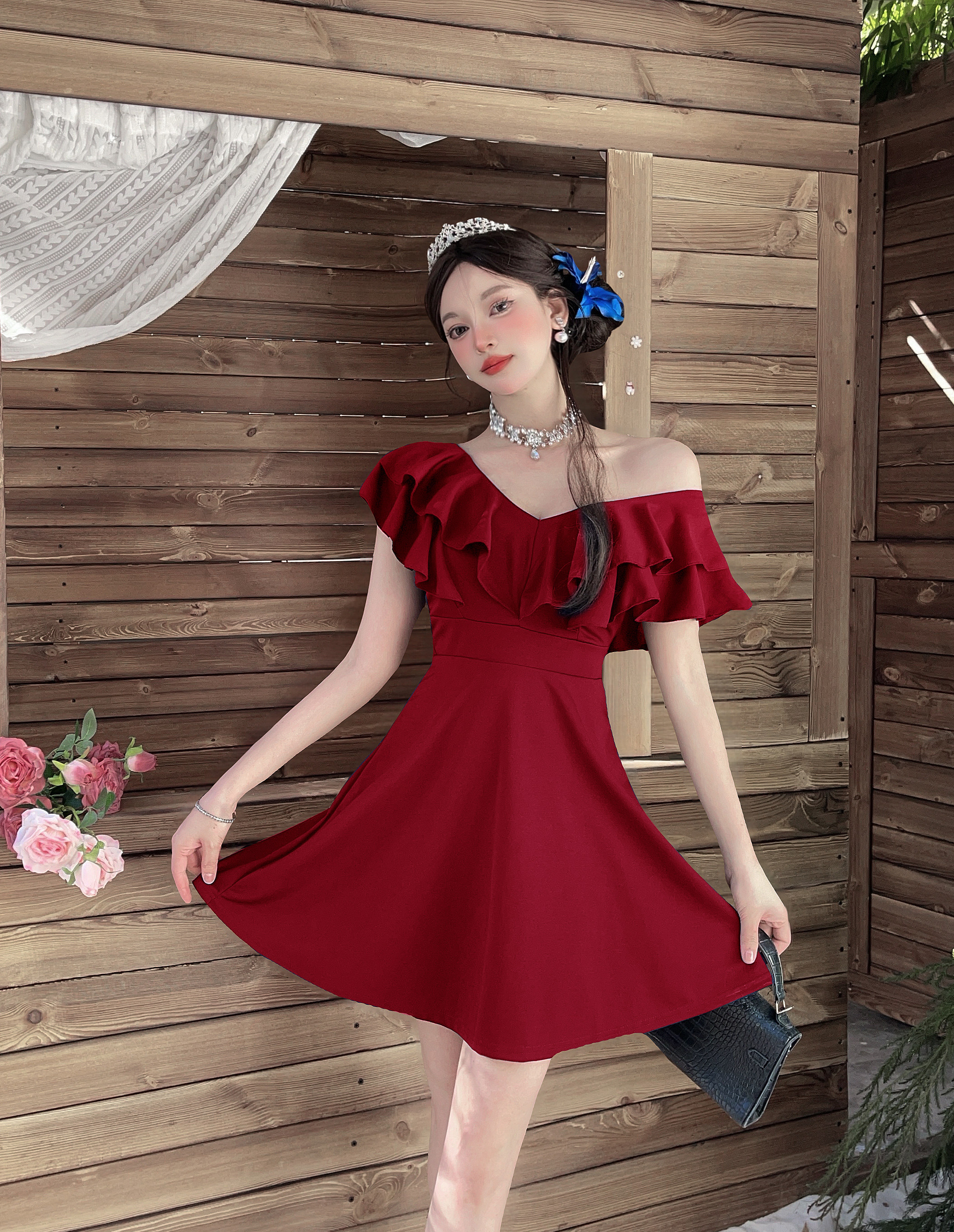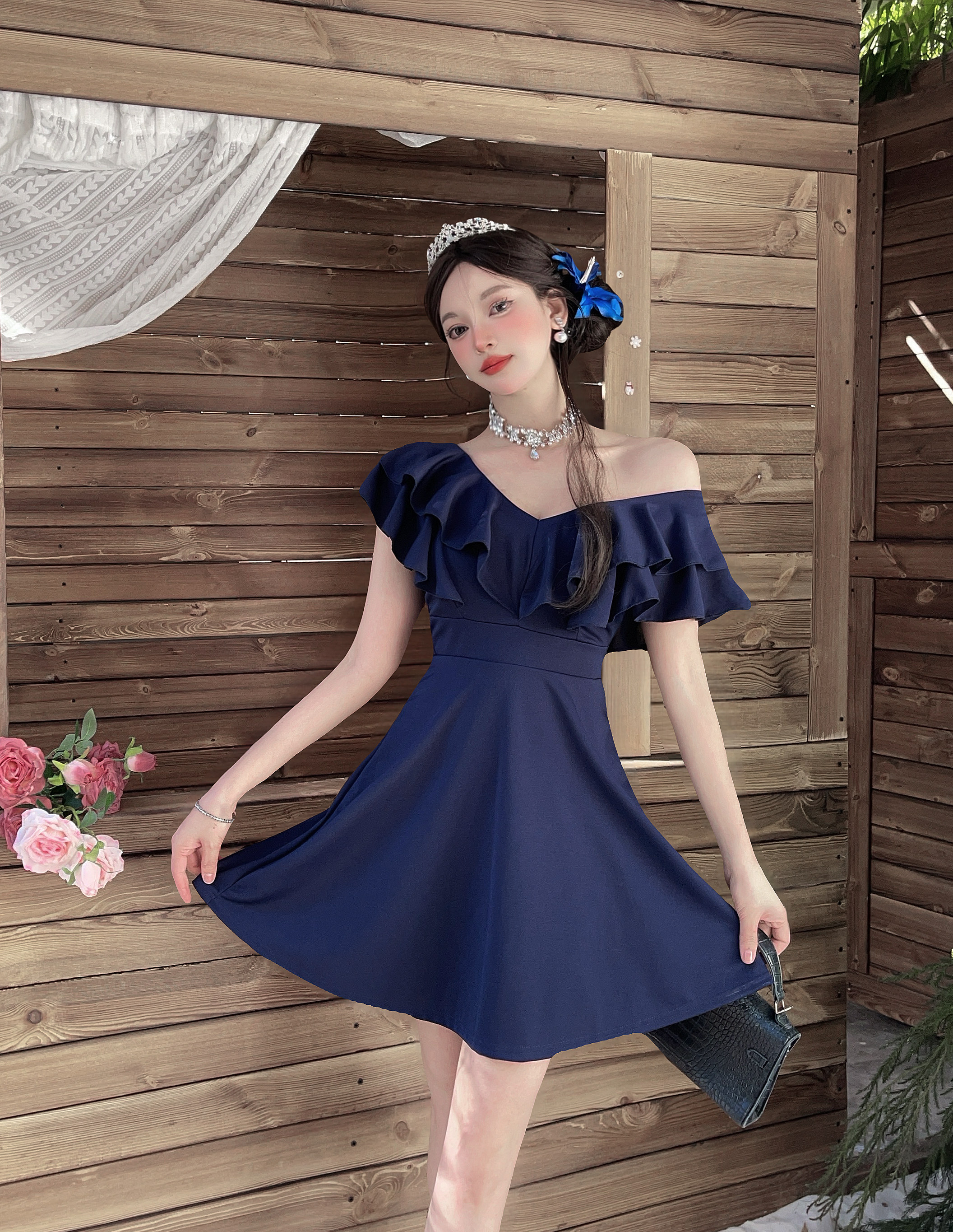 MY16423#法式复古荷叶边 V 领连衣裙女收腰显瘦小个子气质约会小礼裙