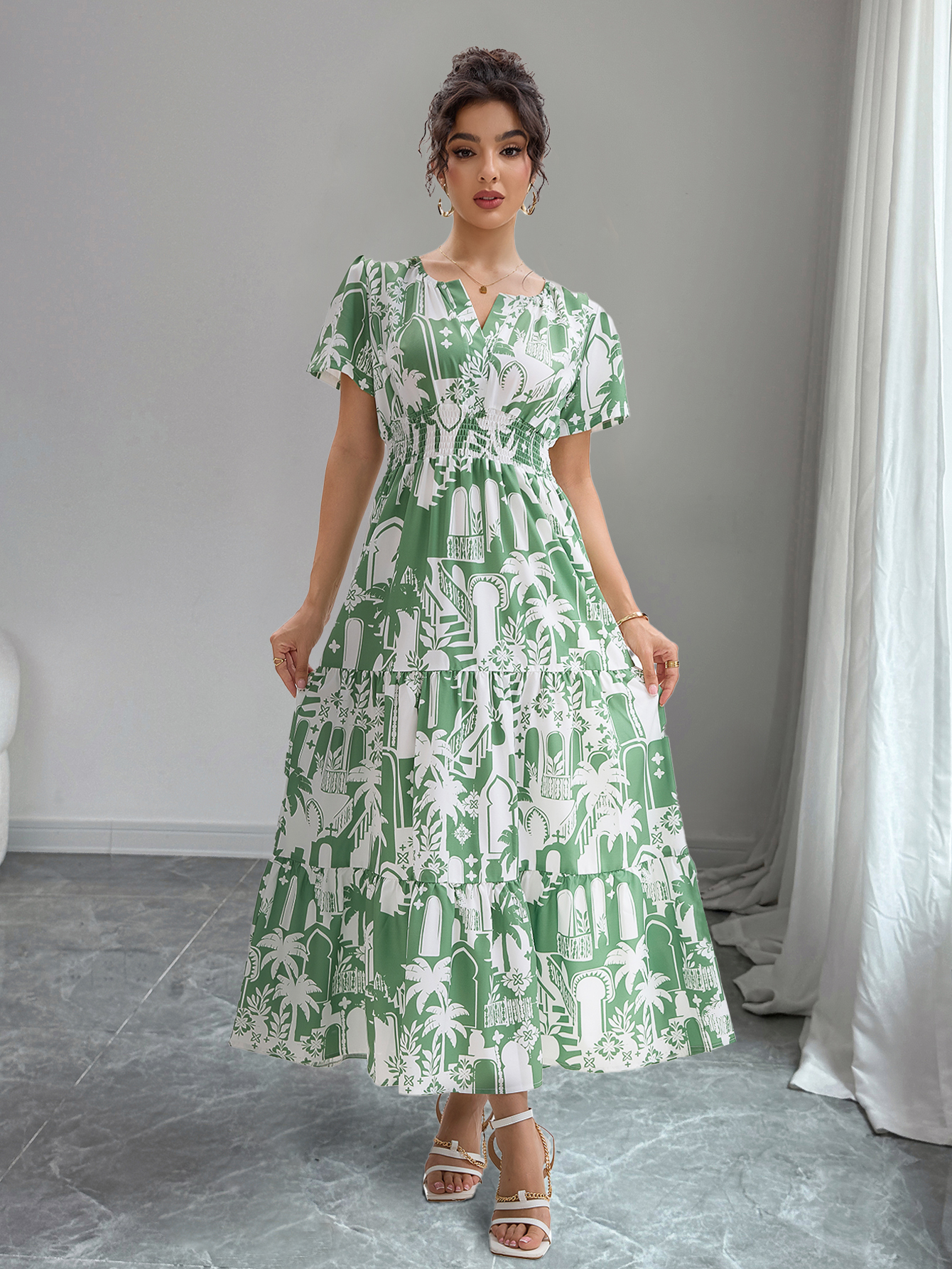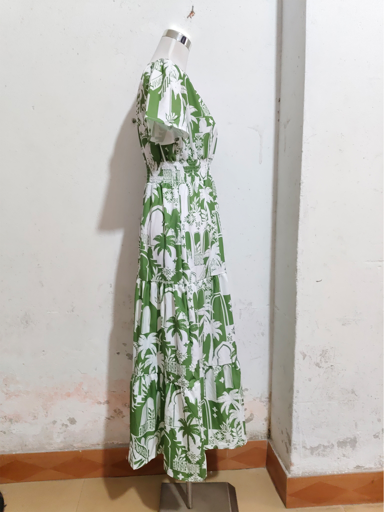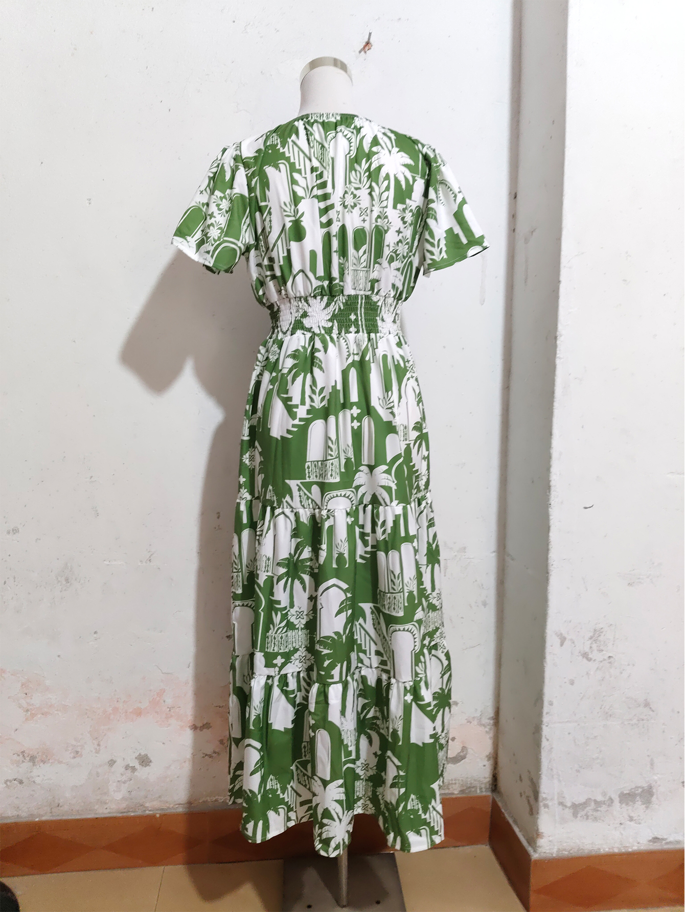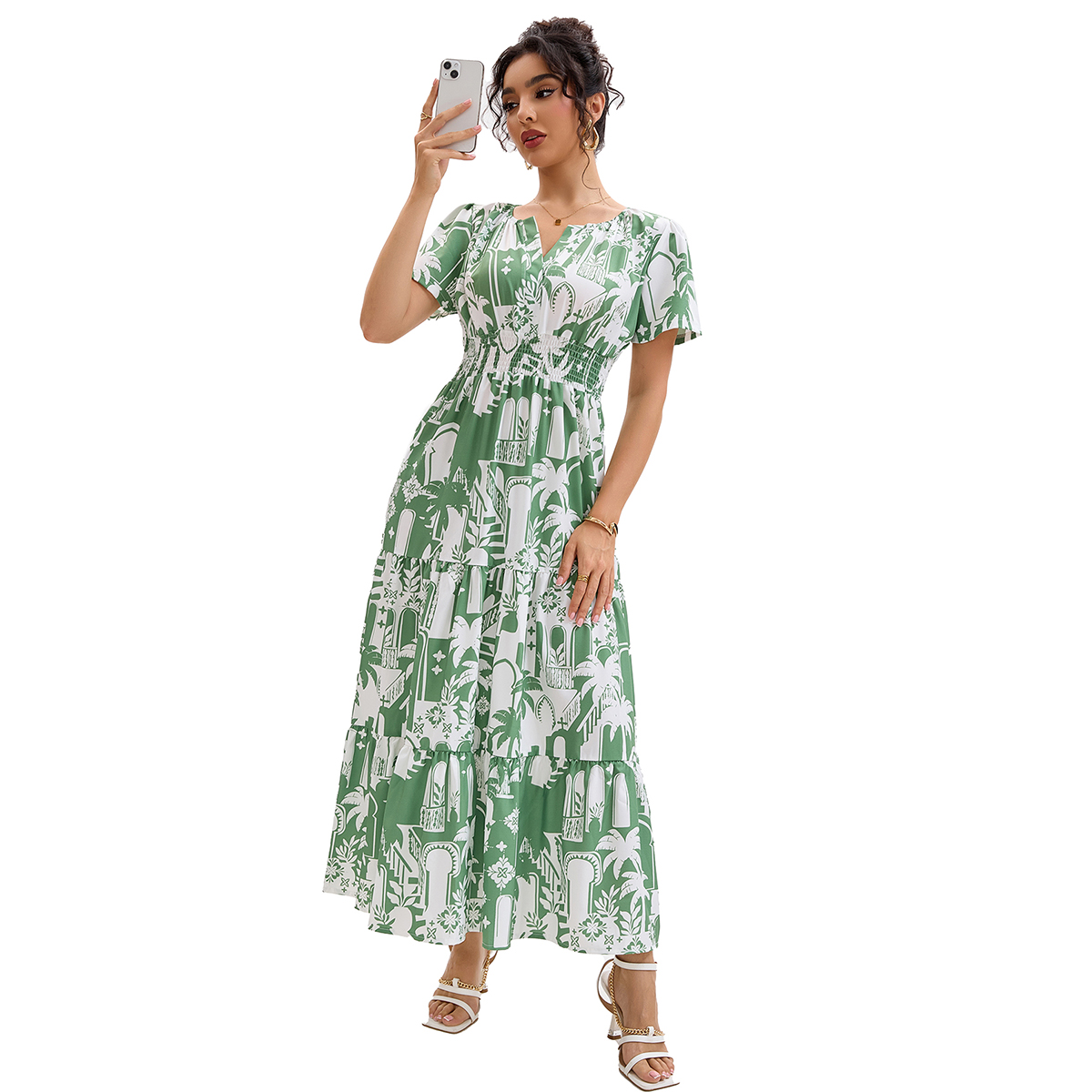 MY16424#女士花卉印花中长连衣裙V领短袖波西米亚度假沙滩裙