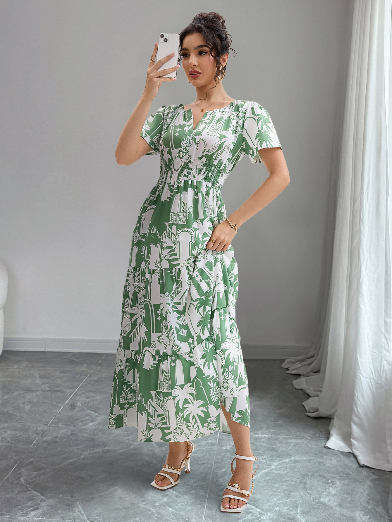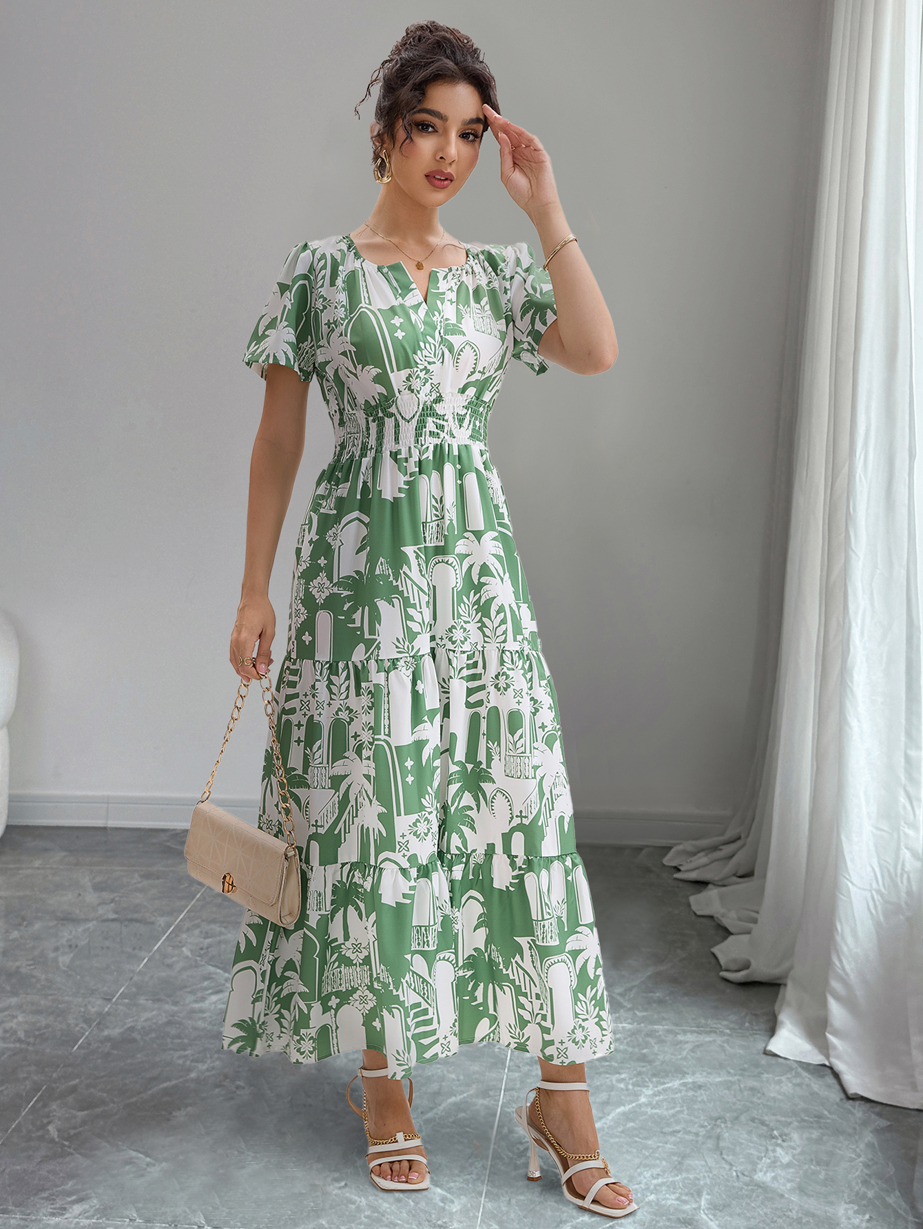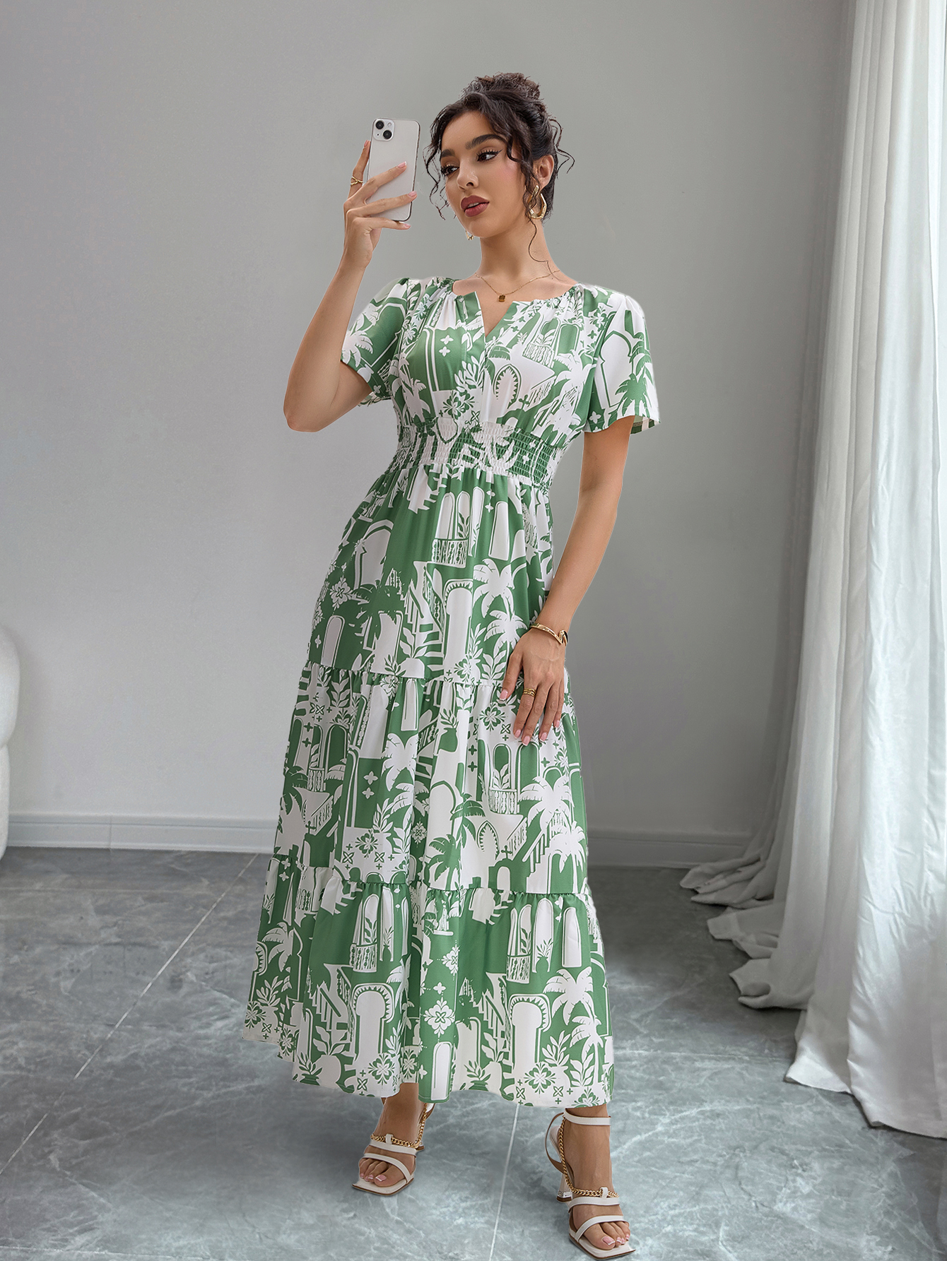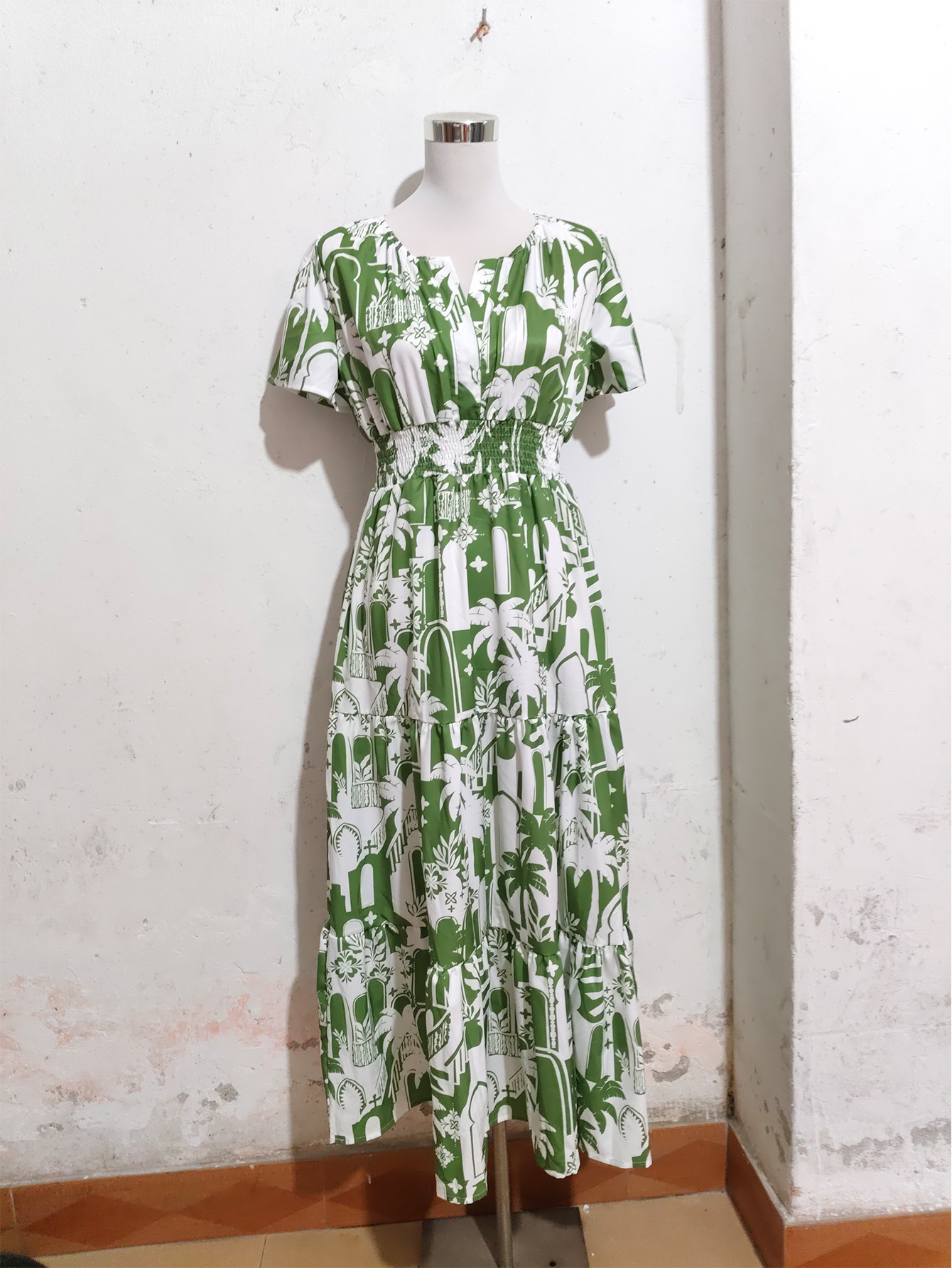 MY16424#女士花卉印花中长连衣裙V领短袖波西米亚度假沙滩裙