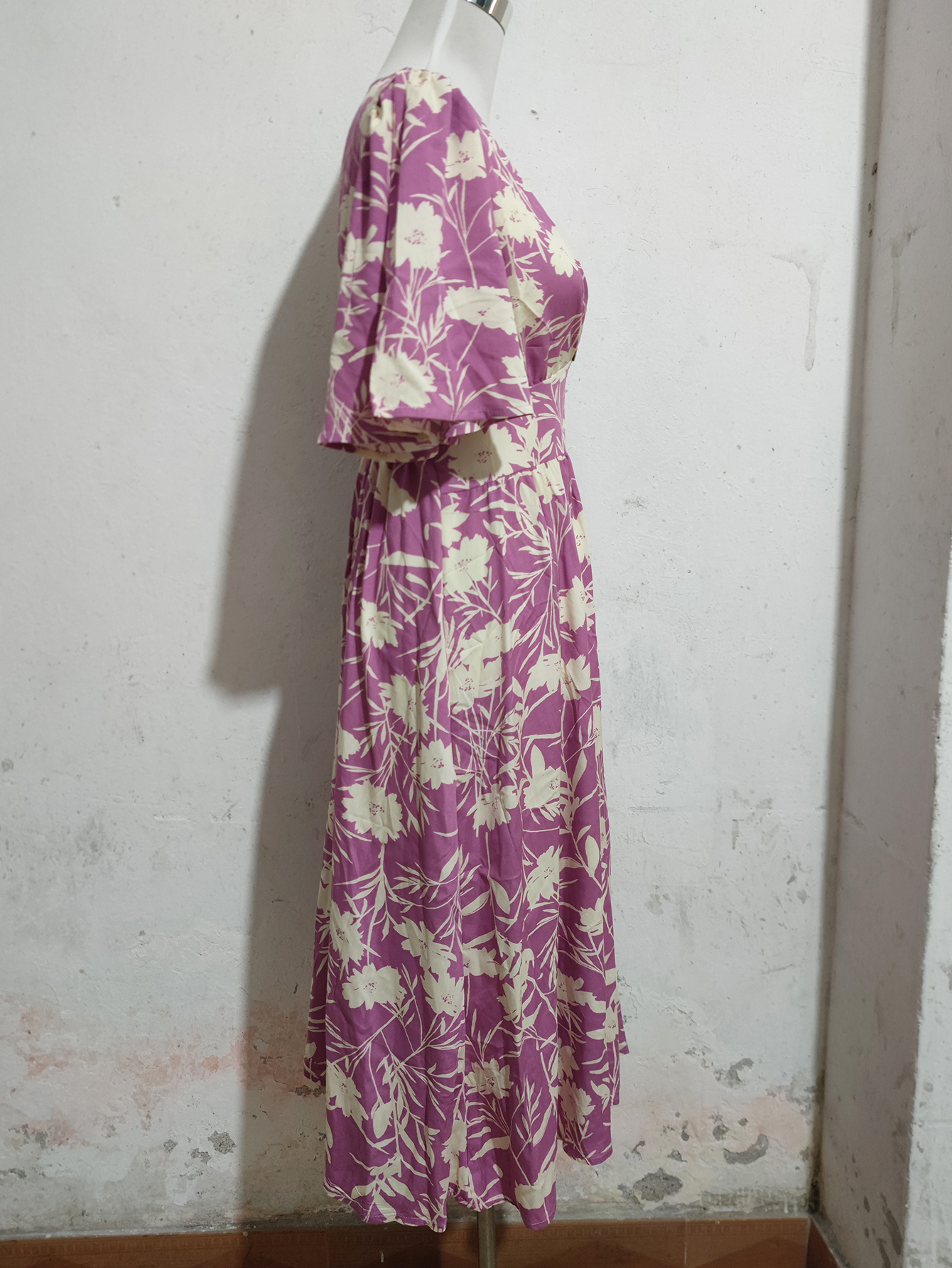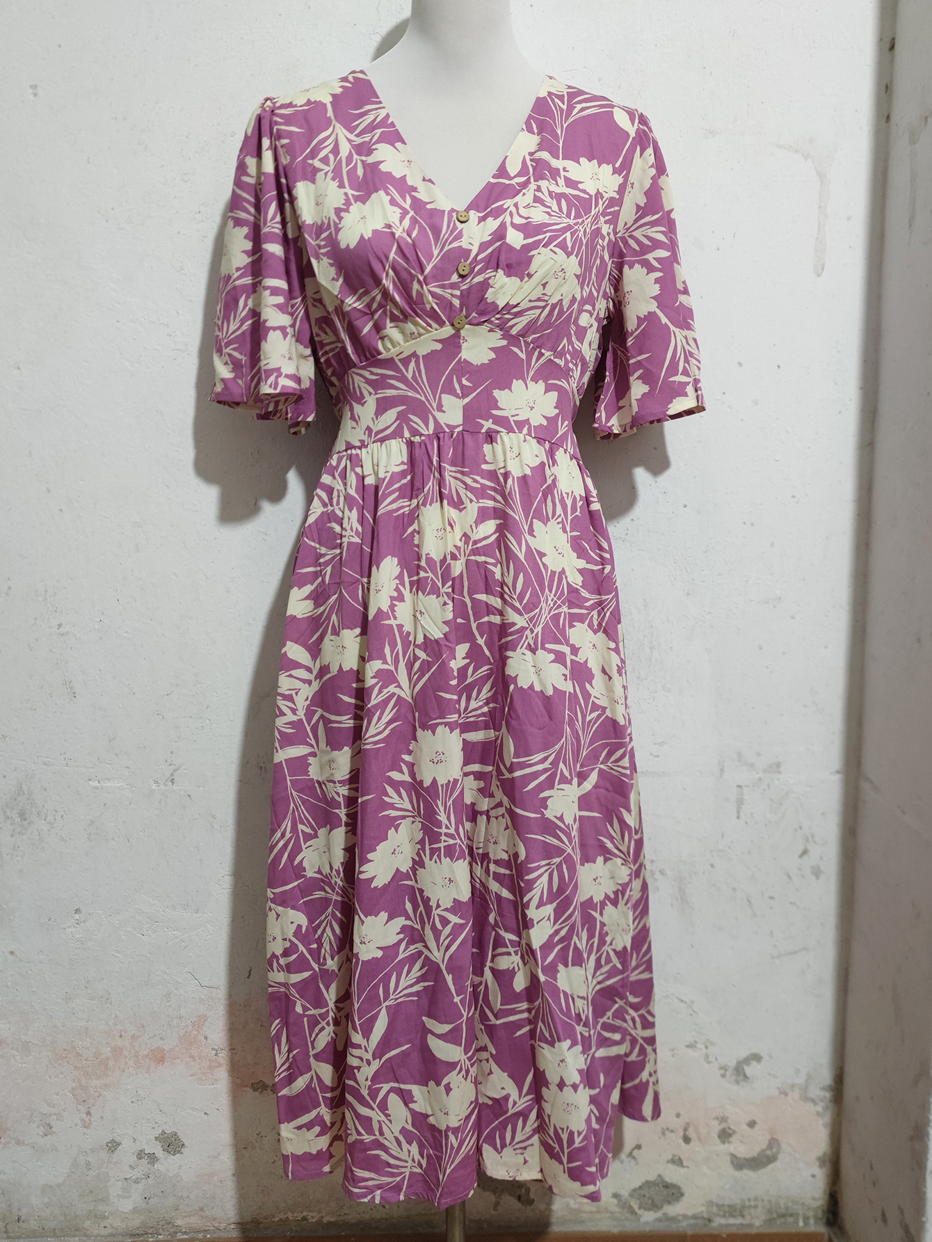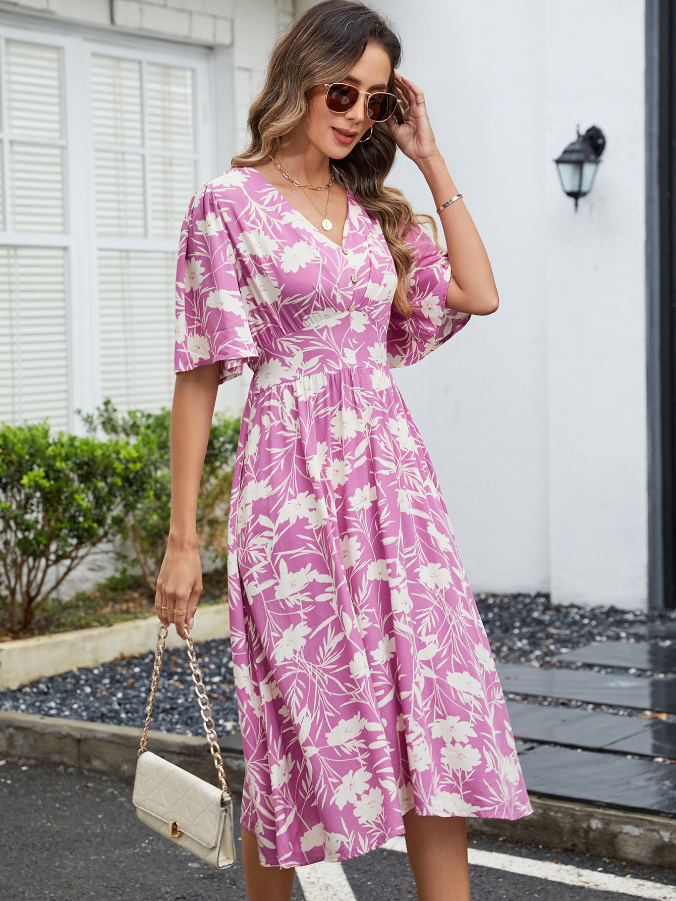 MY16422#法式复古气质V领收腰显瘦碎花连衣裙女设计感长裙