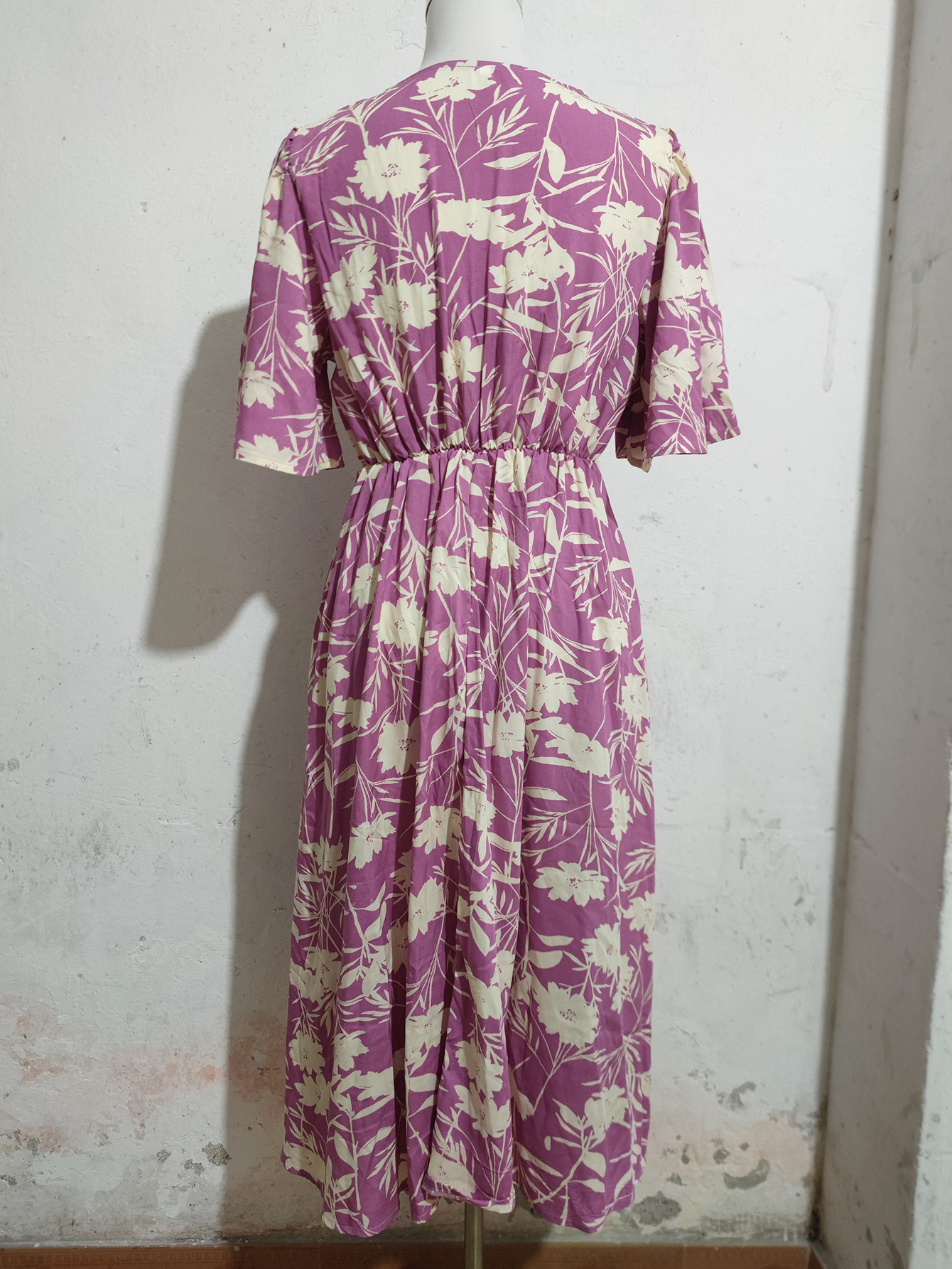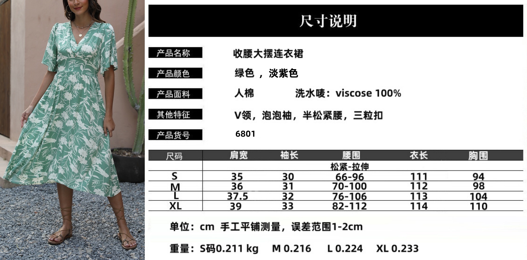 MY16427#人棉印花V领短袖收腰连衣裙波西米亚度假聚会沙滩裙