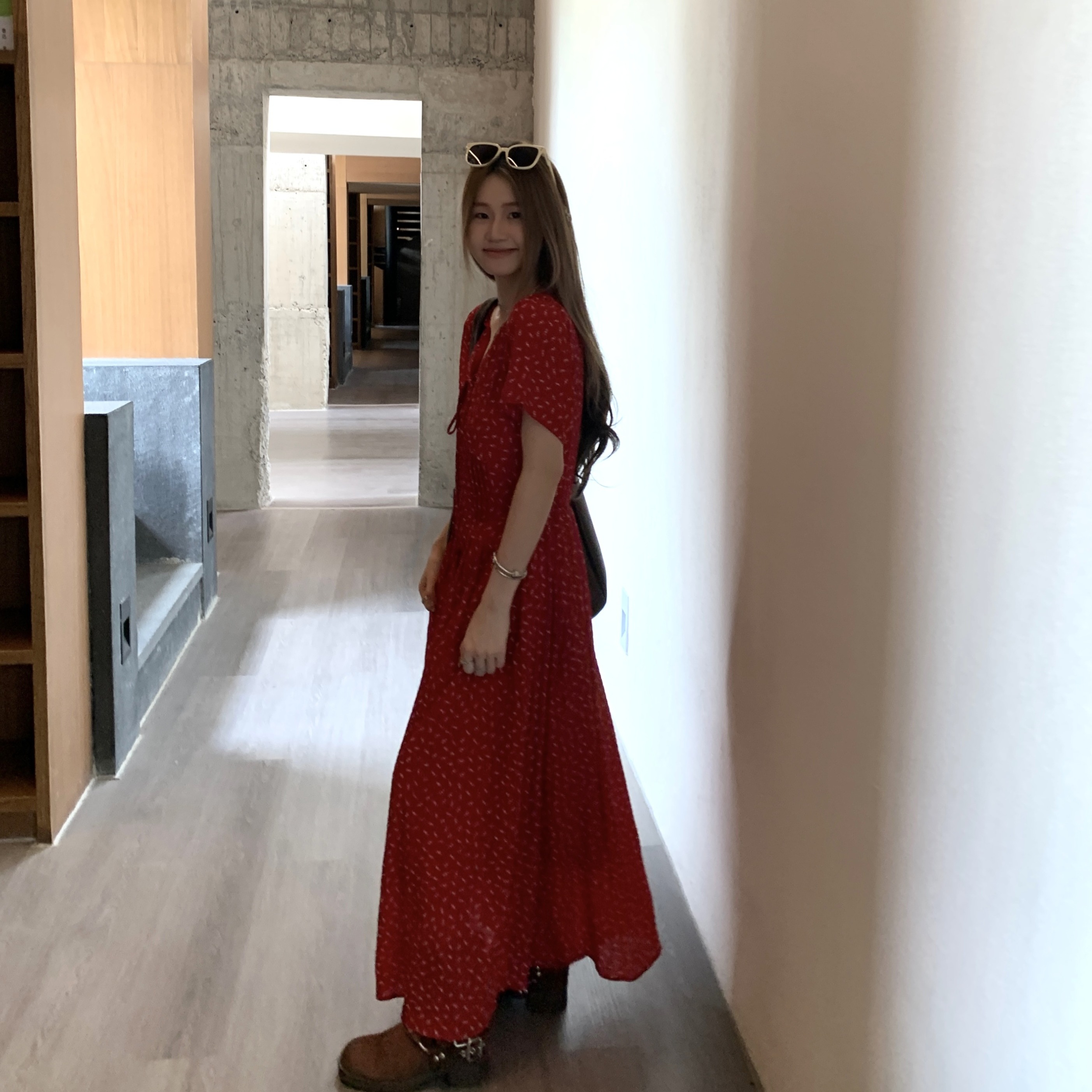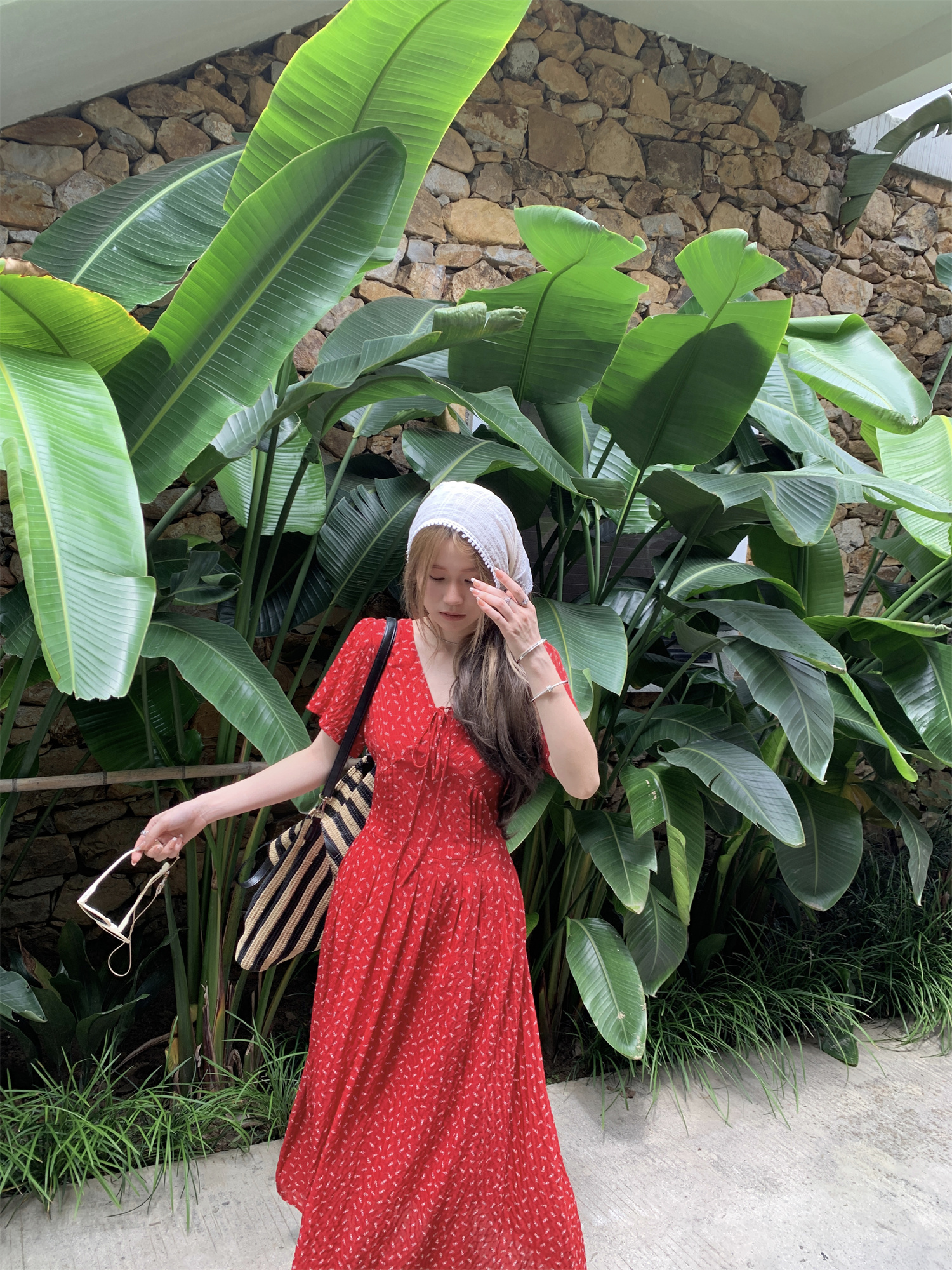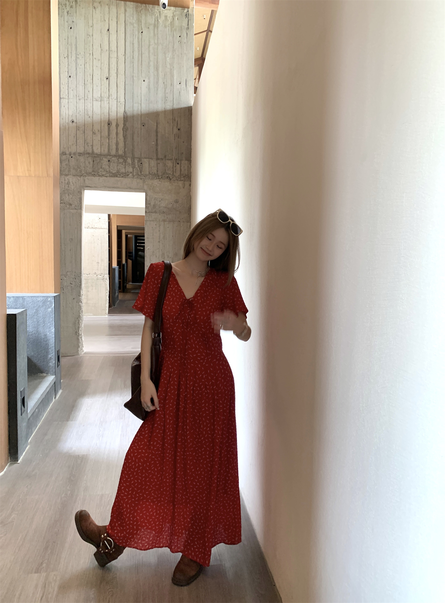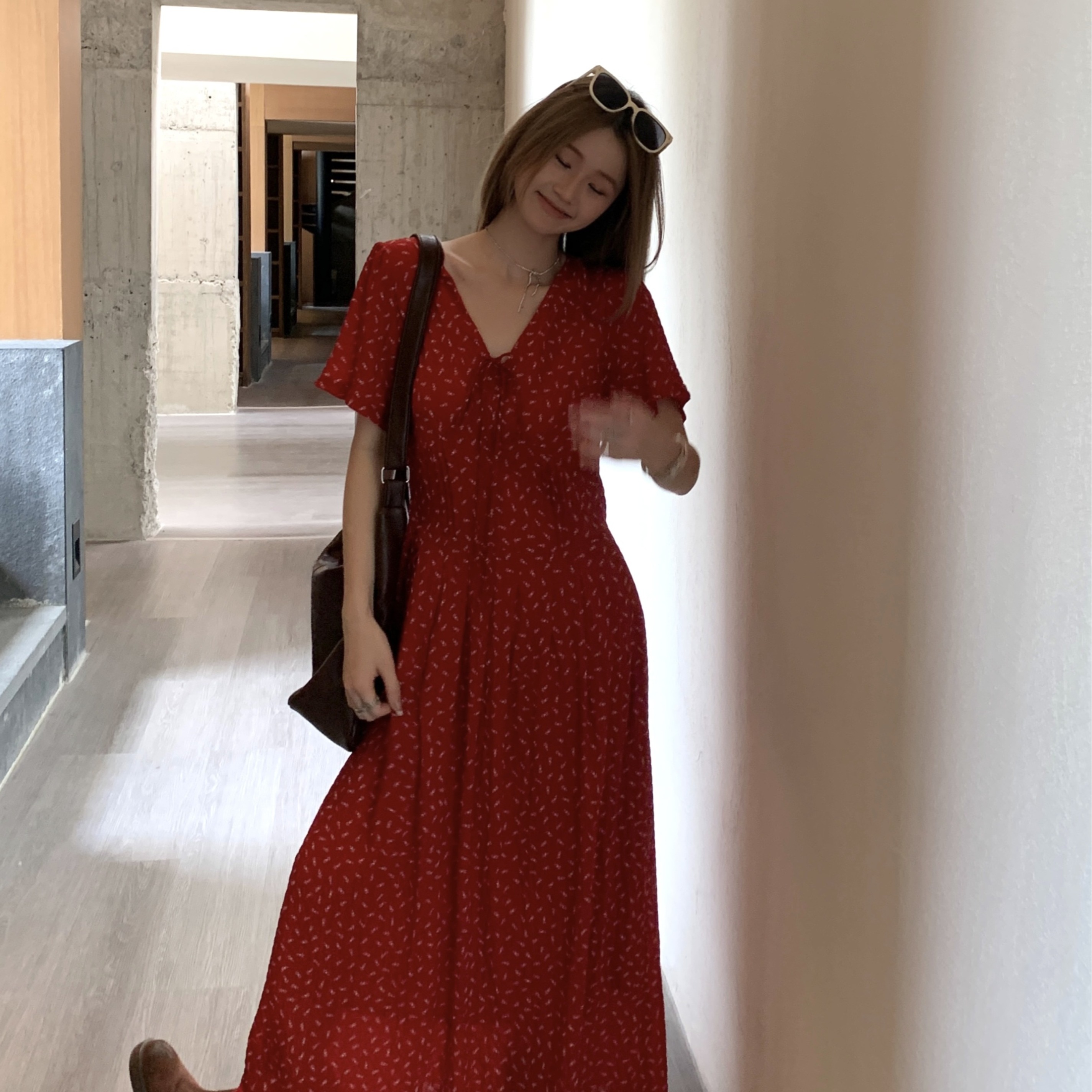 MY16429#大码V领气质甜美收腰显瘦红色碎花连衣裙性感女人味短袖淑女A字裙