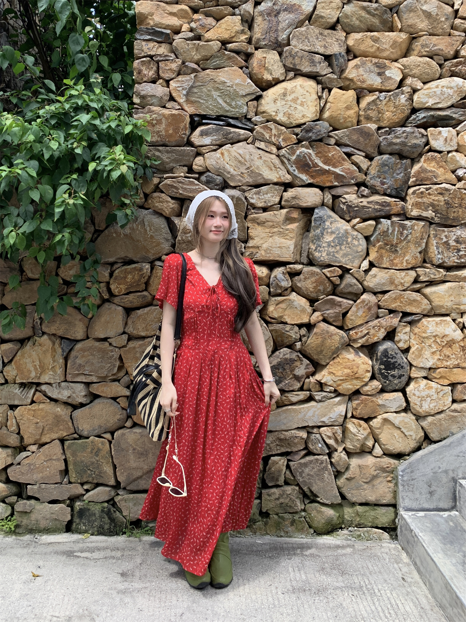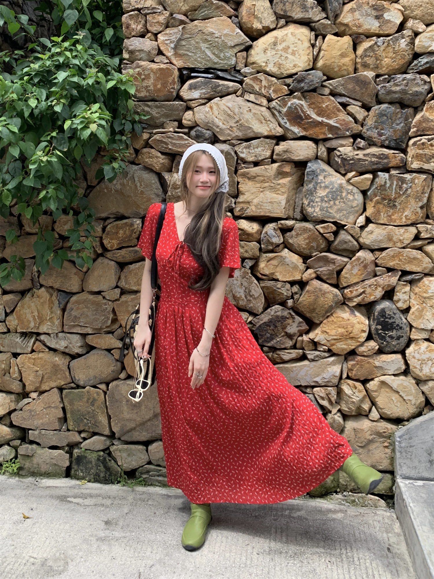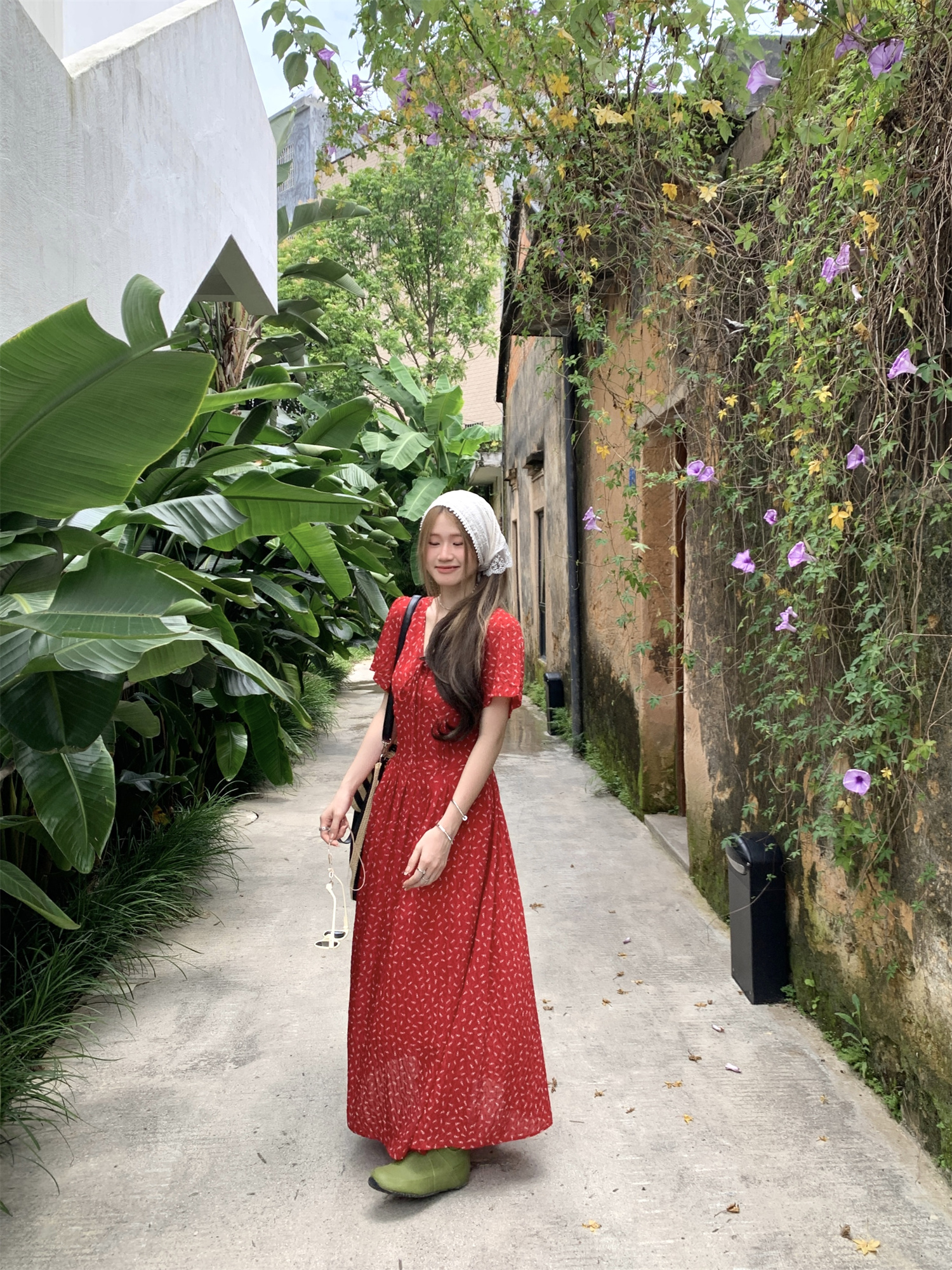 MY16429#大码V领气质甜美收腰显瘦红色碎花连衣裙性感女人味短袖淑女A字裙