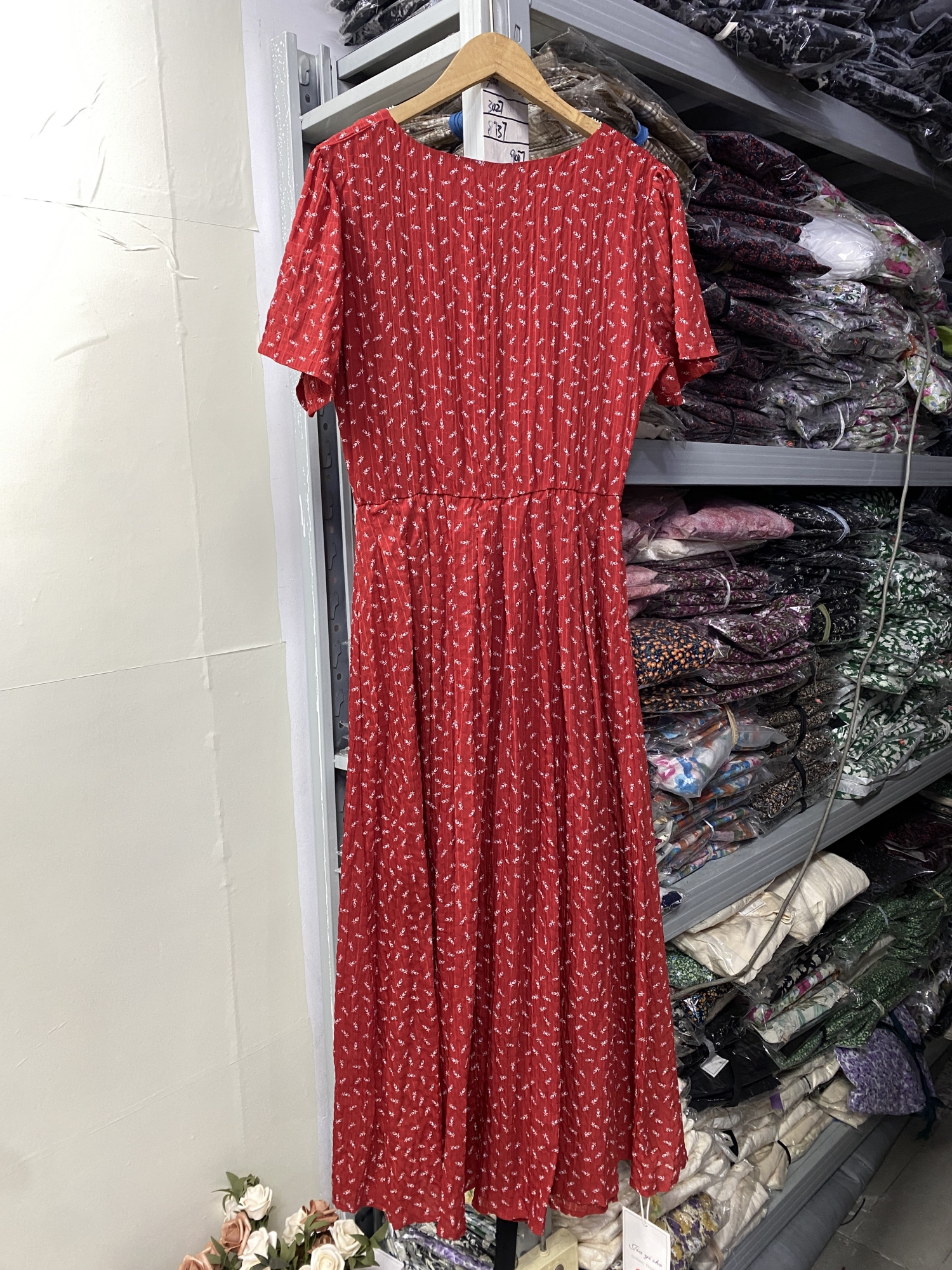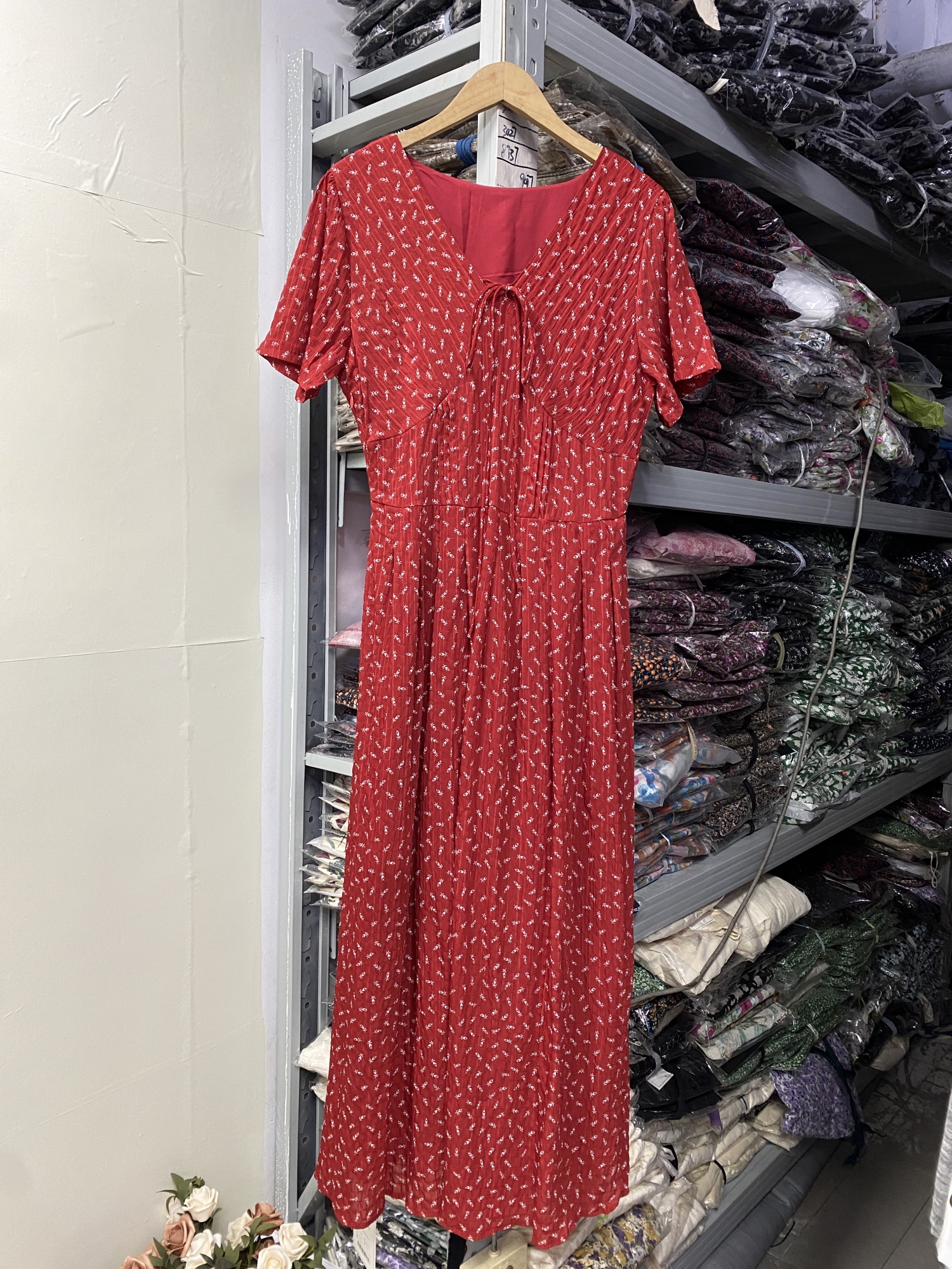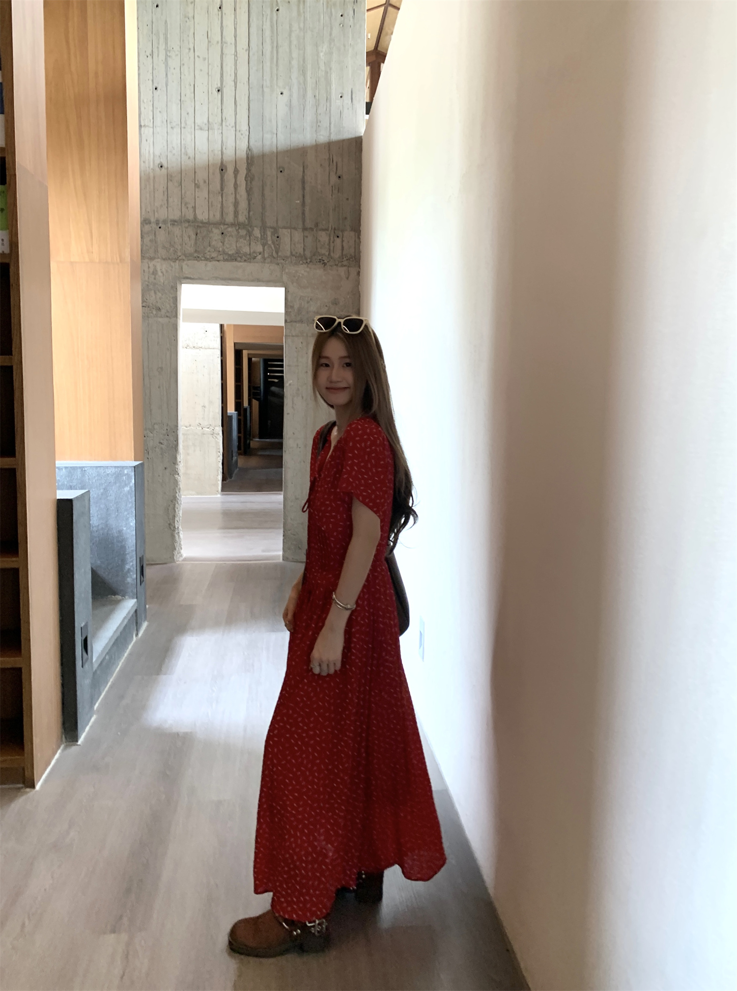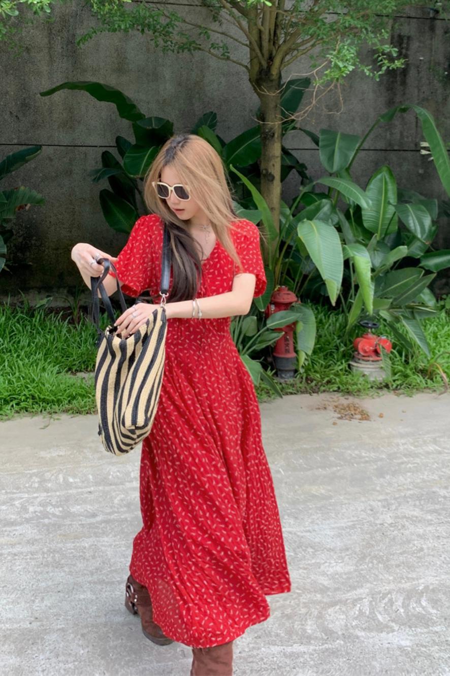 MY16429#大码V领气质甜美收腰显瘦红色碎花连衣裙性感女人味短袖淑女A字裙