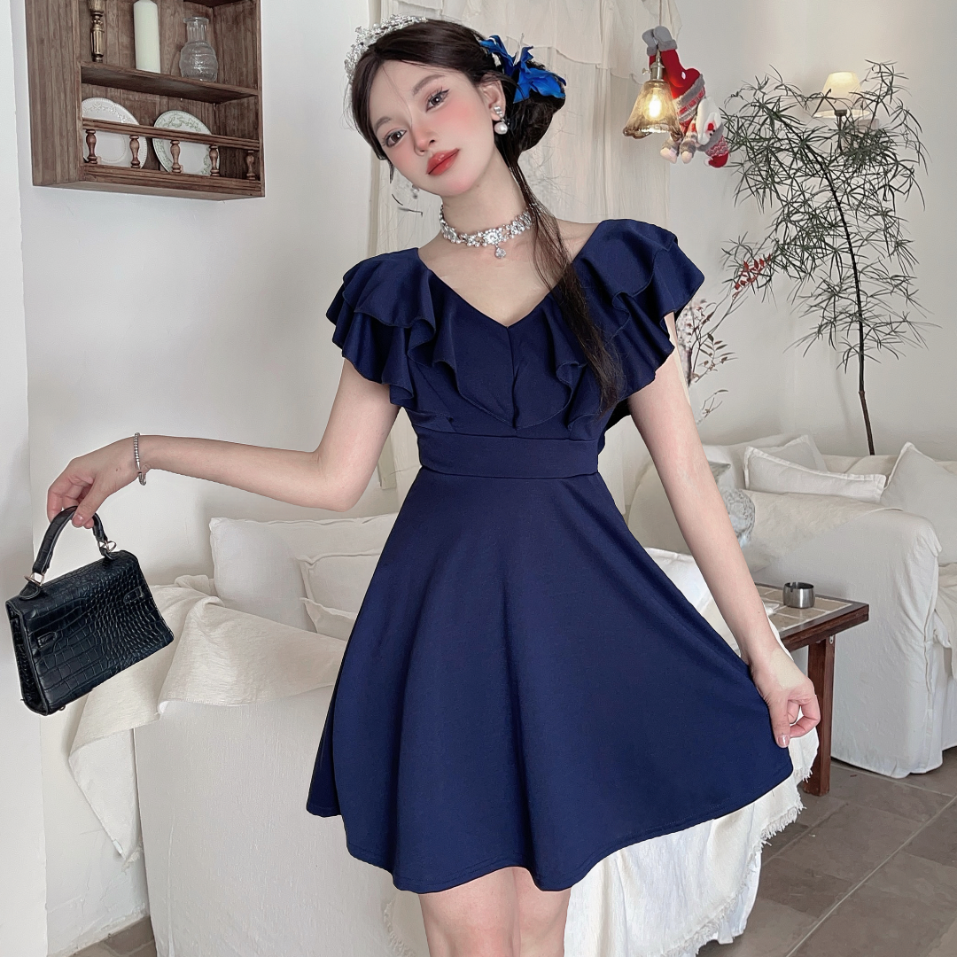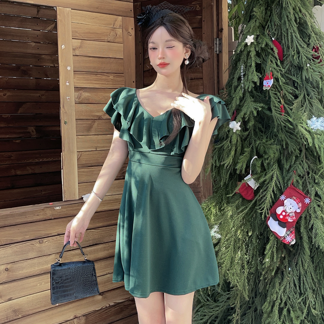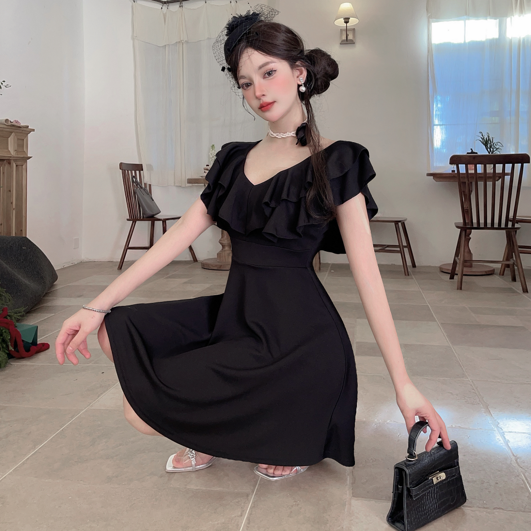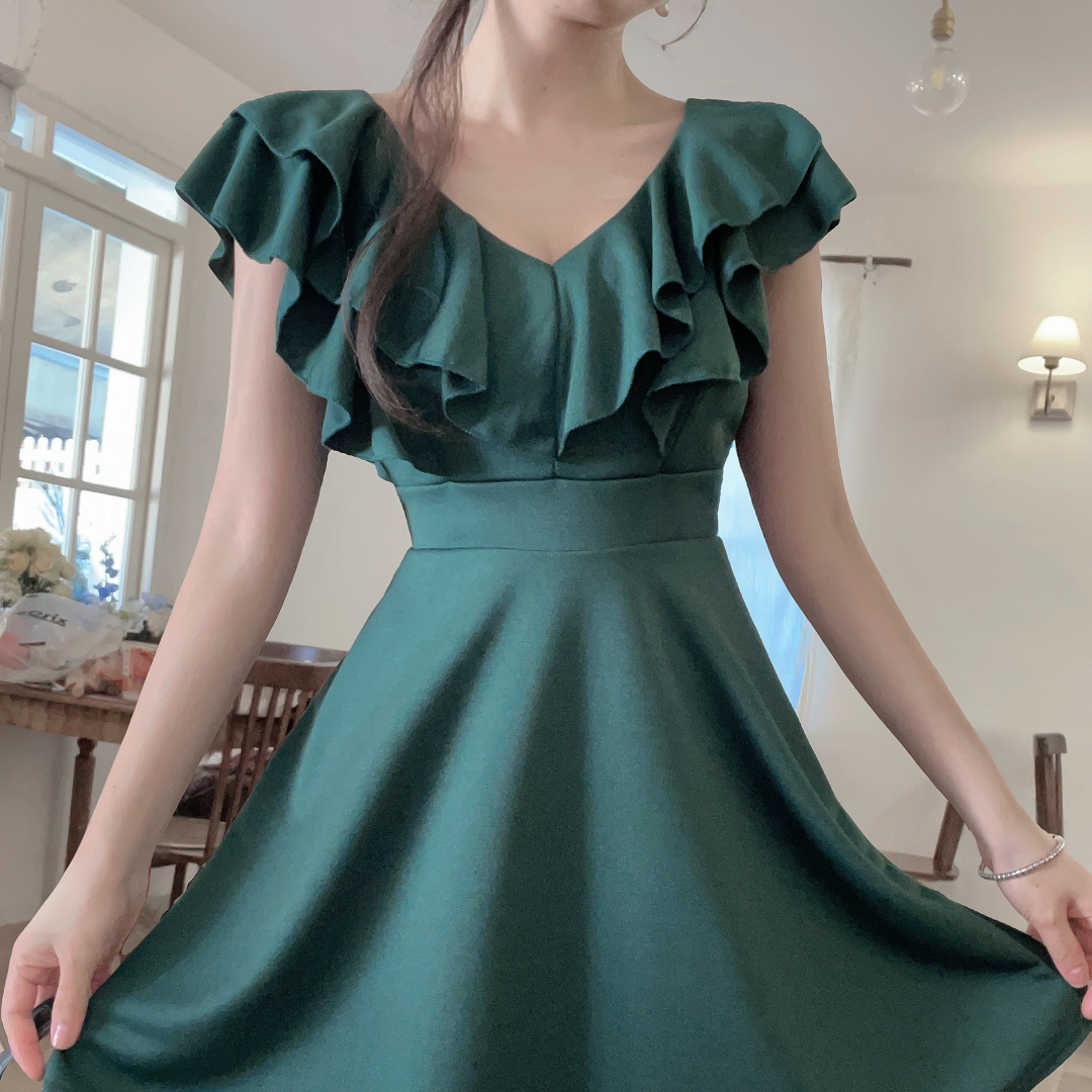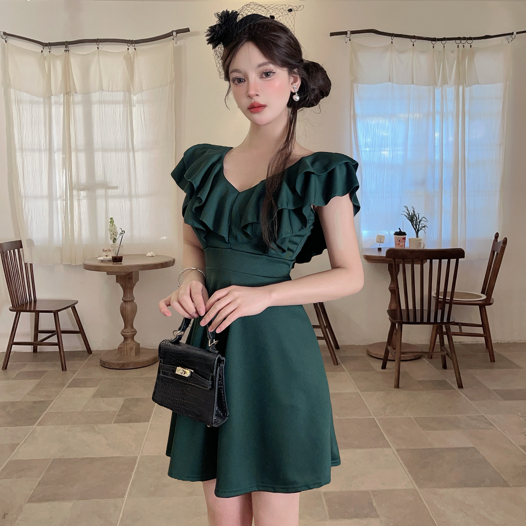 MY16431#复古荷叶边 V 领连衣裙女收腰显瘦小个子气质约会小礼裙