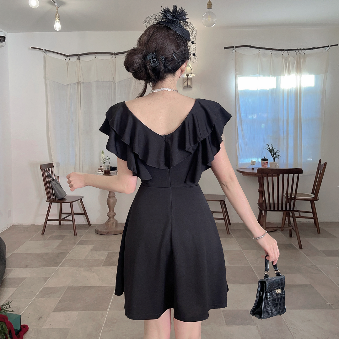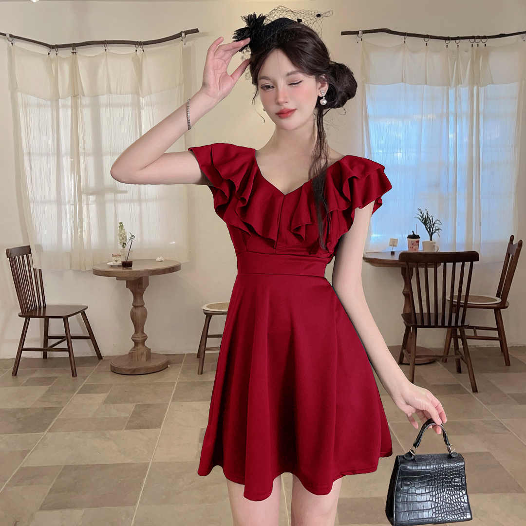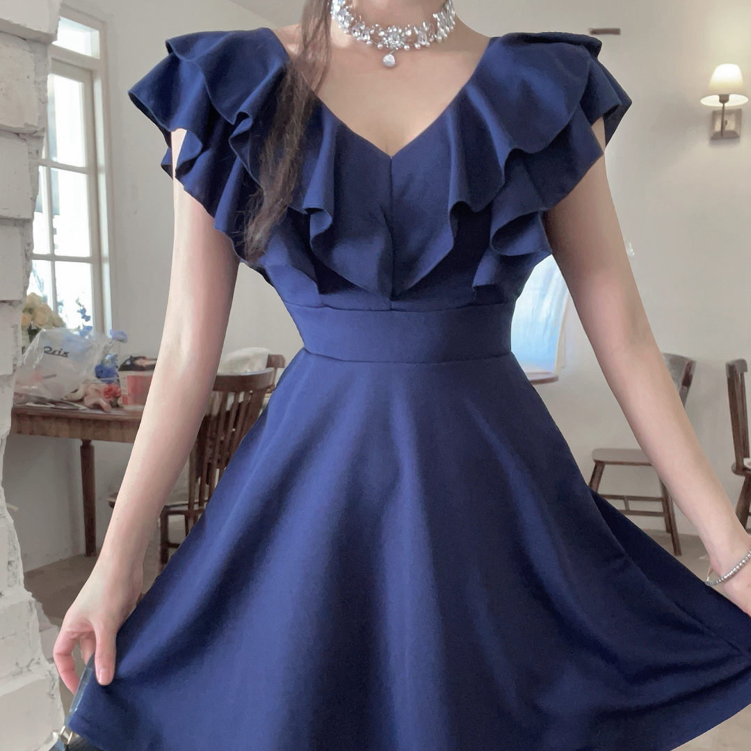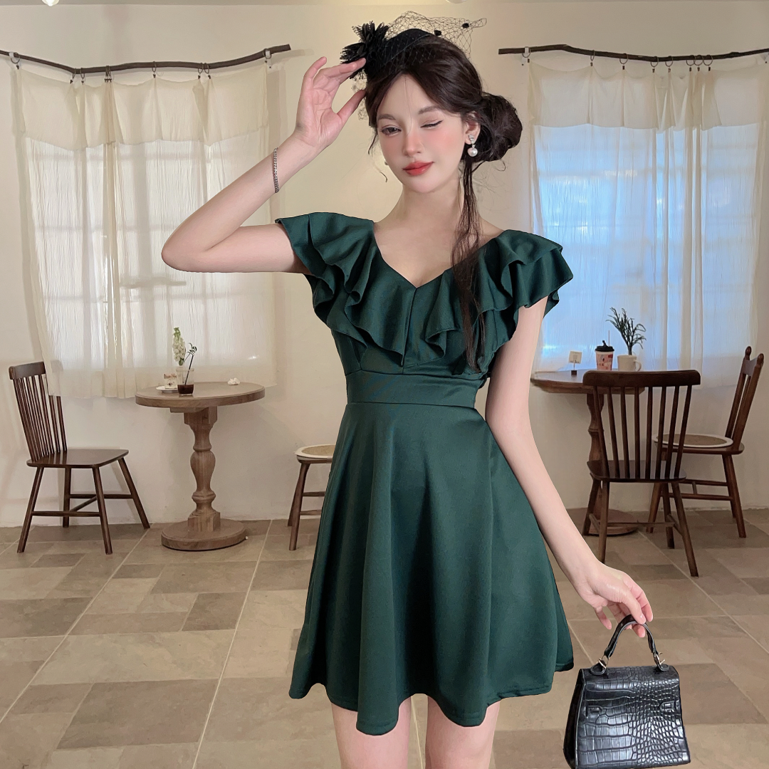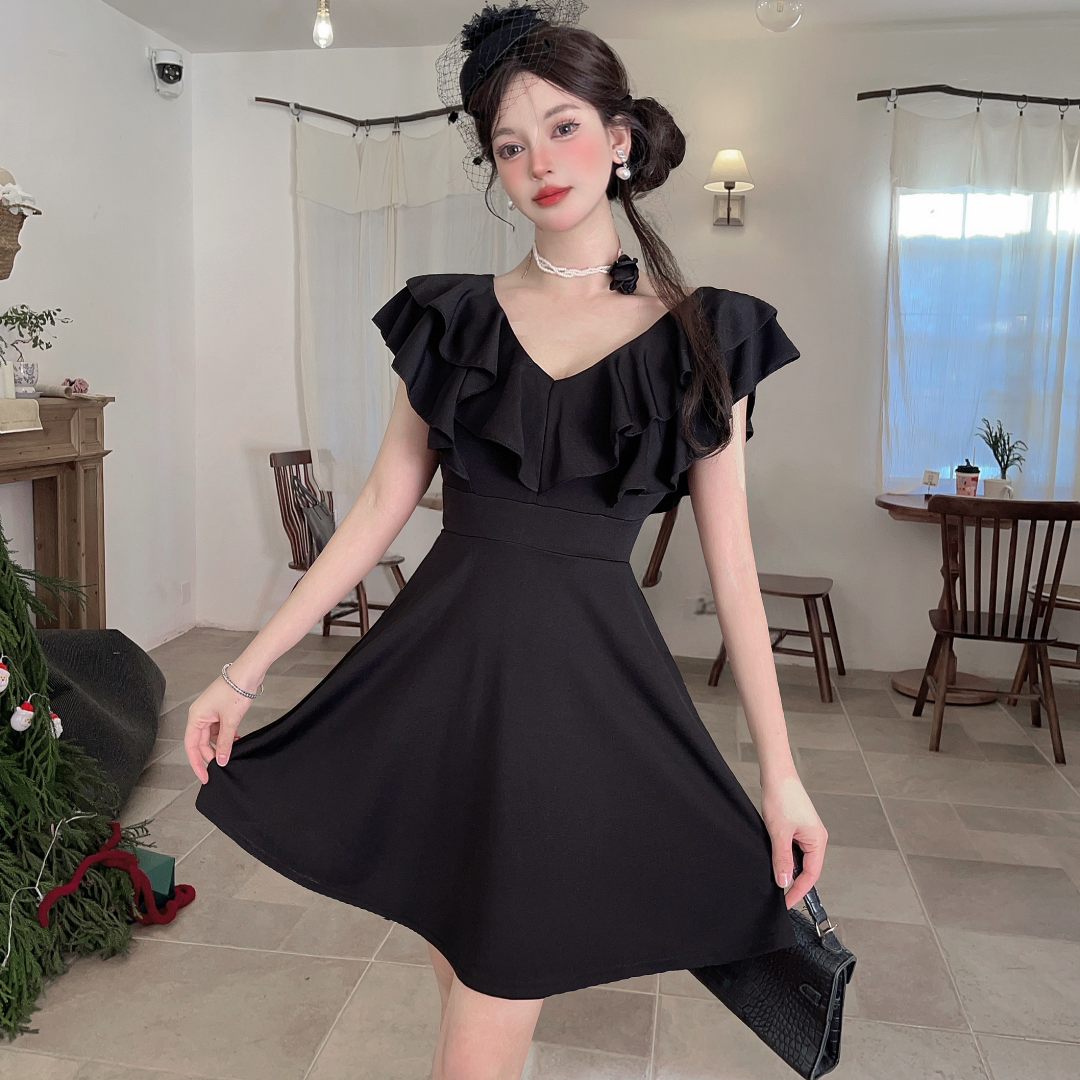 MY16431#复古荷叶边 V 领连衣裙女收腰显瘦小个子气质约会小礼裙