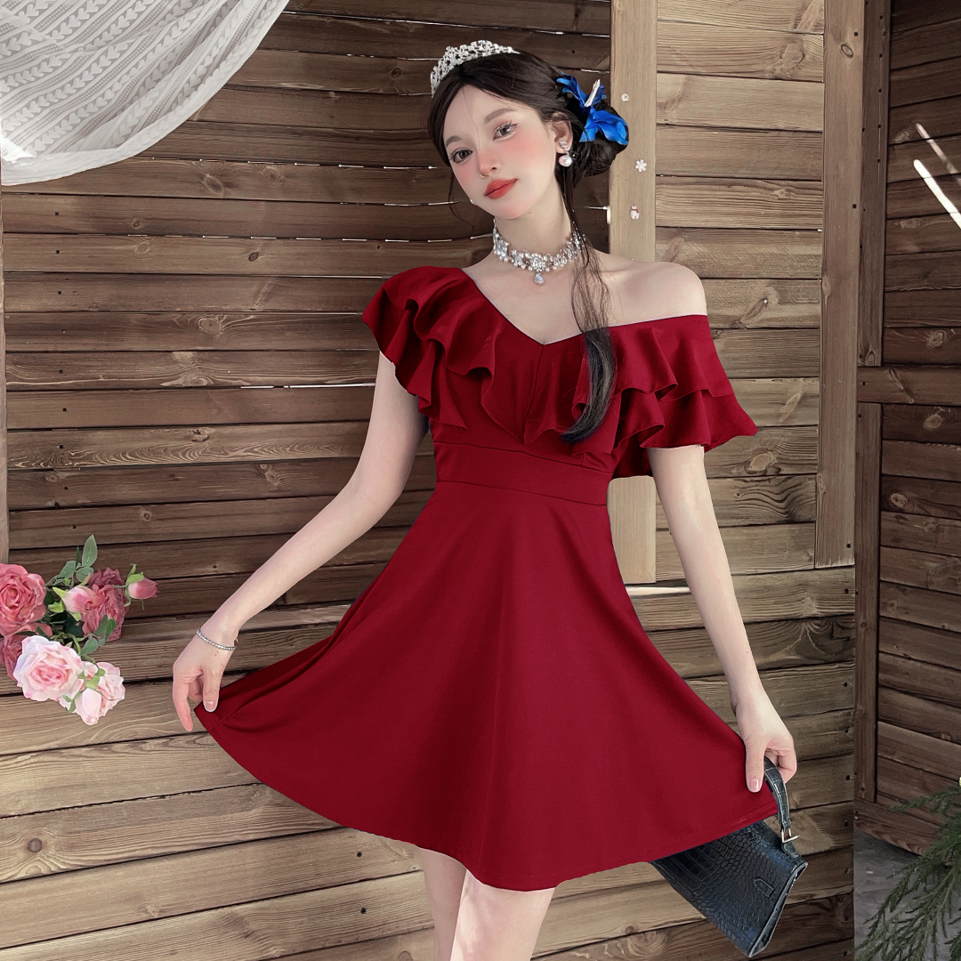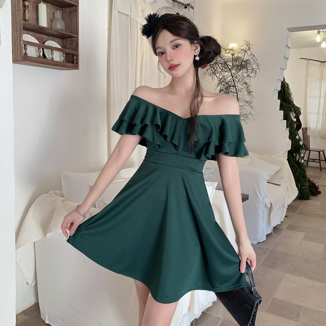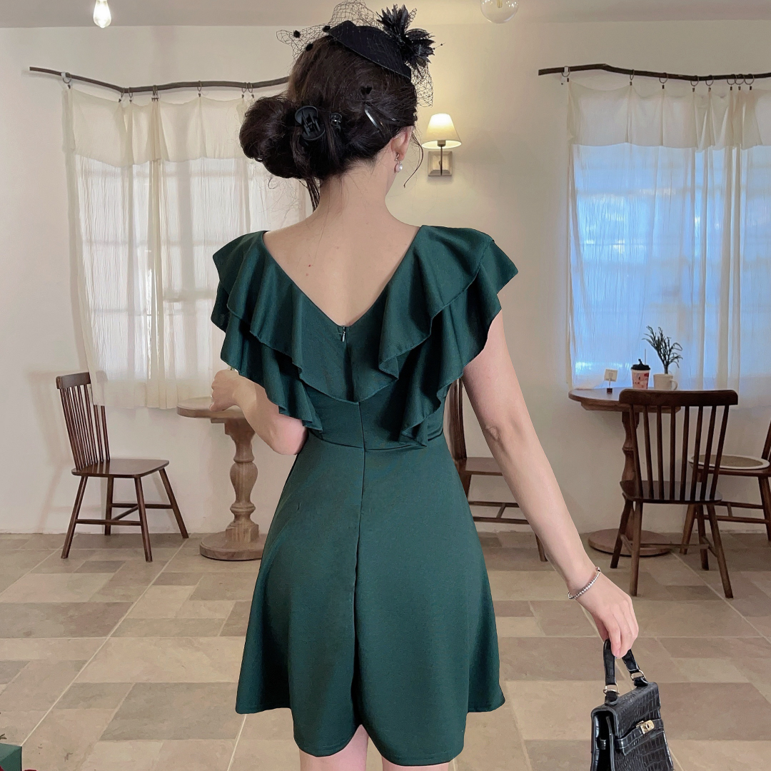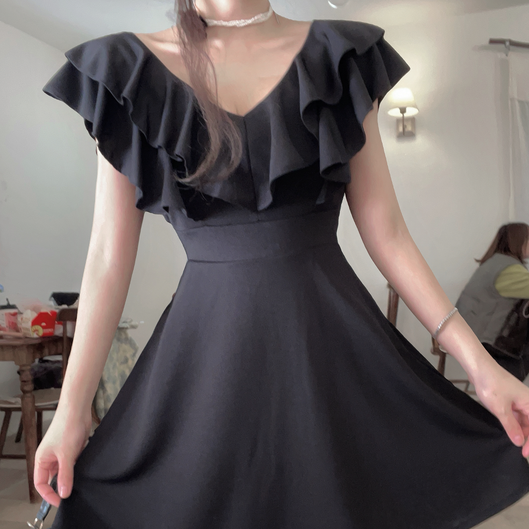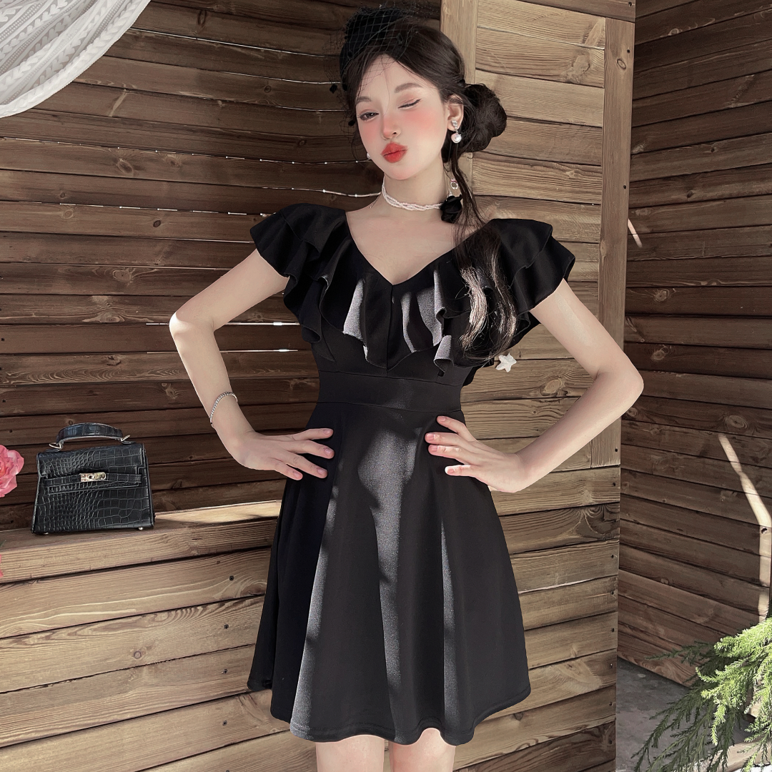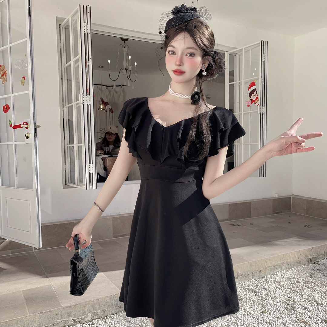 MY16431#复古荷叶边 V 领连衣裙女收腰显瘦小个子气质约会小礼裙