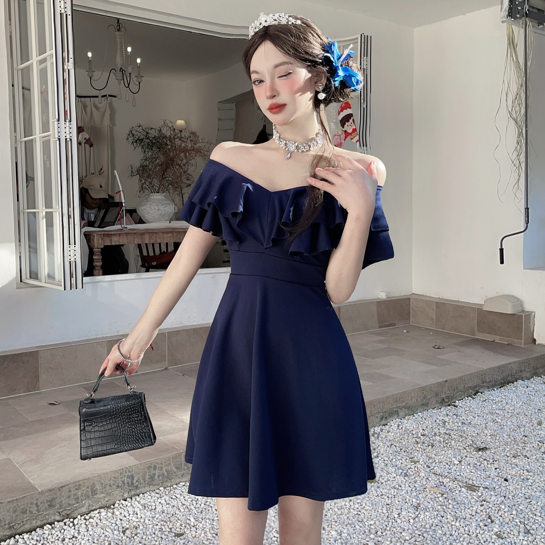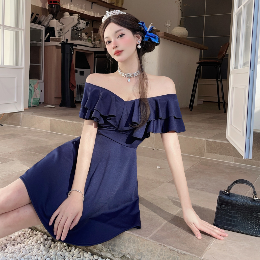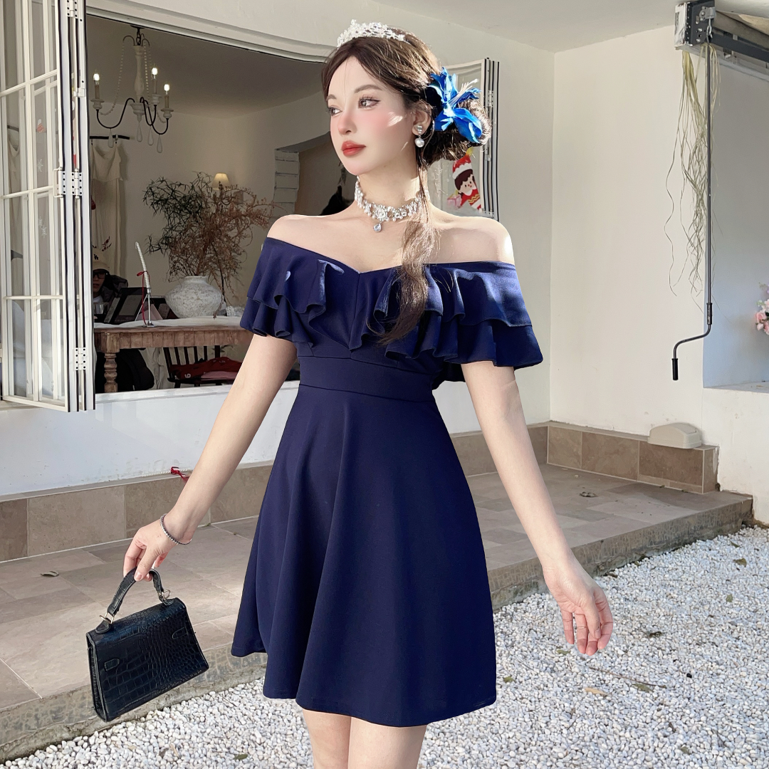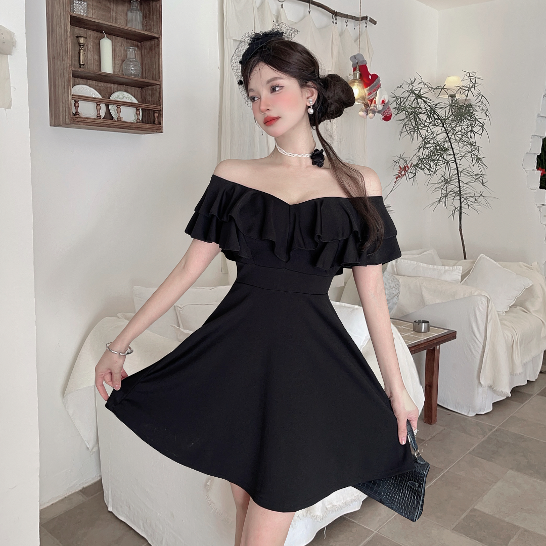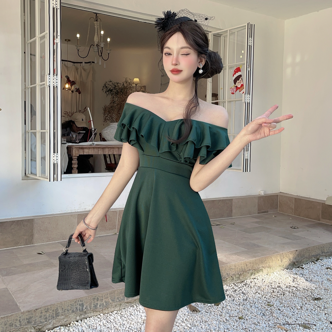 MY16431#复古荷叶边 V 领连衣裙女收腰显瘦小个子气质约会小礼裙