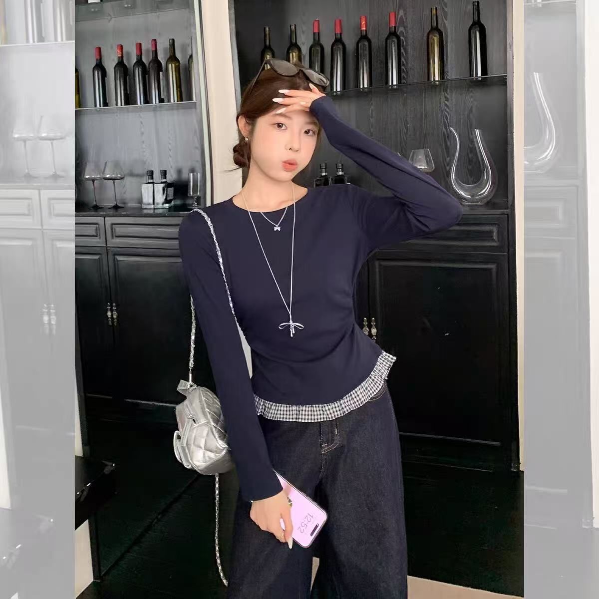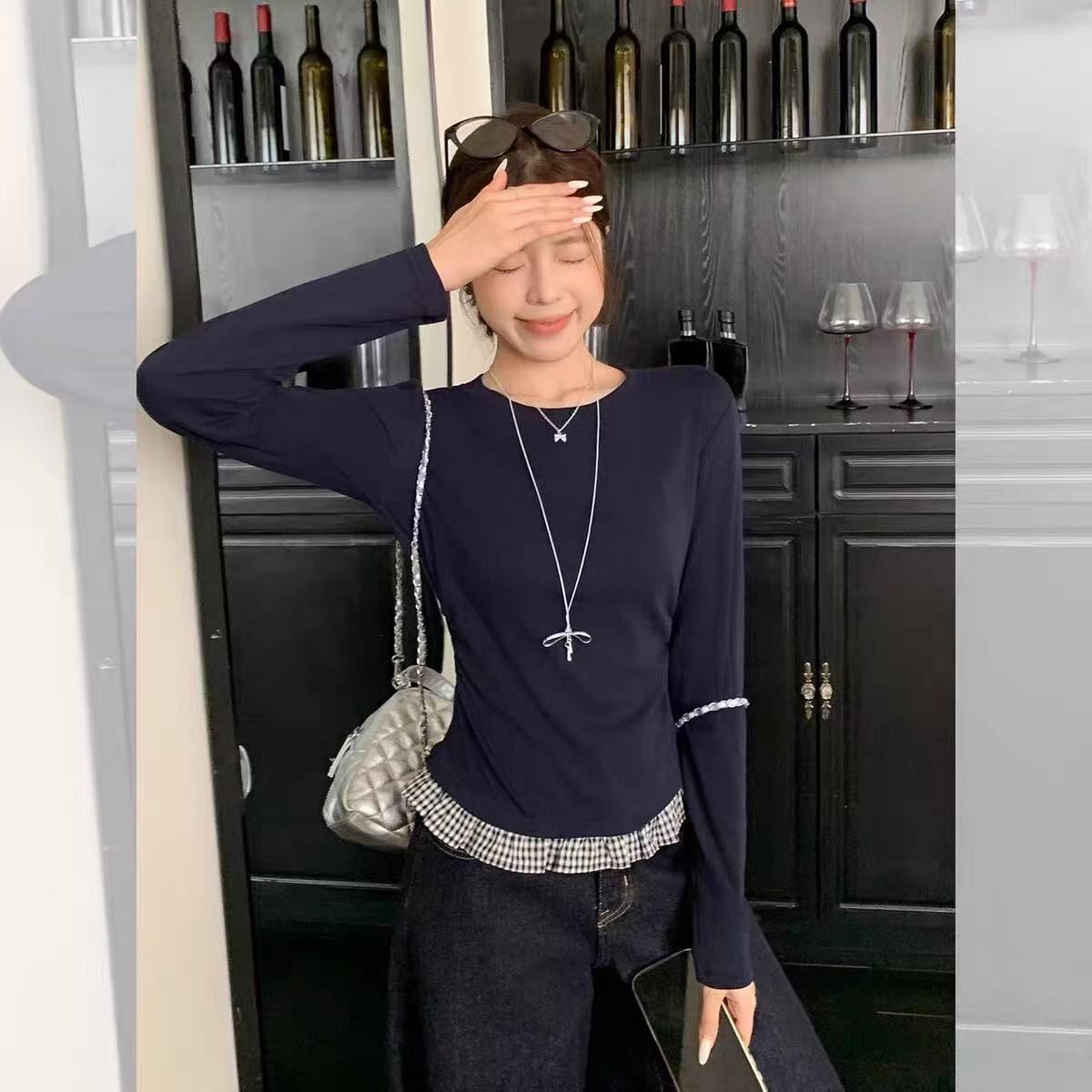 MY16438# 人棉 韩系格子拼接花边长袖T恤女女裝貨源服裝批發