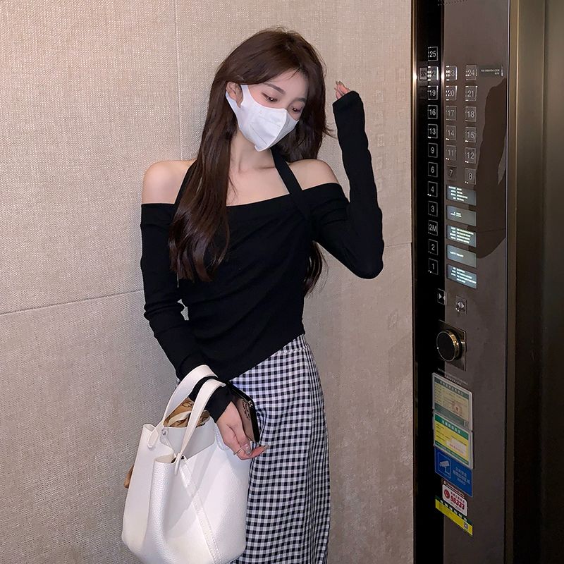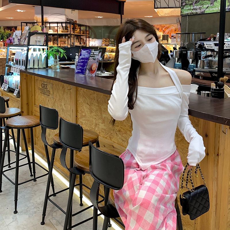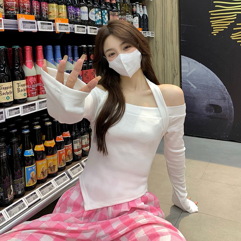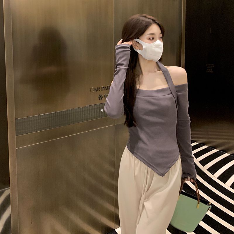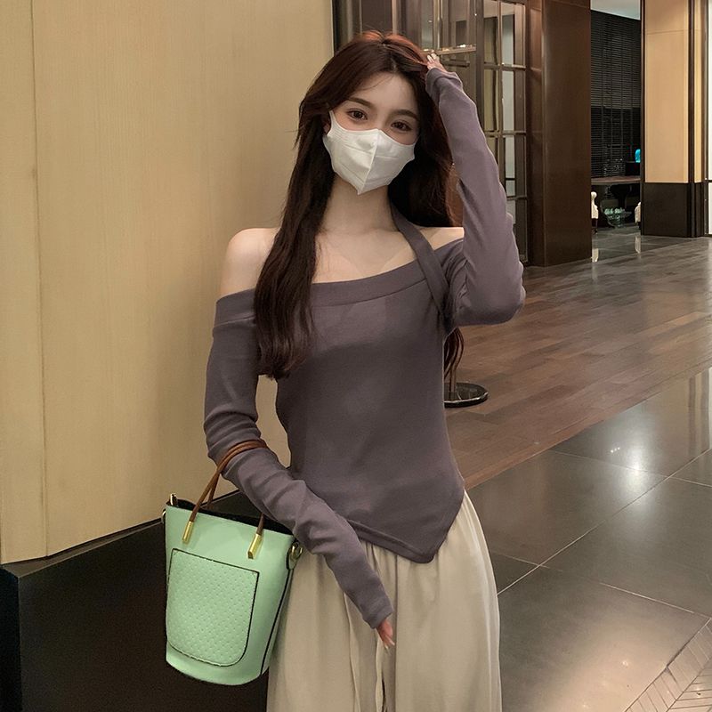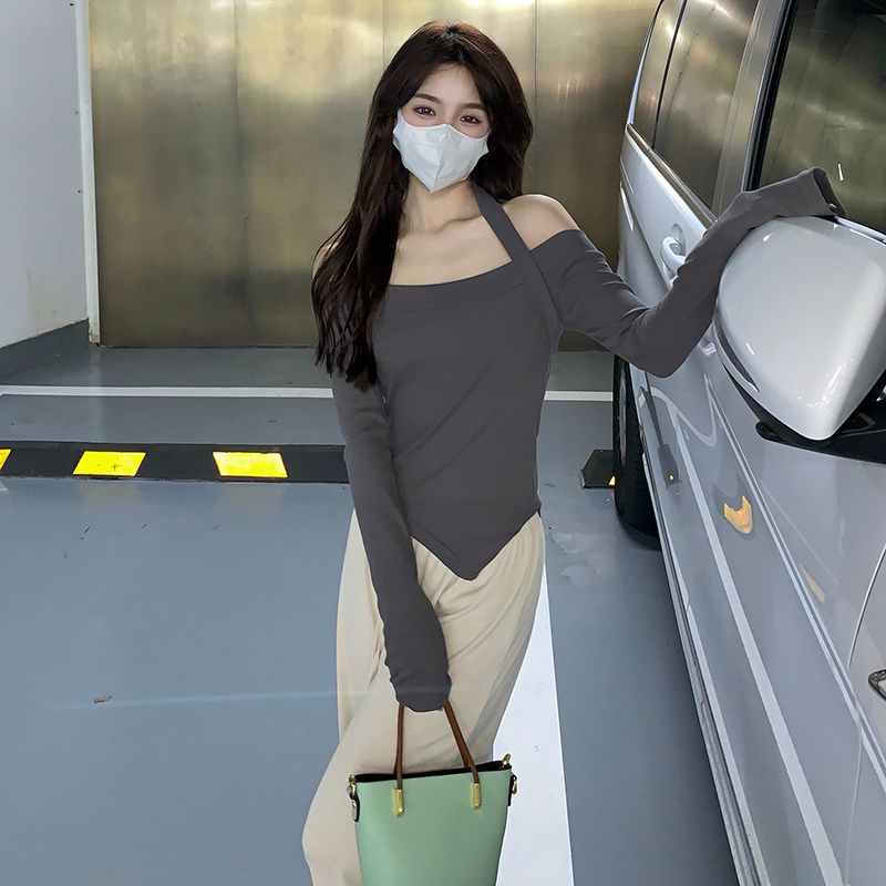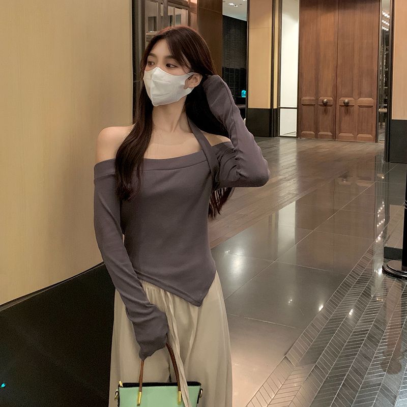 MY16440# 罗纹一字肩长袖T恤女装春秋季辣妹设计感小众短款女裝貨源服裝批發