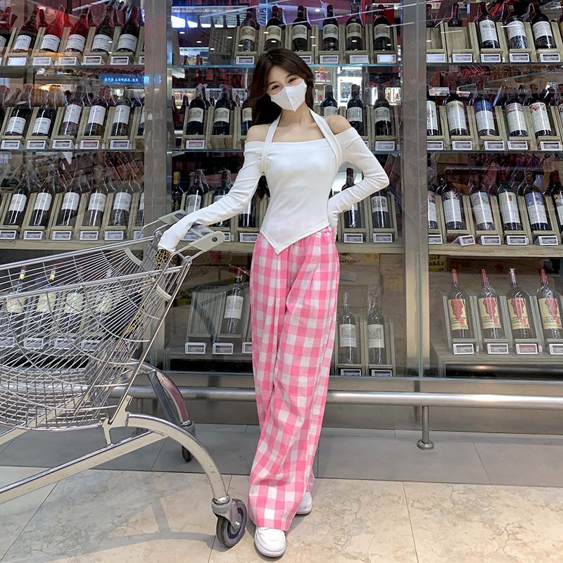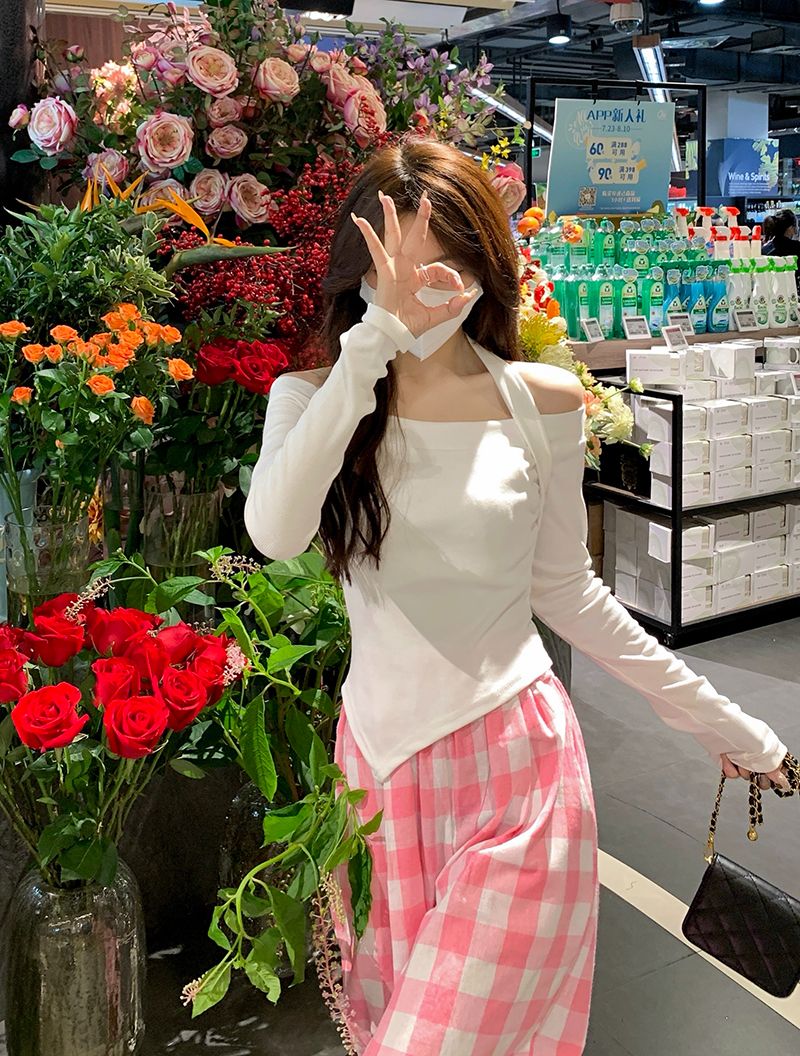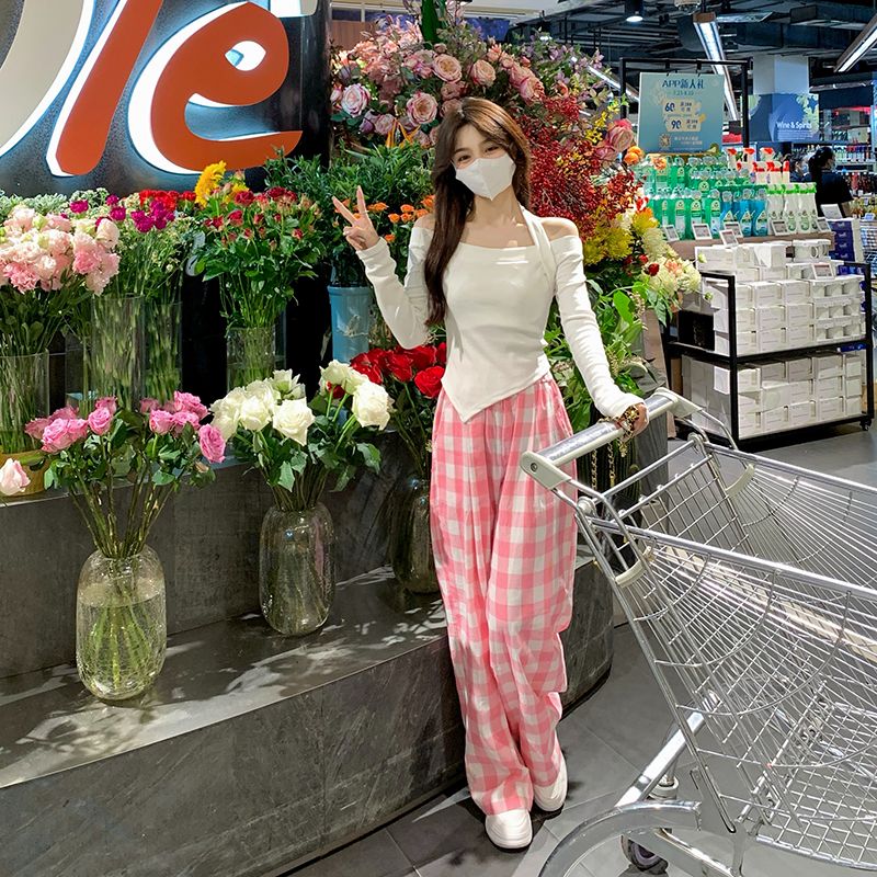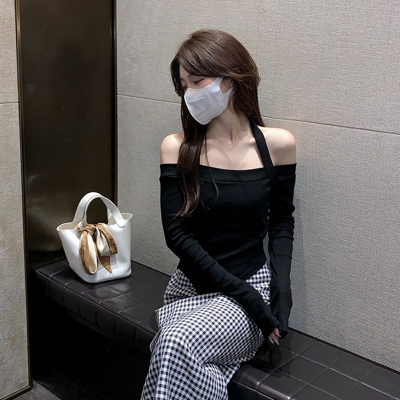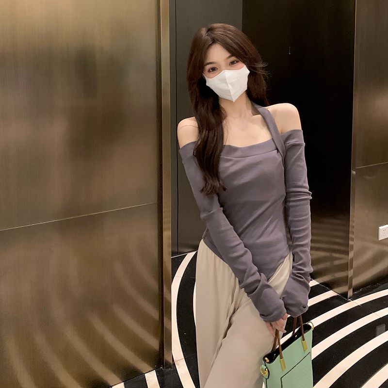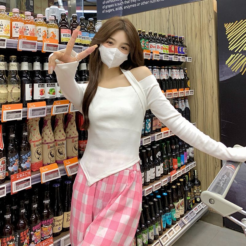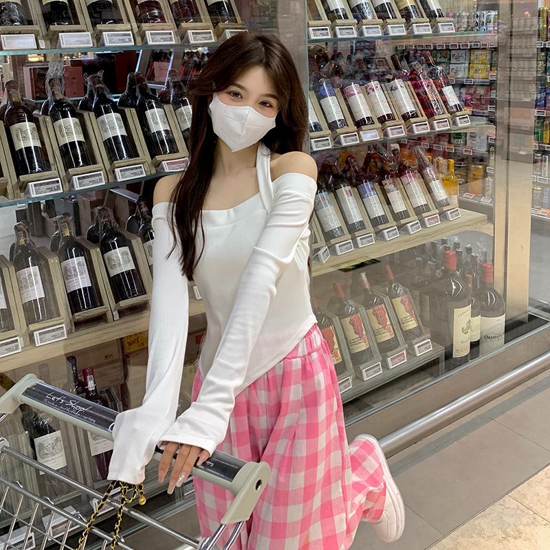 MY16440# 罗纹一字肩长袖T恤女装春秋季辣妹设计感小众短款女裝貨源服裝批發