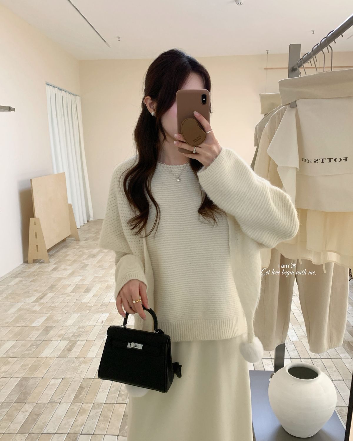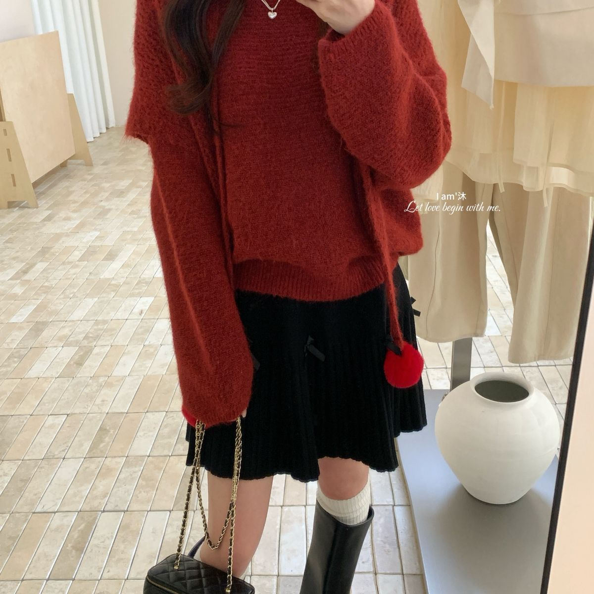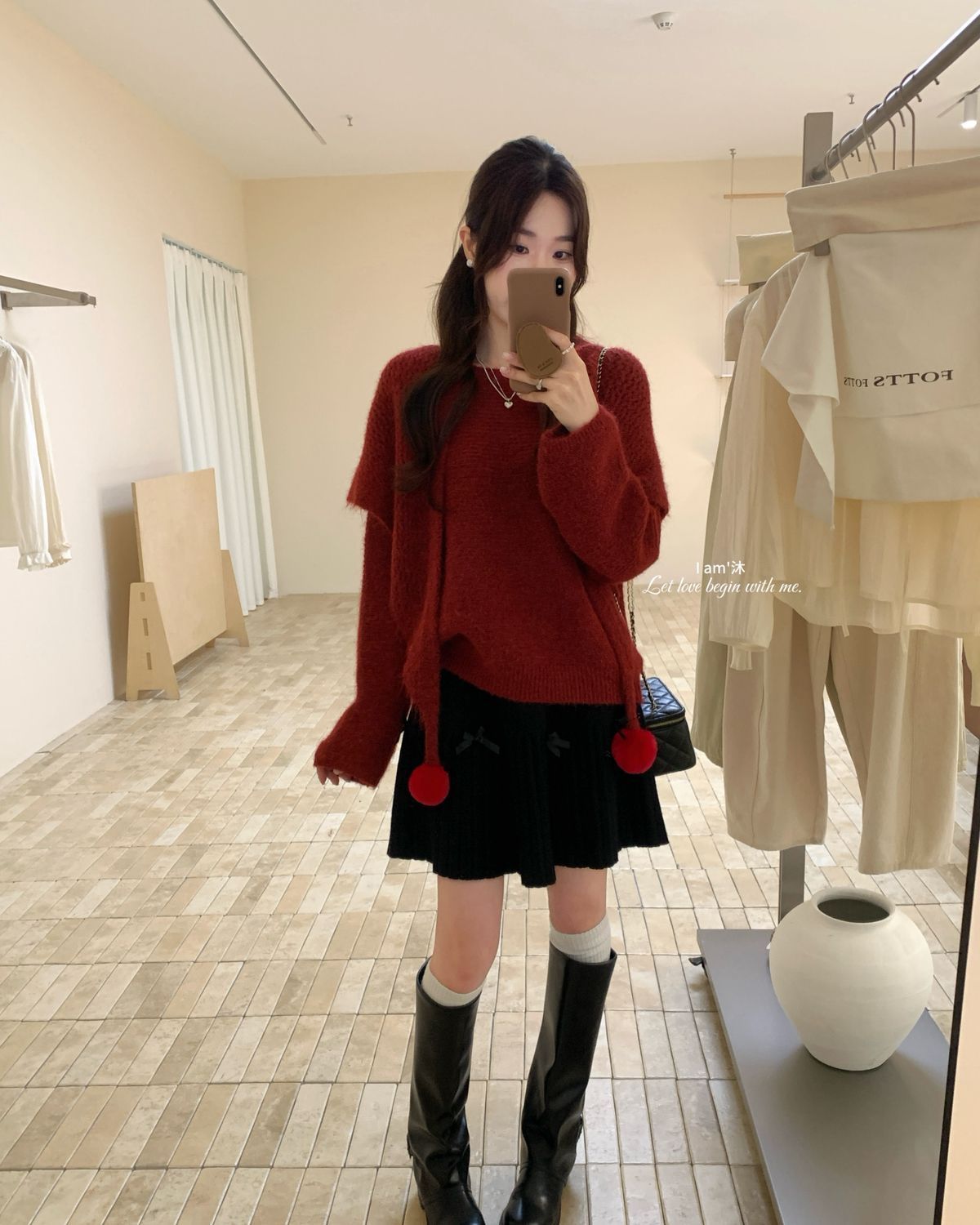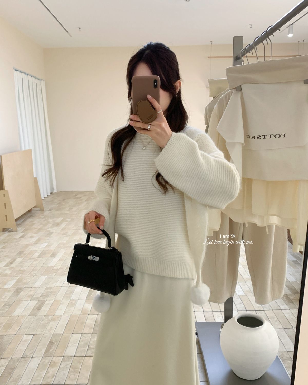 MY16449# 甜美可爱圆领加厚套头针织毛衣+毛球披肩女裝貨源服裝批發