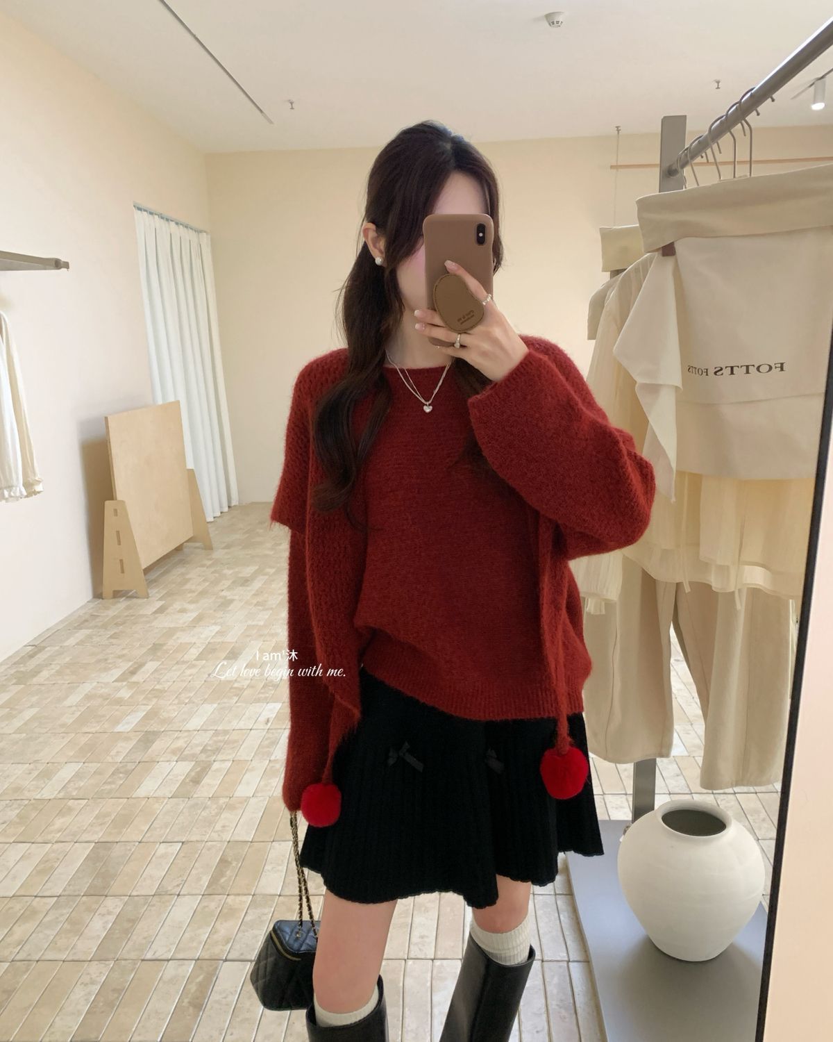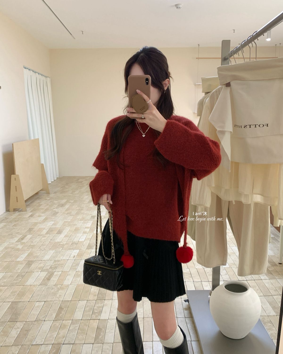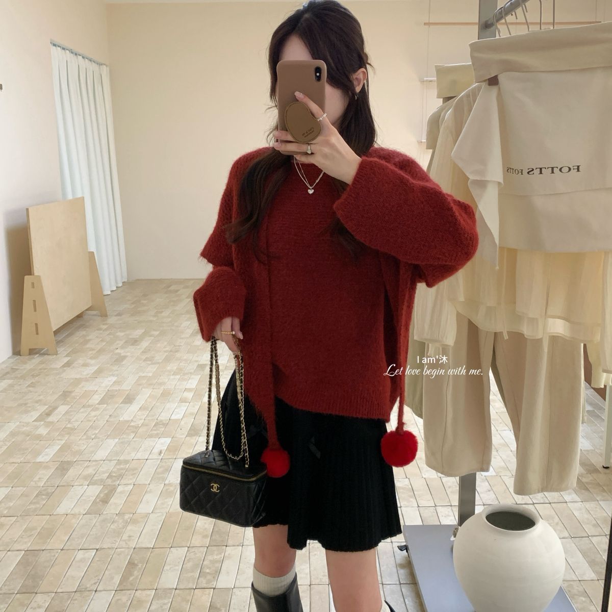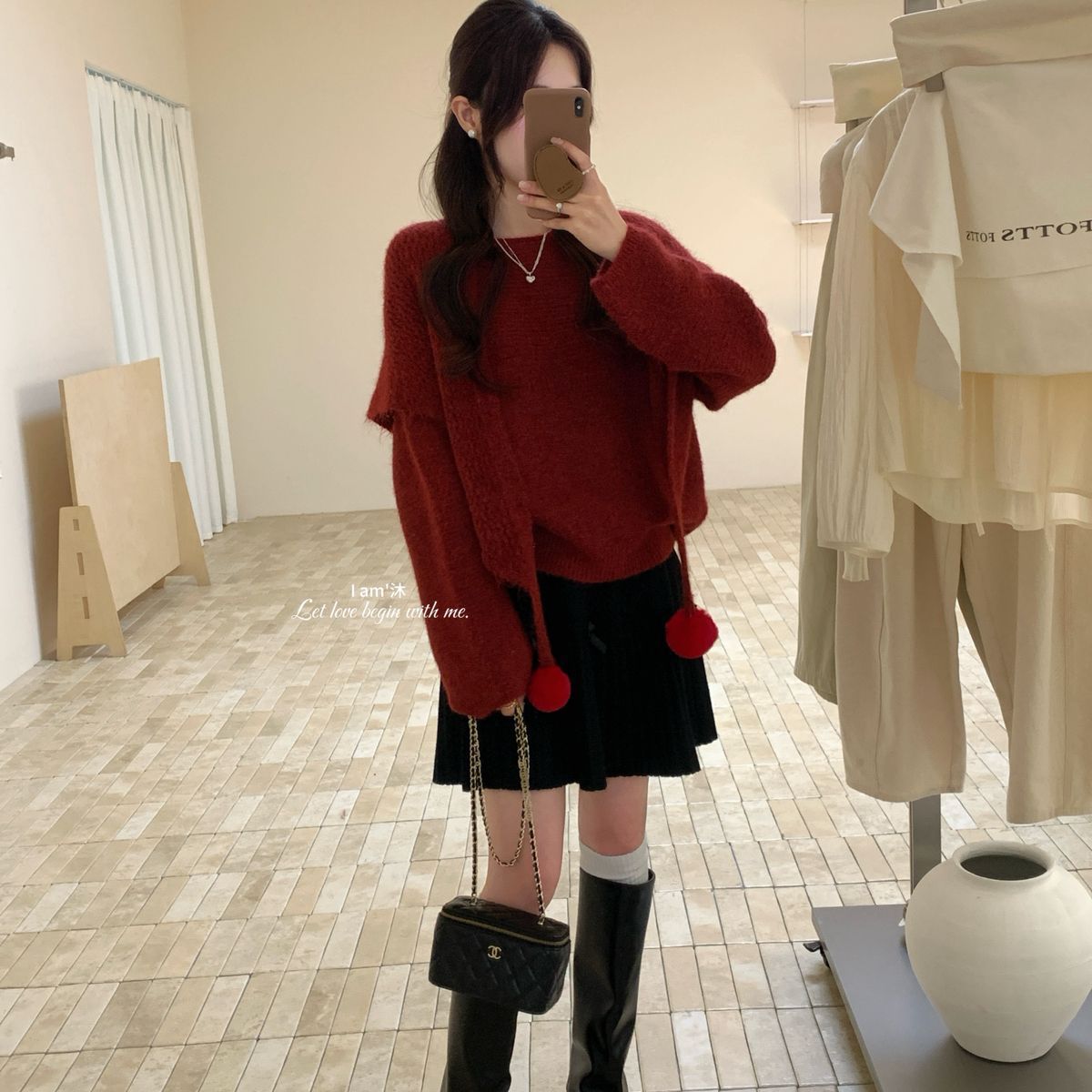 MY16449# 甜美可爱圆领加厚套头针织毛衣+毛球披肩女裝貨源服裝批發