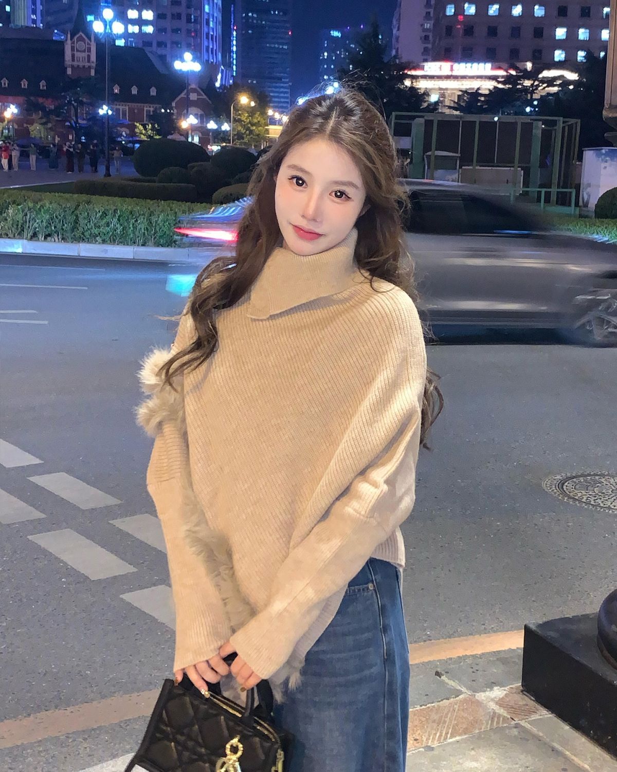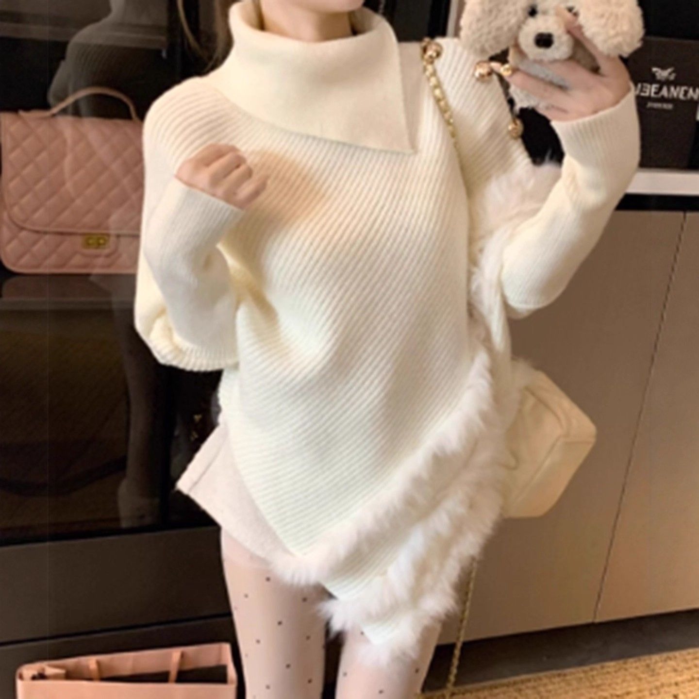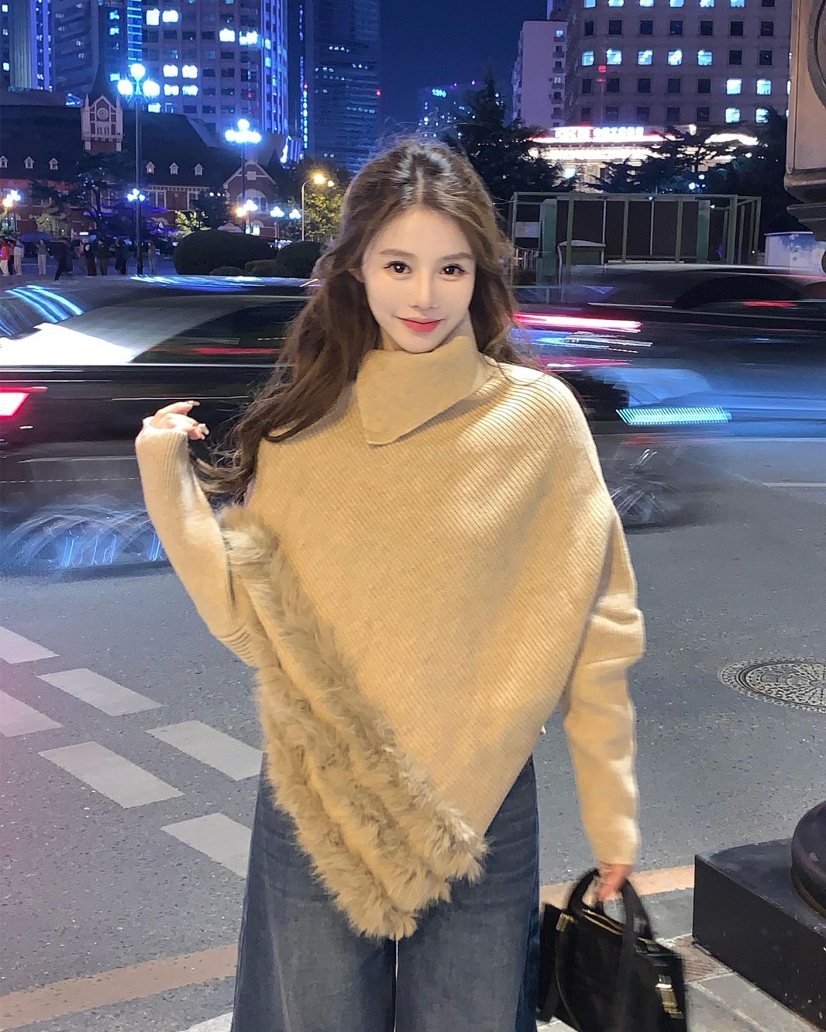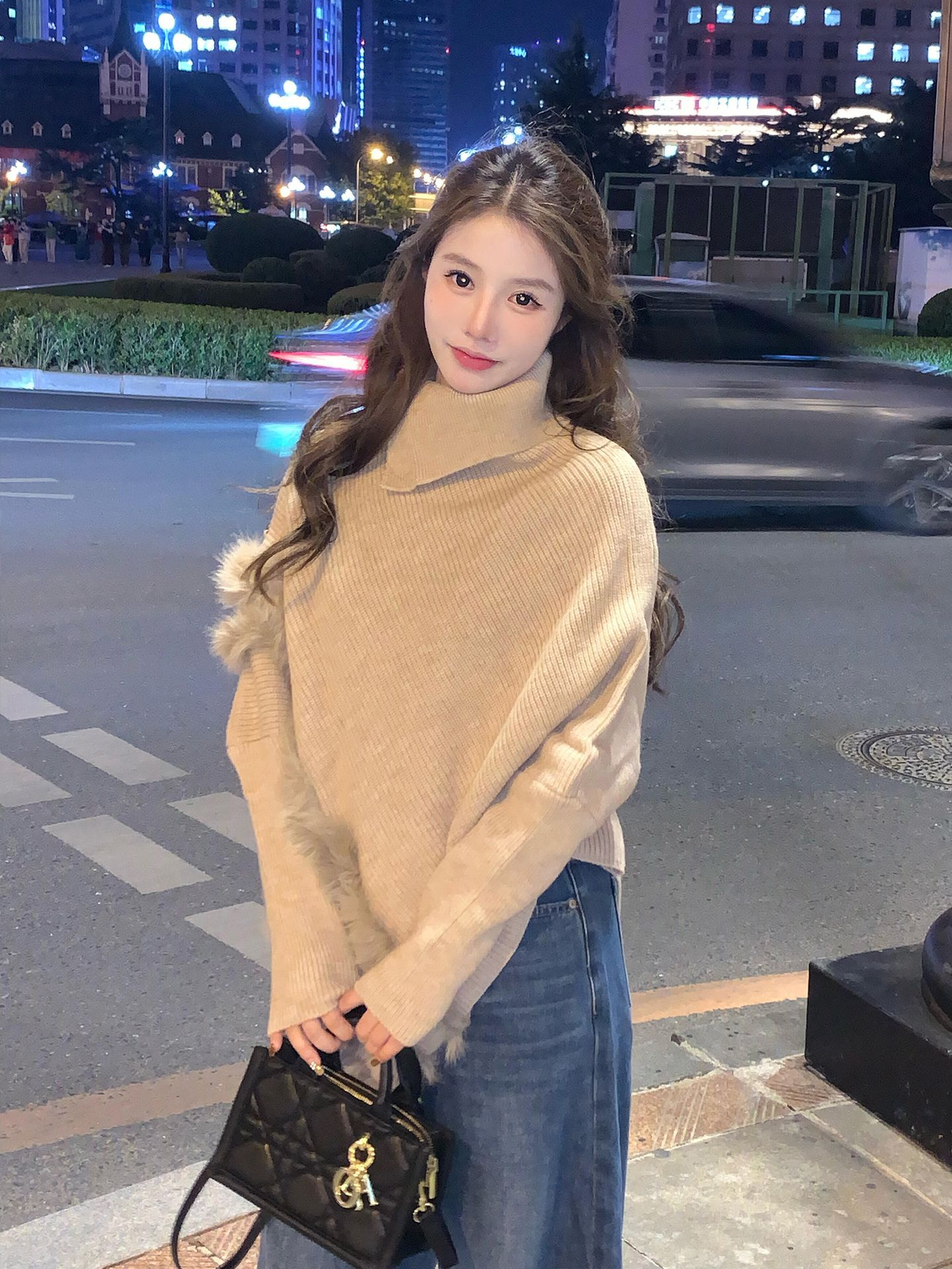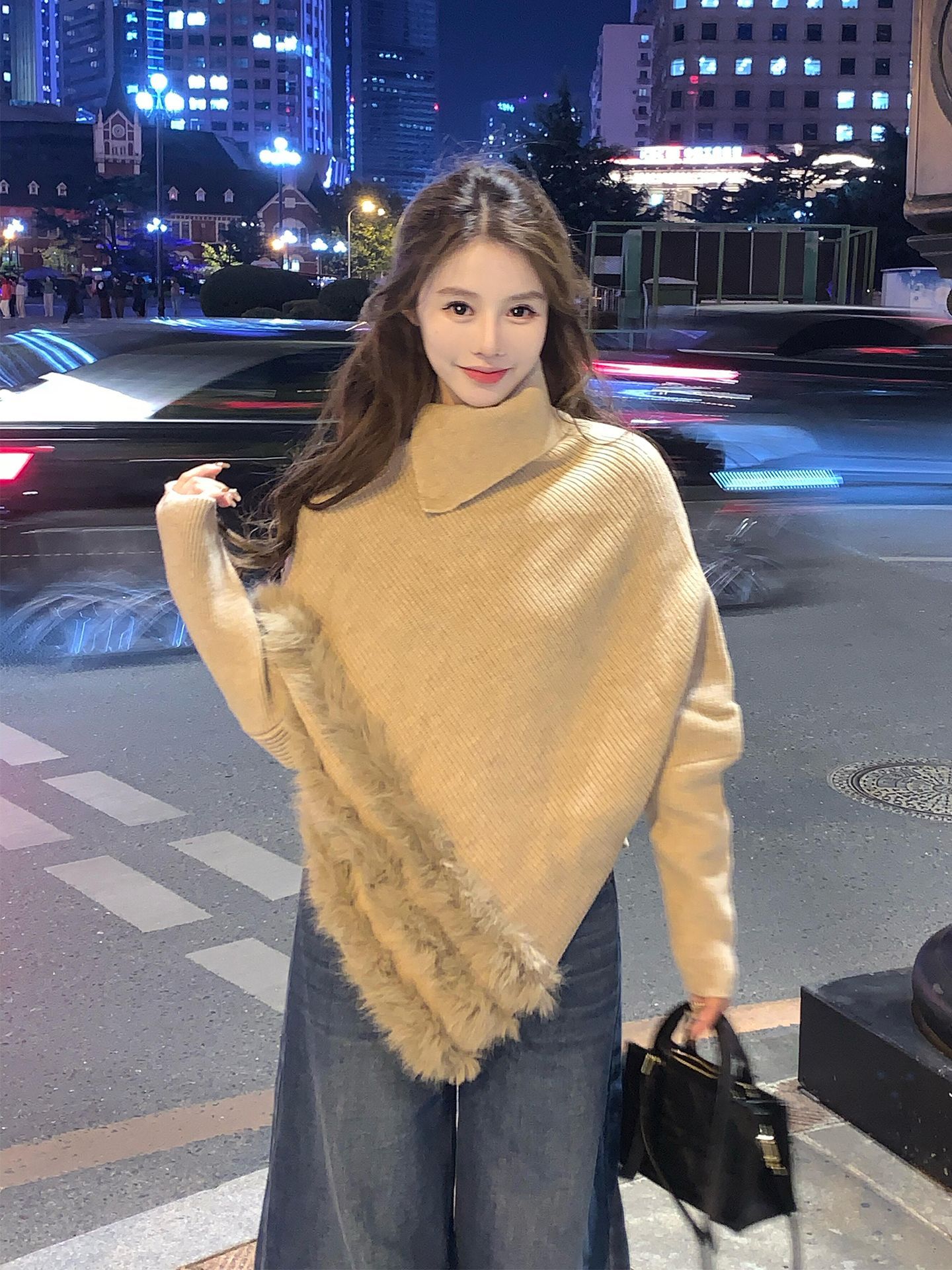 MY16455# 法式卡其色蝙蝠袖高领套头毛衣不规则宽松外穿毛边针织上衣女裝貨源服裝批發