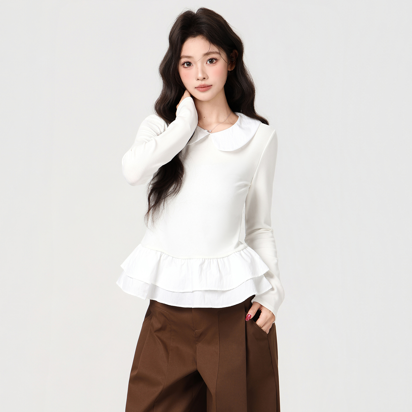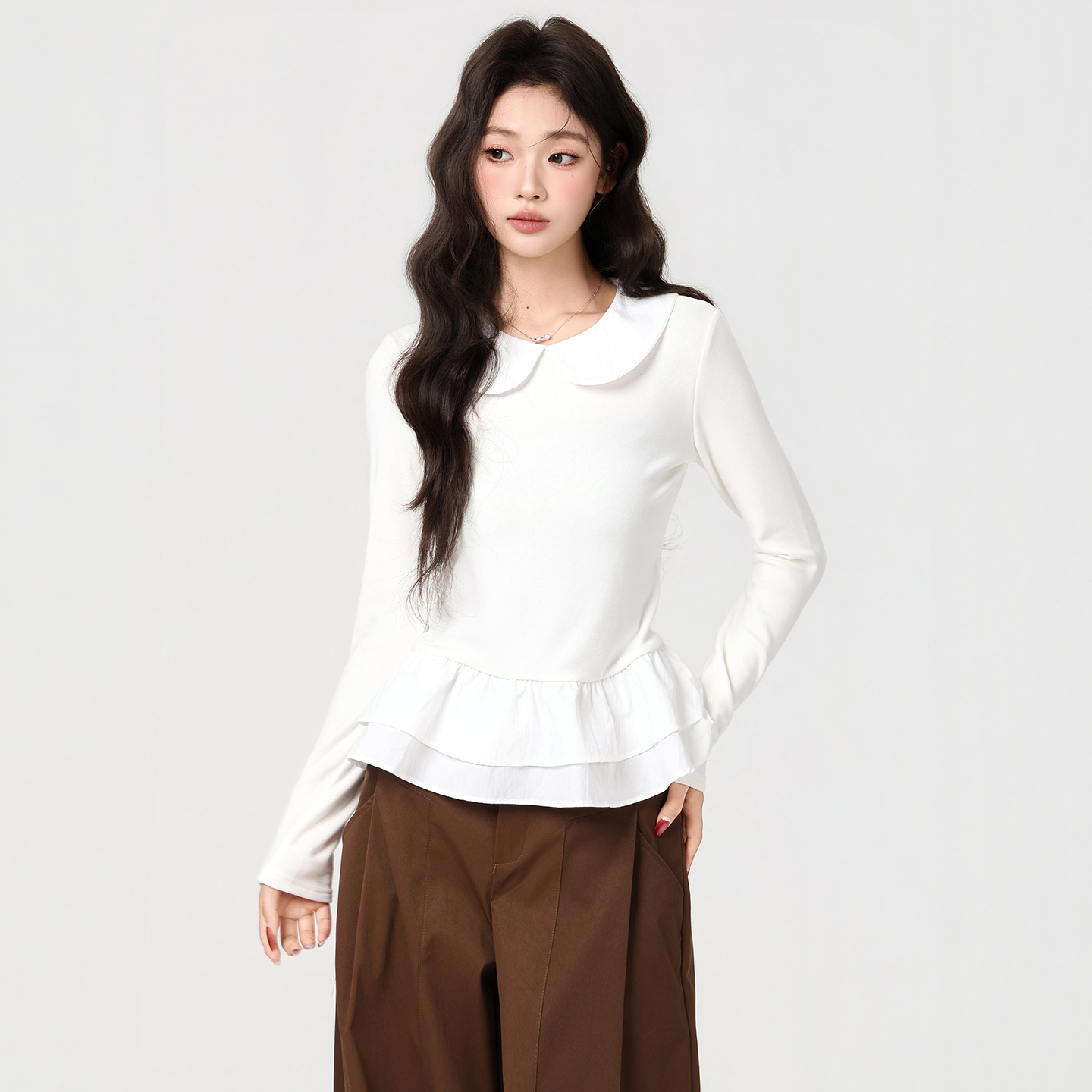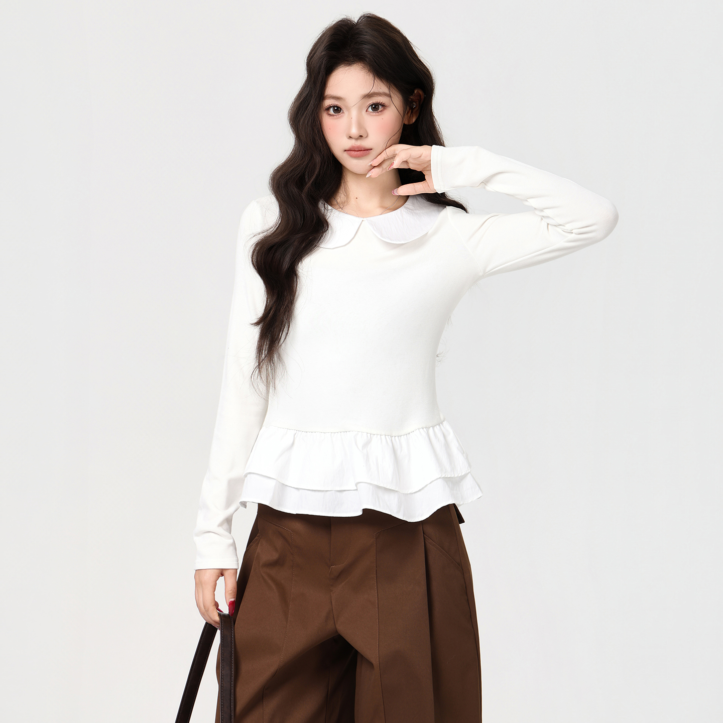 MY16456# 甜美风娃娃领荷叶边下摆长袖T恤收腰显瘦百搭上衣女裝貨源服裝批發