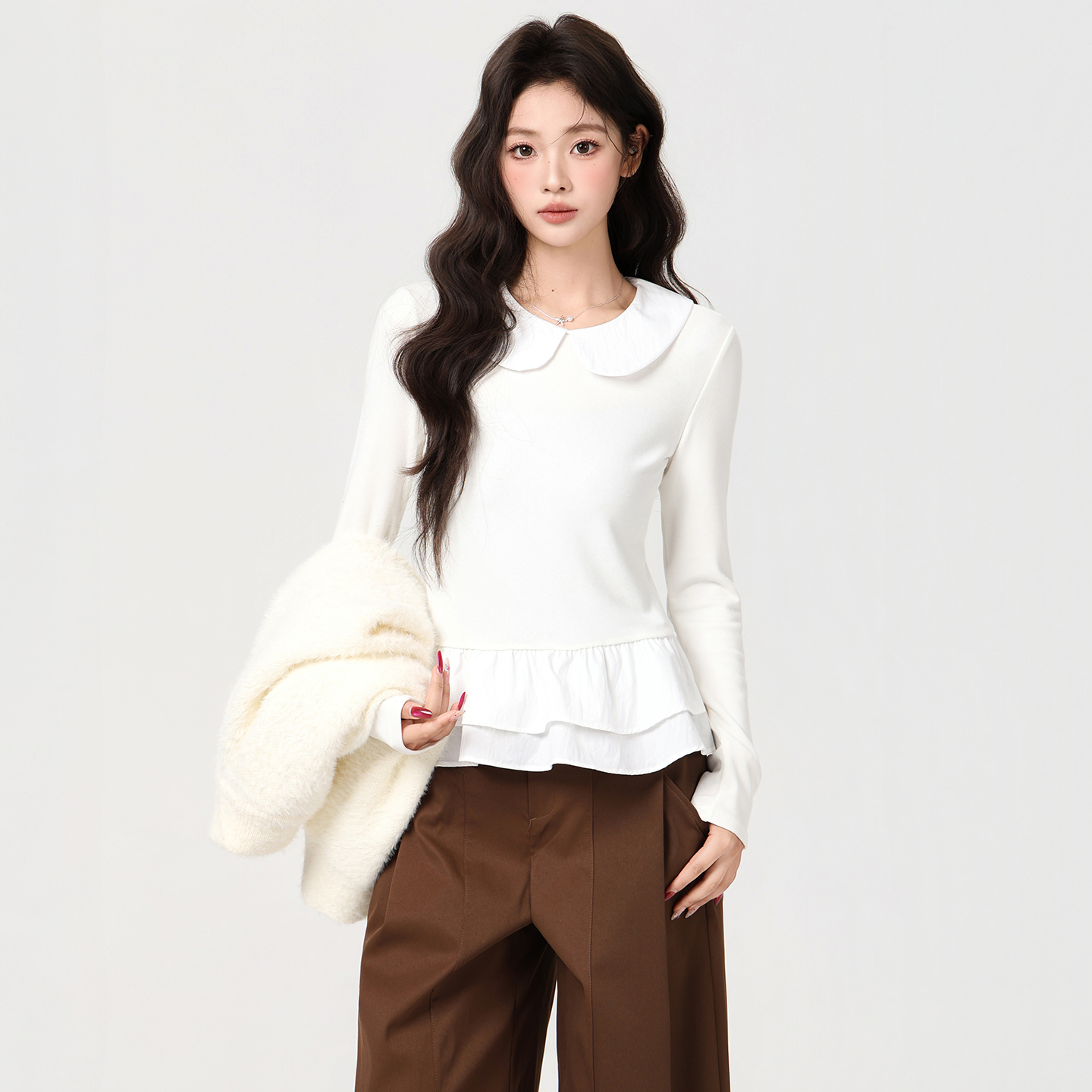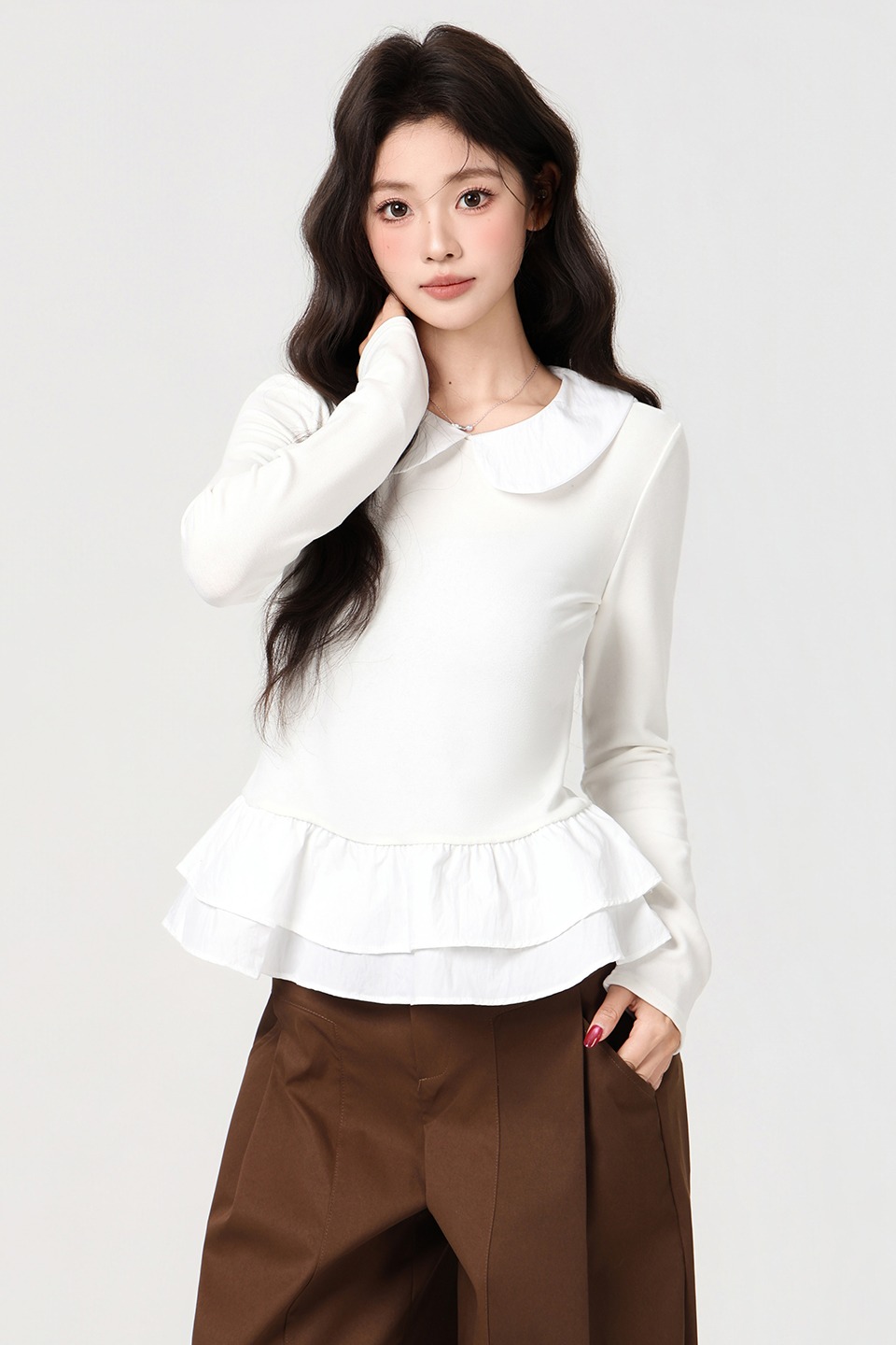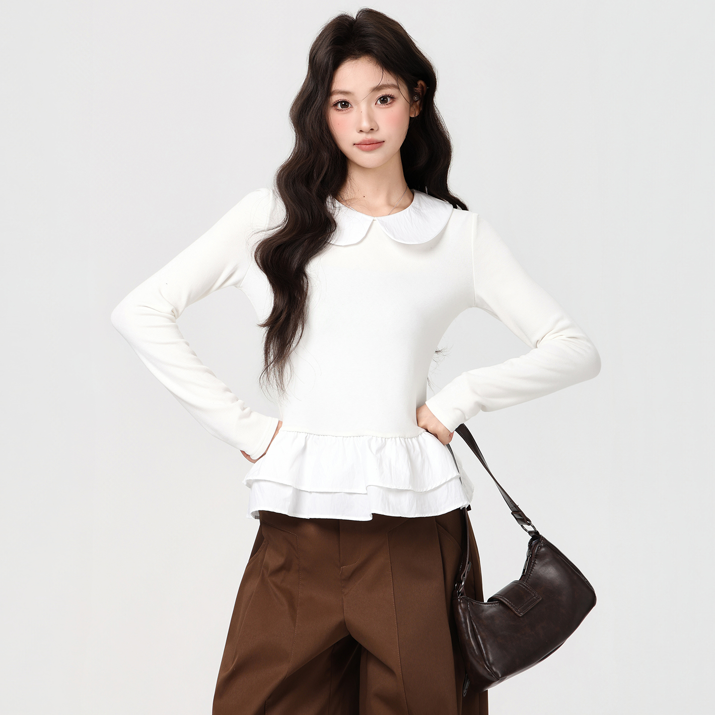 MY16456# 甜美风娃娃领荷叶边下摆长袖T恤收腰显瘦百搭上衣女裝貨源服裝批發
