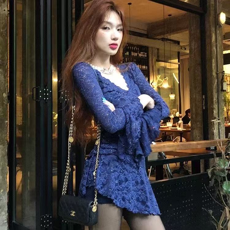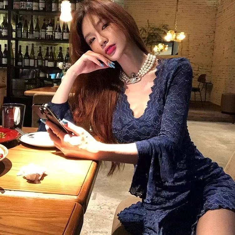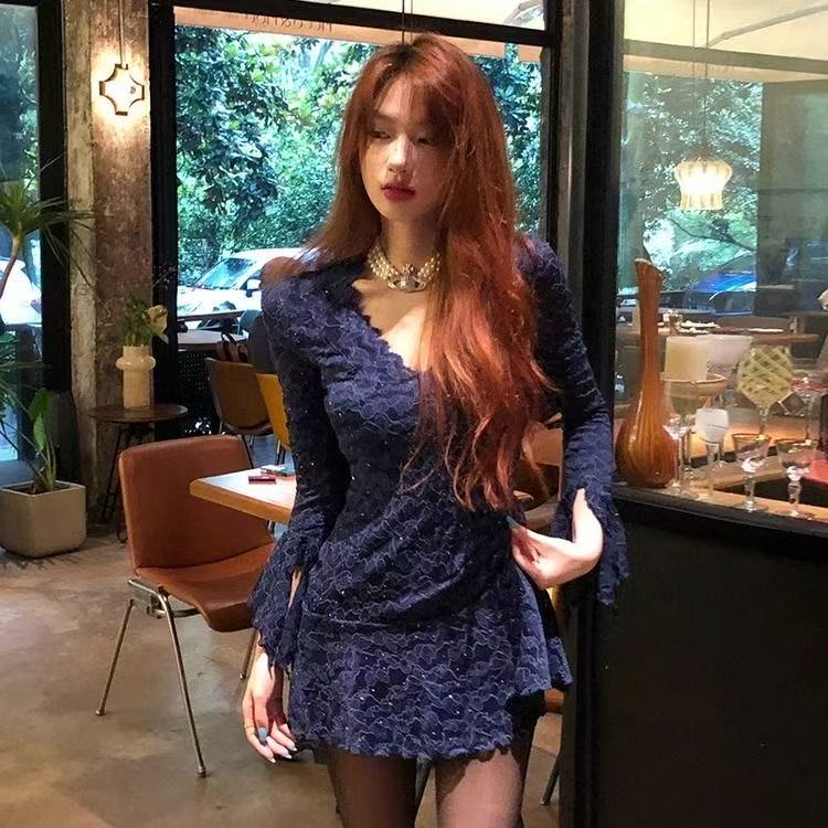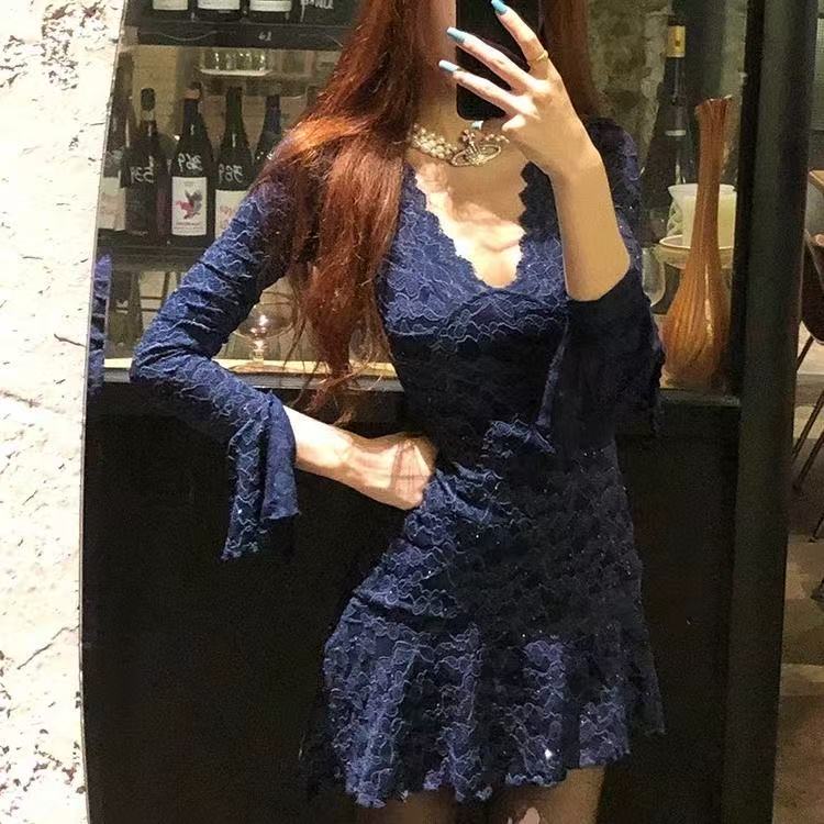 MY16457# 蓝色重工蕾丝连衣裙纯欲性感深v短裙喇叭长袖收腰裙子女裝貨源服裝批發
