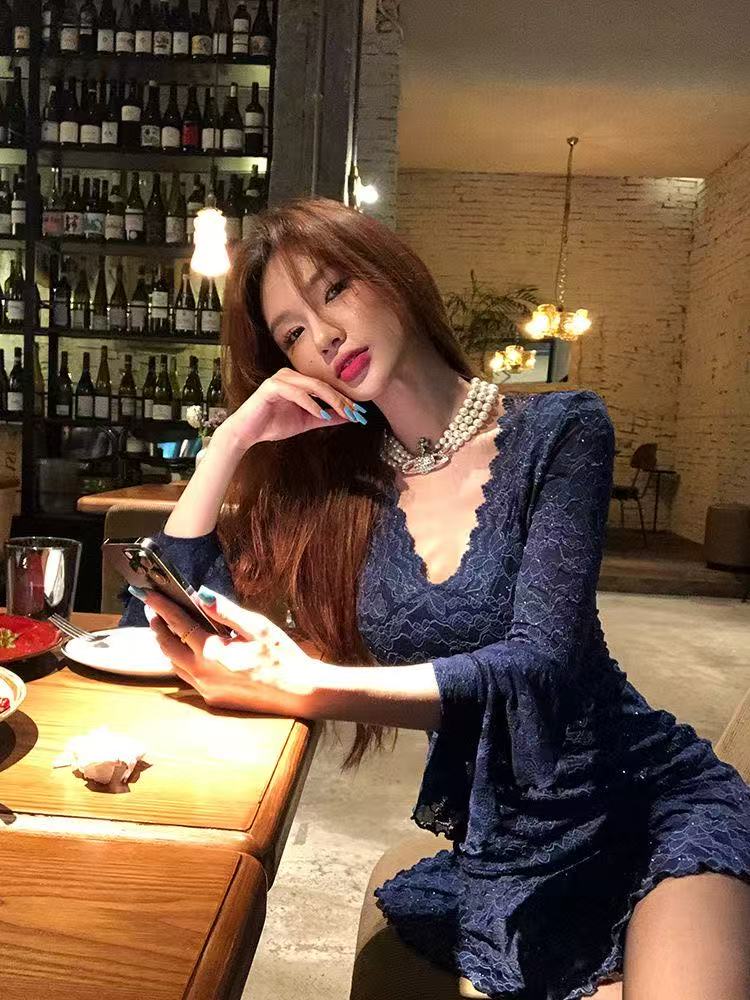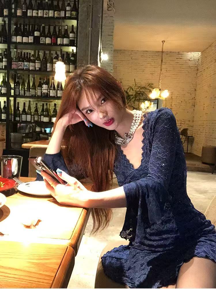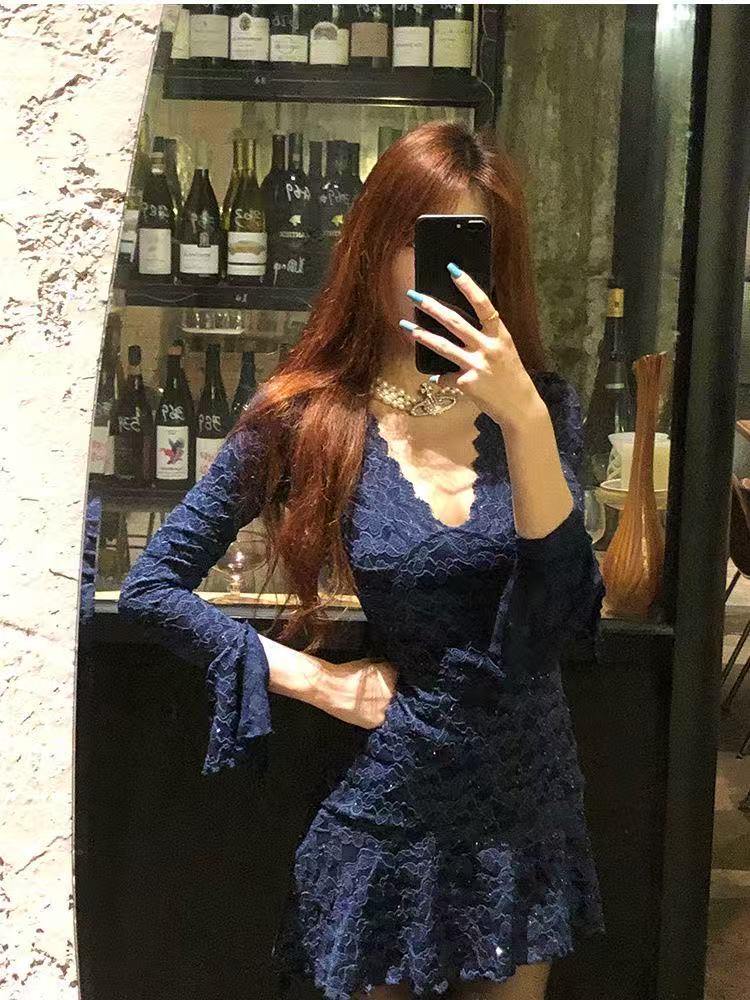 MY16462# 纯欲风蓝色烫钻长袖连衣裙蕾丝拼接短裙v领收腰修身a字裙子女裝貨源服裝批發
