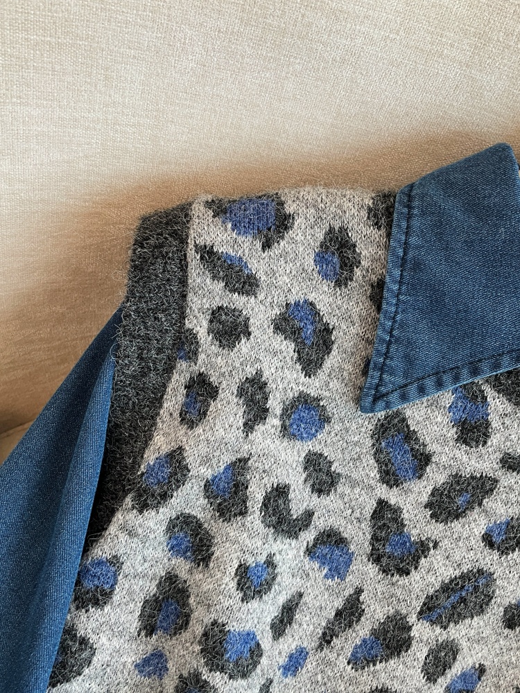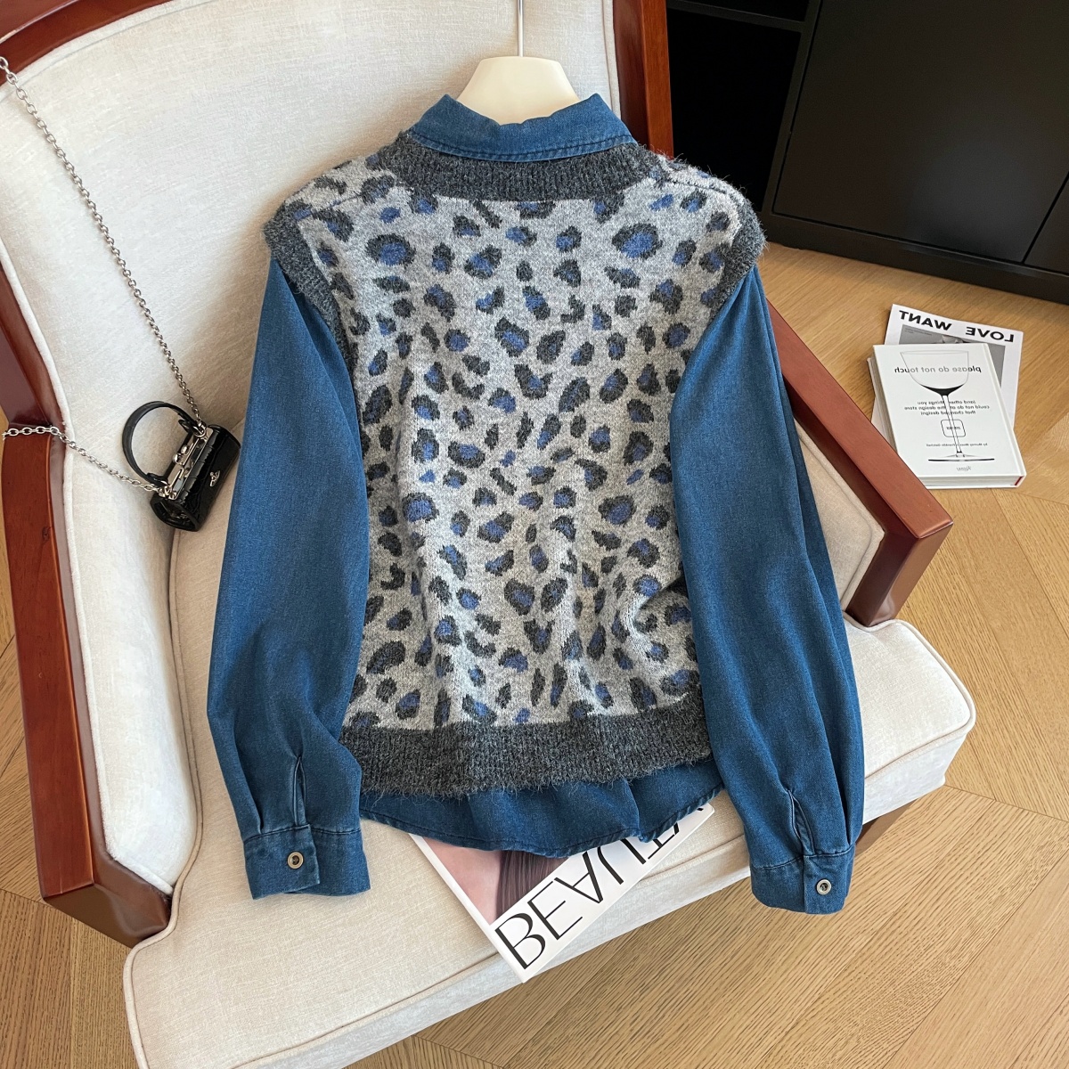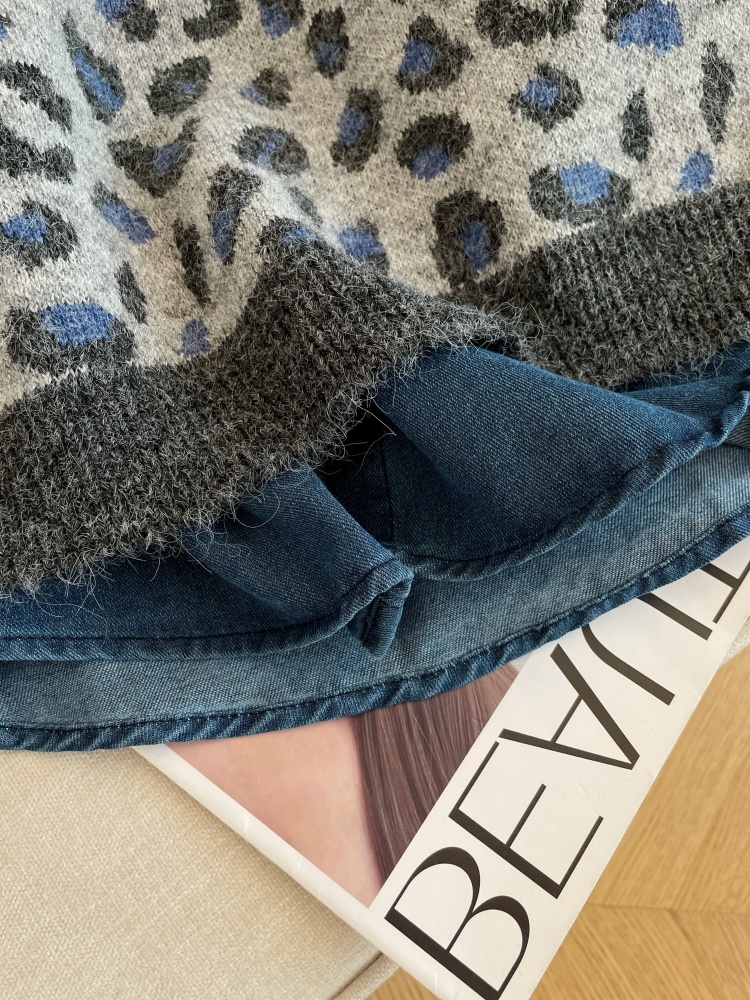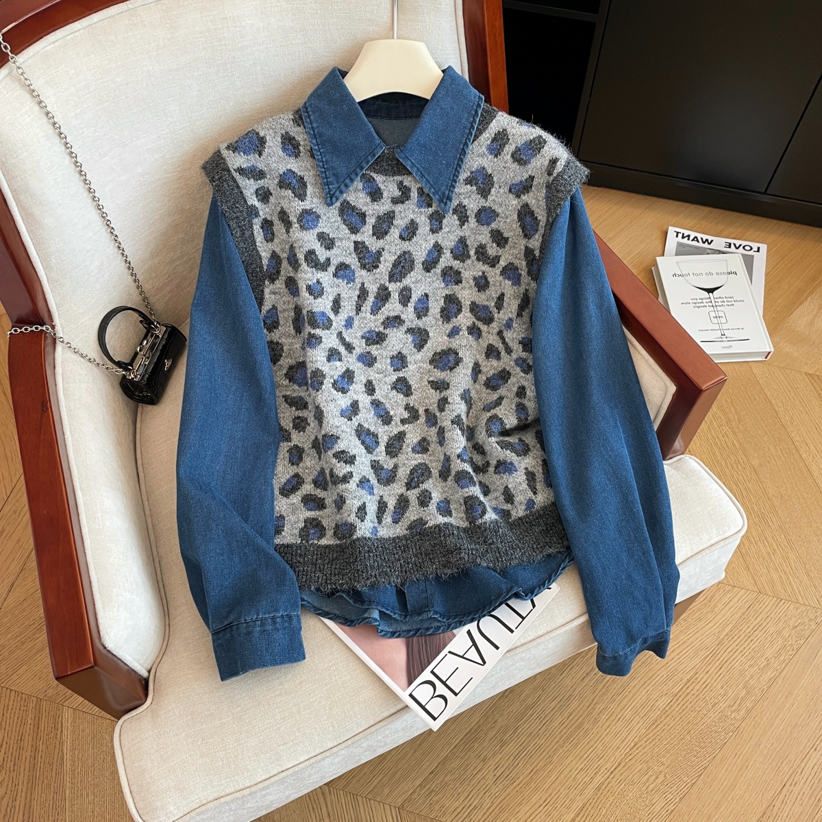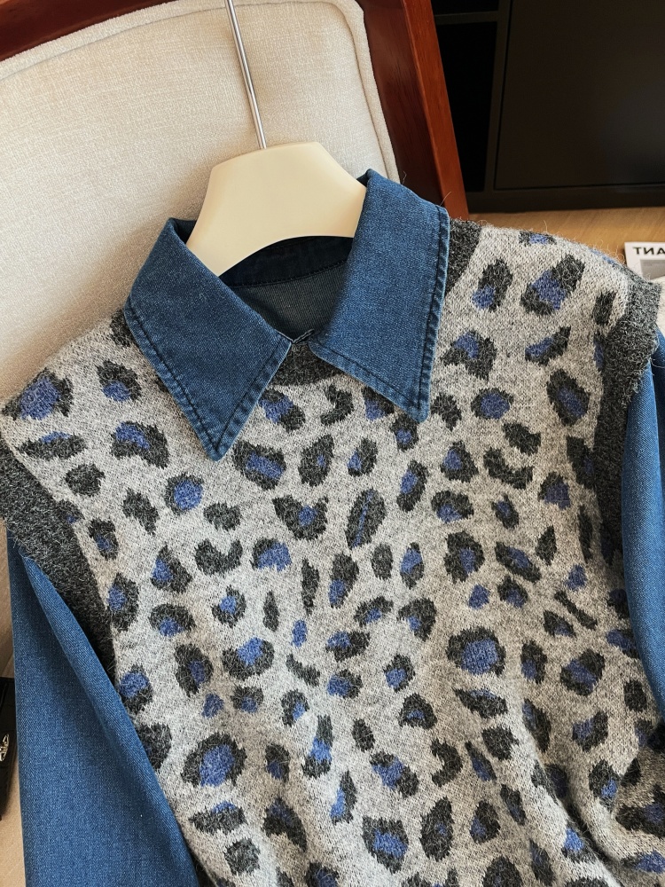 MY16549# 性感豹纹马甲叠穿牛仔衬衫套装女秋冬新款洋气显瘦宽松两件套女裝貨源服裝批發