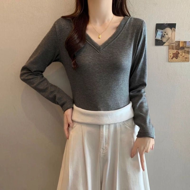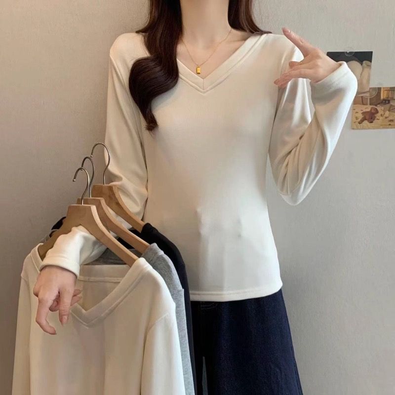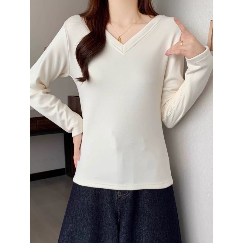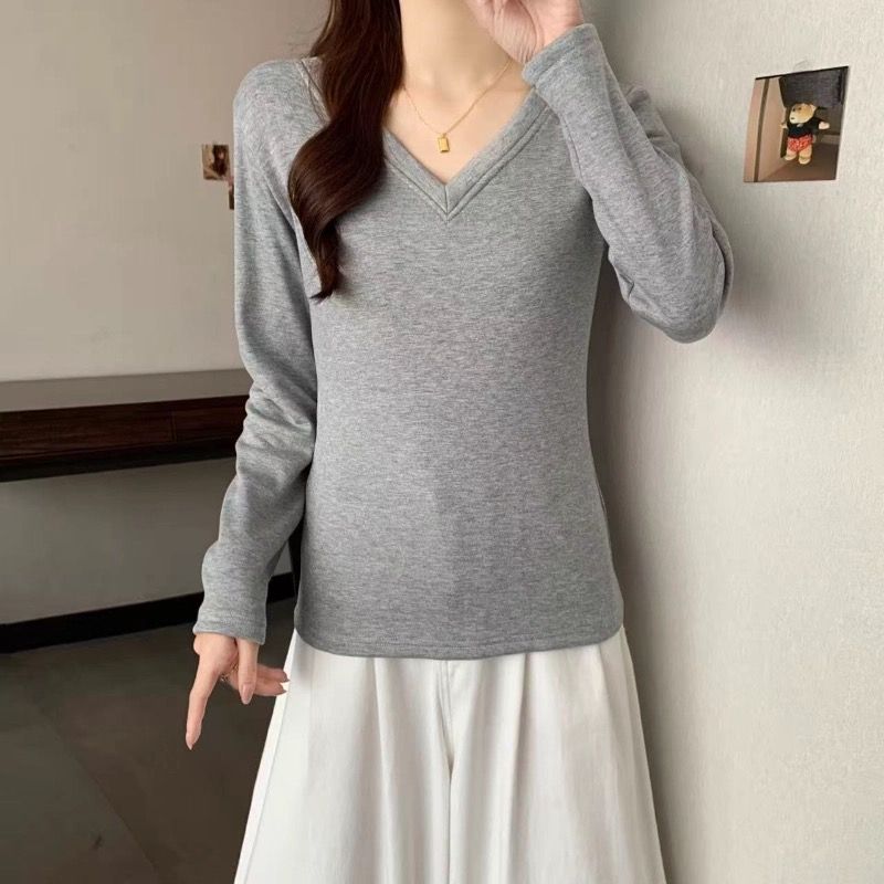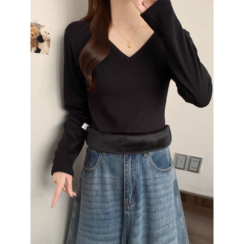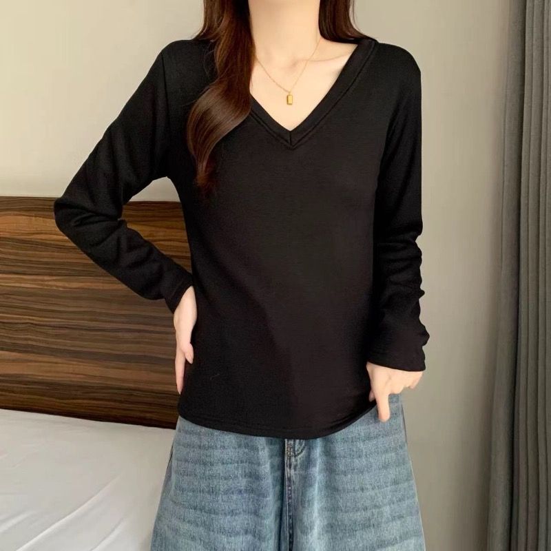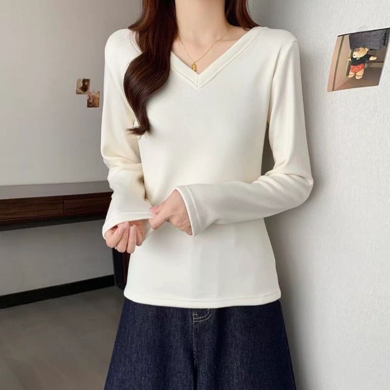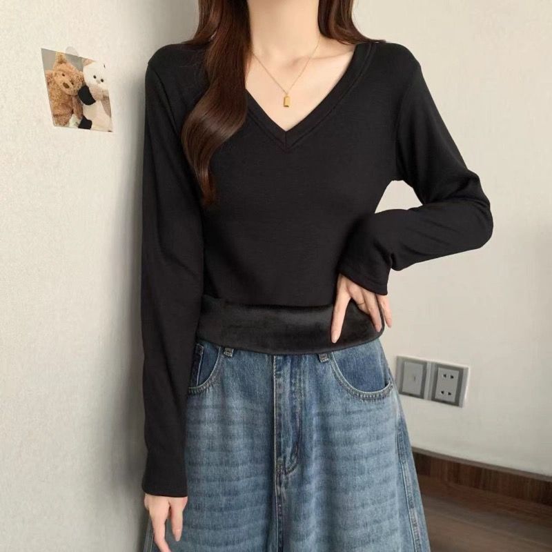 MY16555# 银狐绒加厚长袖v领修身打底衫女秋冬季大码保暖内衣T恤上衣女裝貨源服裝批發