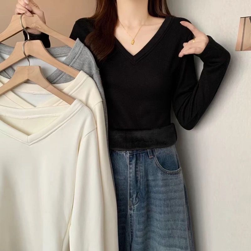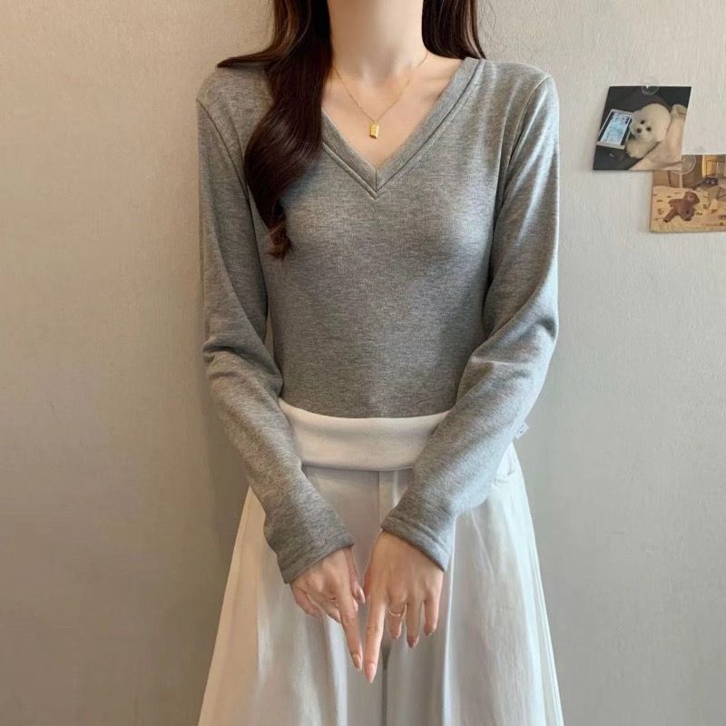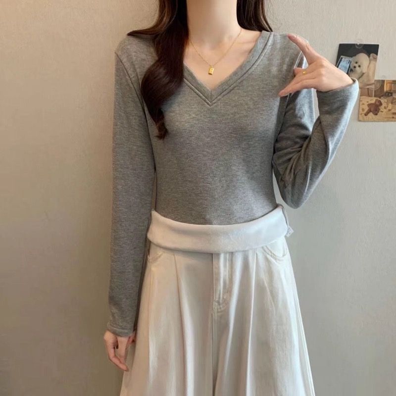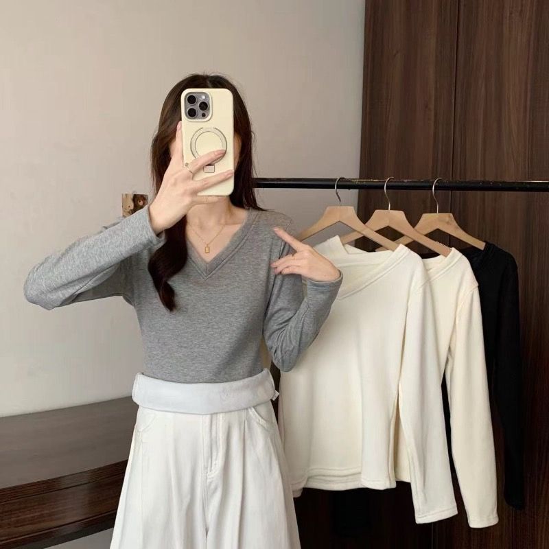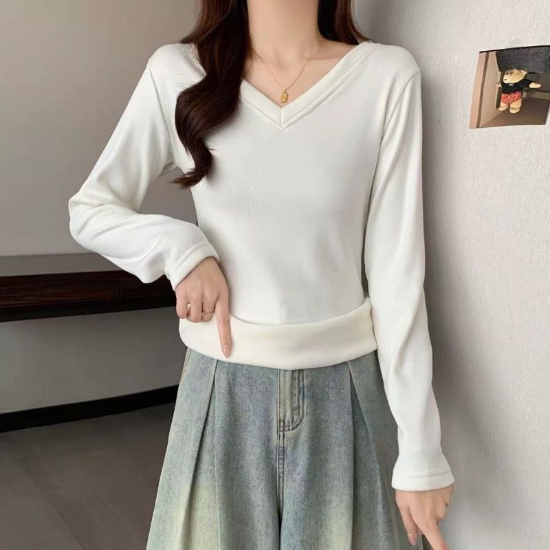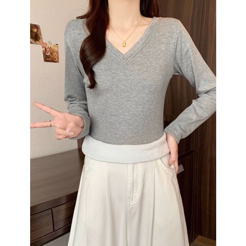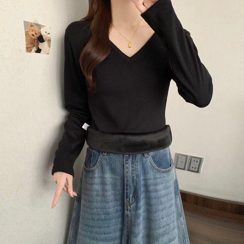 MY16555# 银狐绒加厚长袖v领修身打底衫女秋冬季大码保暖内衣T恤上衣女裝貨源服裝批發