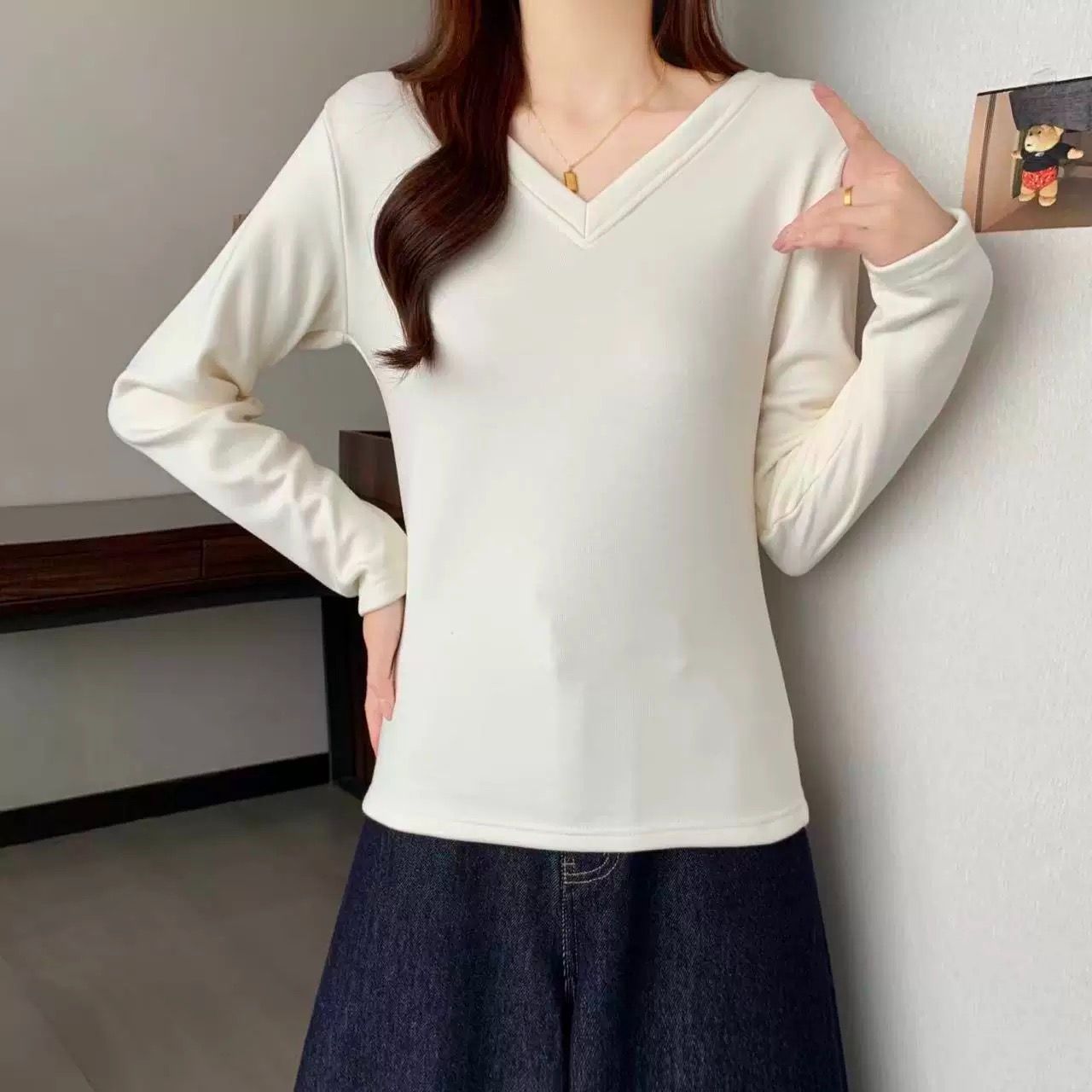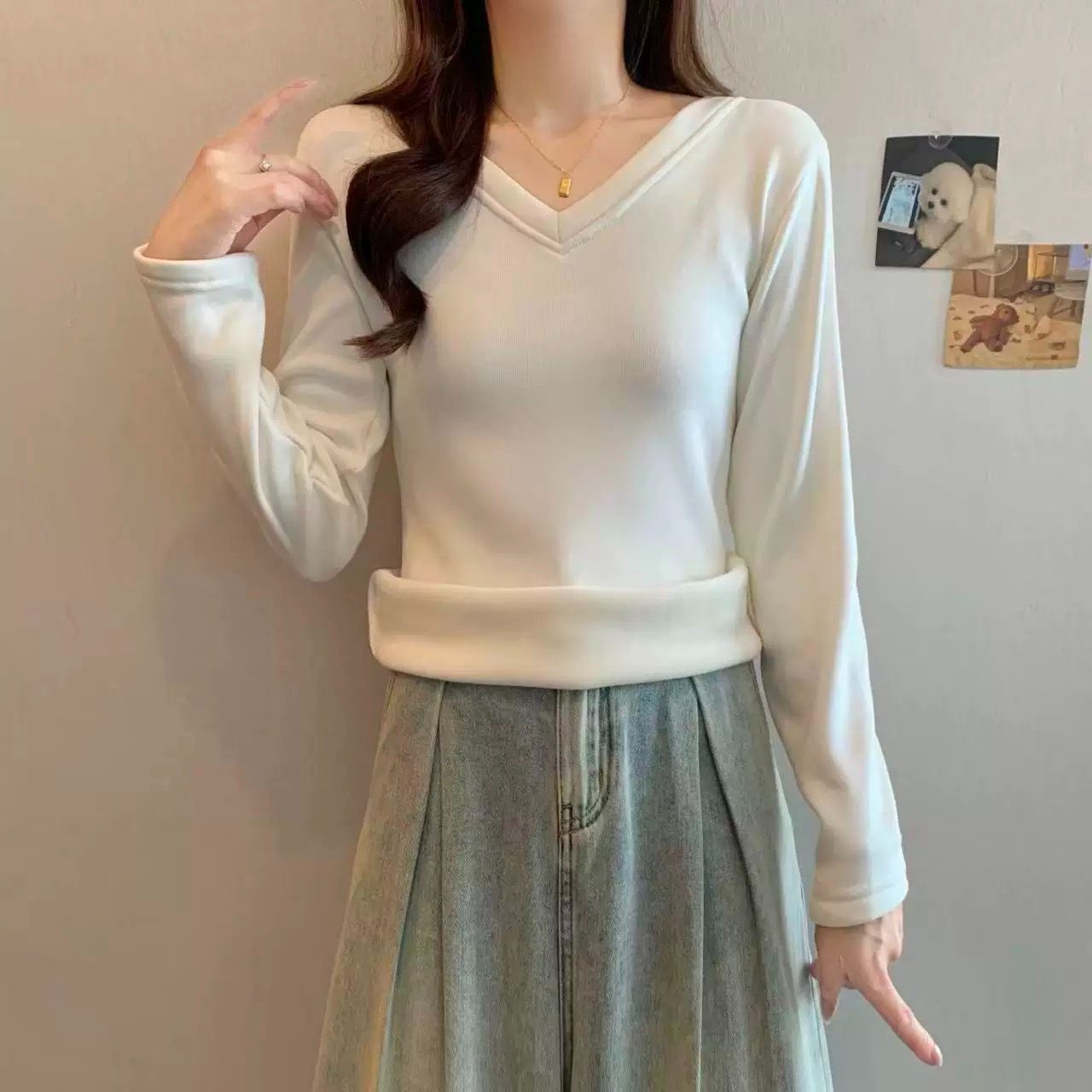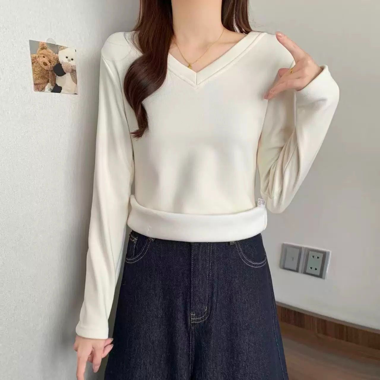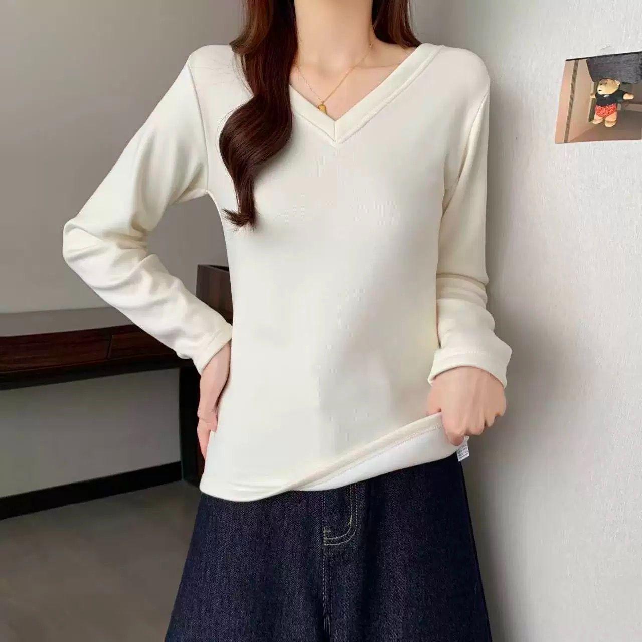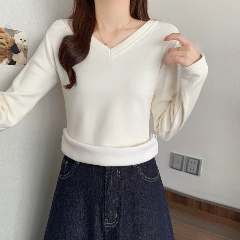 MY16555# 银狐绒加厚长袖v领修身打底衫女秋冬季大码保暖内衣T恤上衣女裝貨源服裝批發