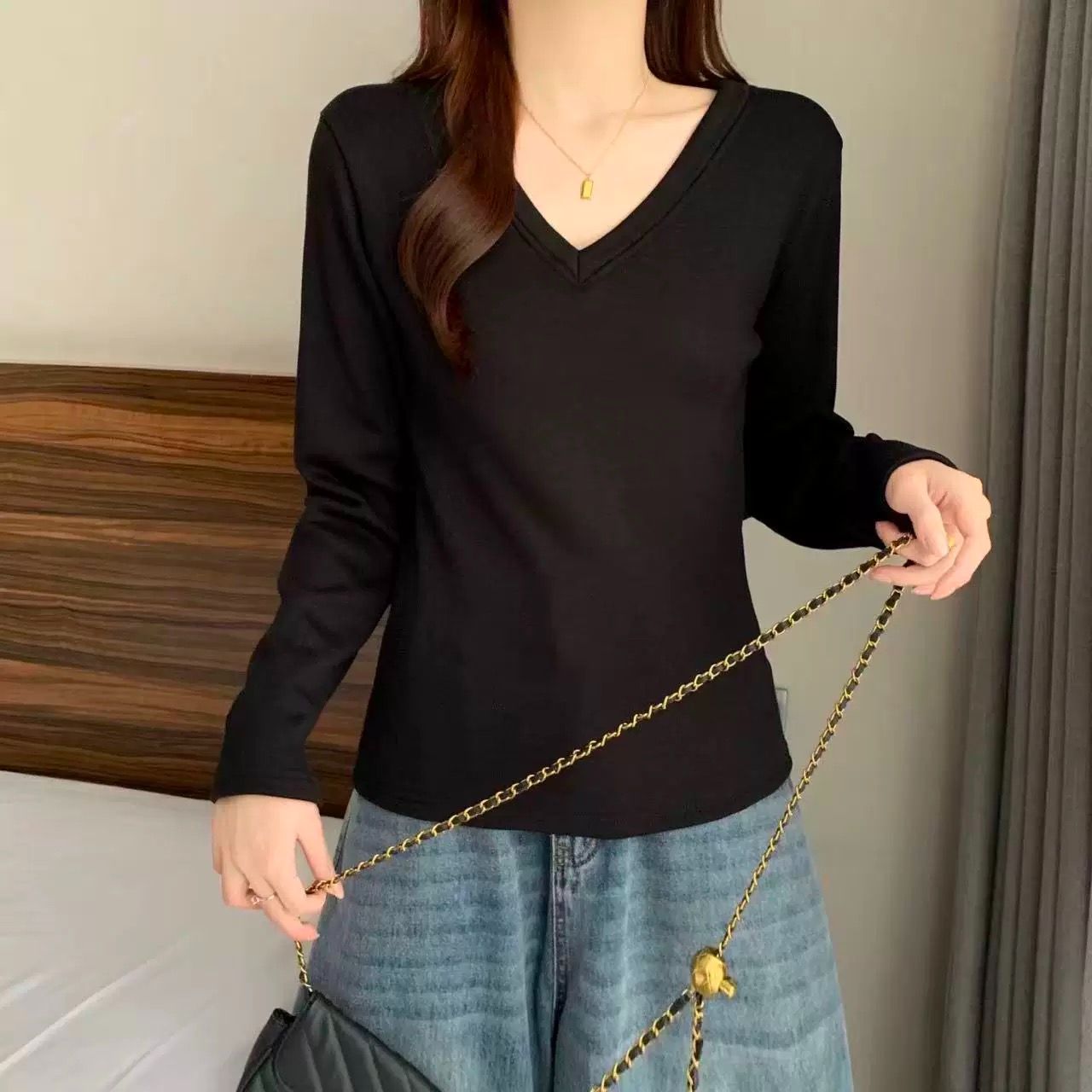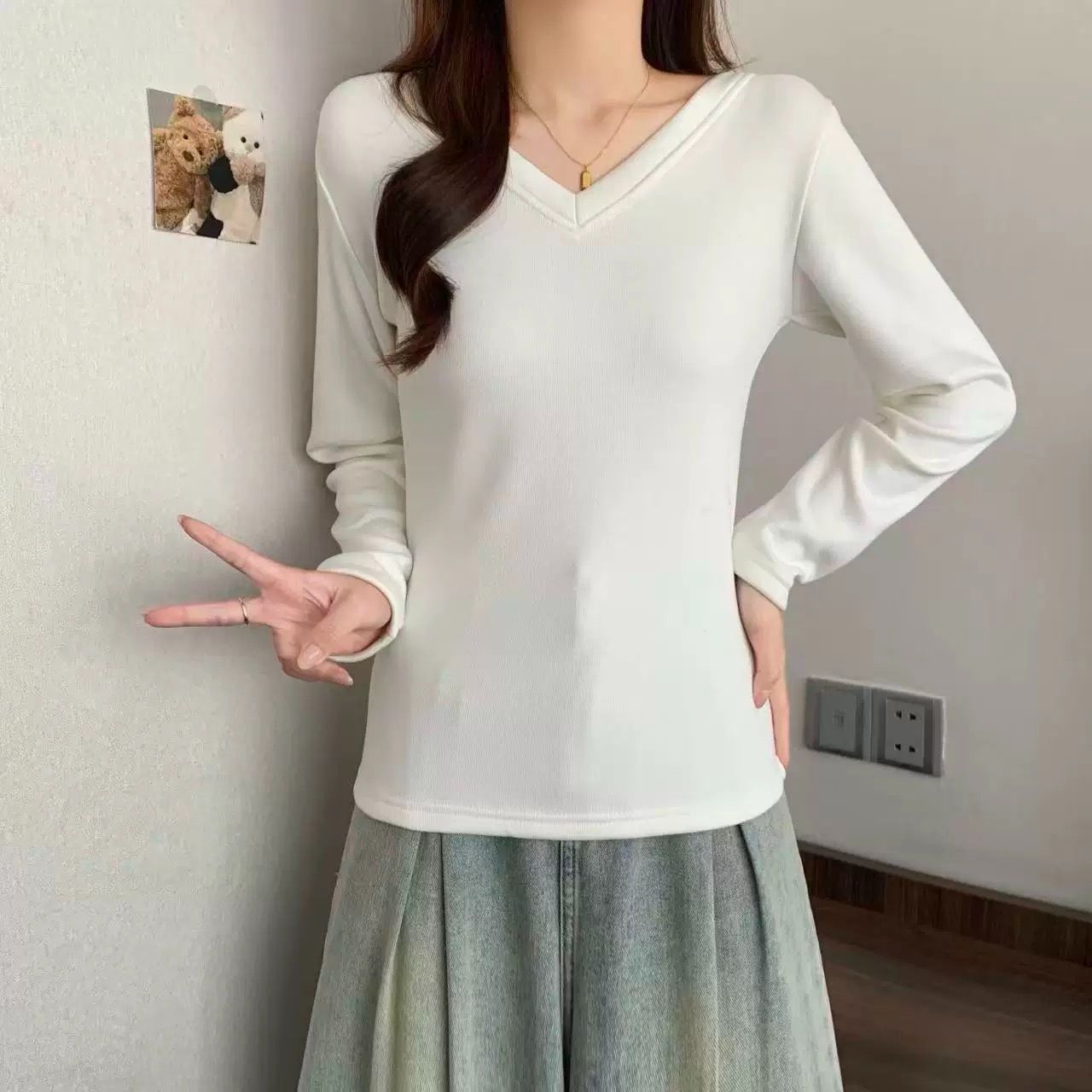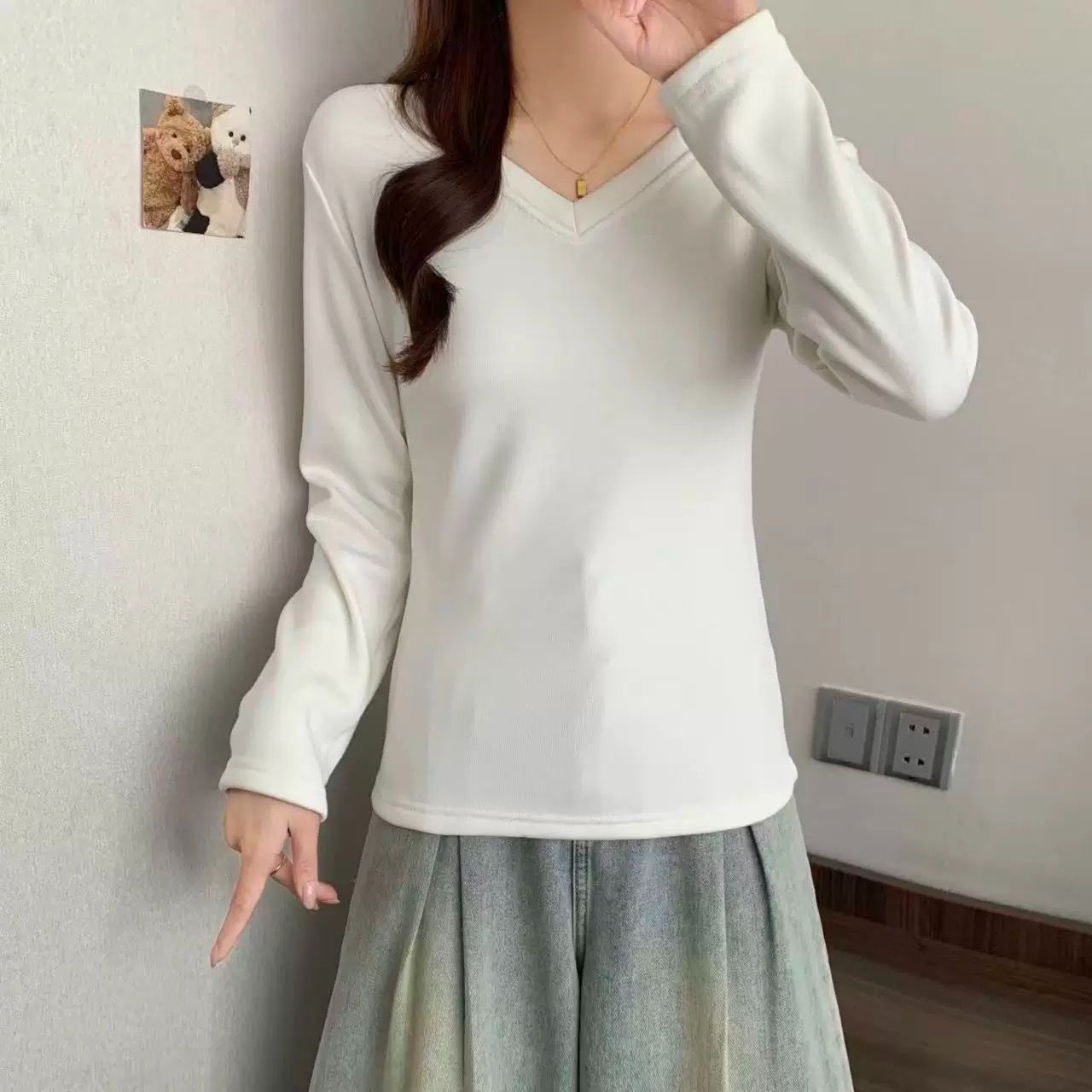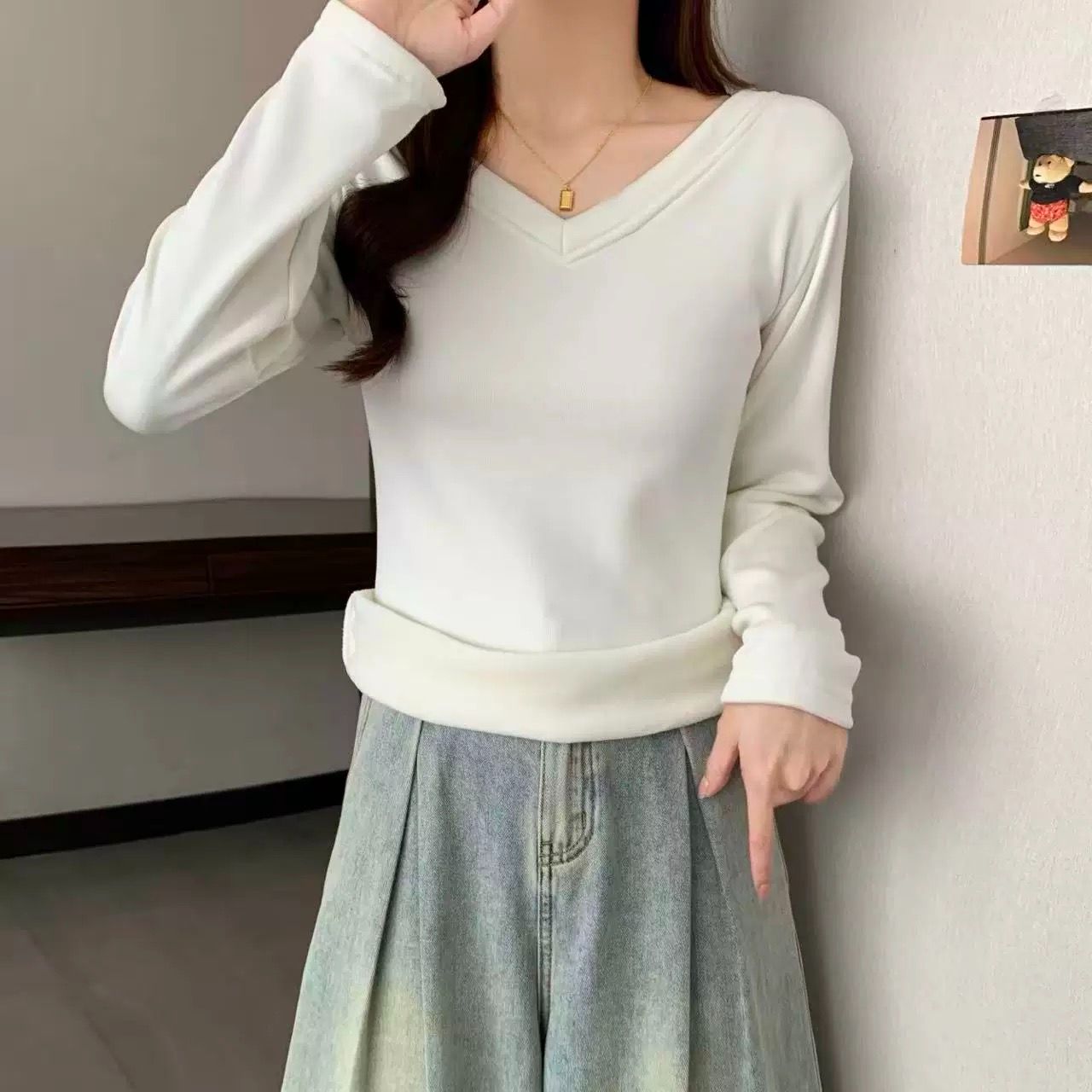 MY16555# 银狐绒加厚长袖v领修身打底衫女秋冬季大码保暖内衣T恤上衣女裝貨源服裝批發
