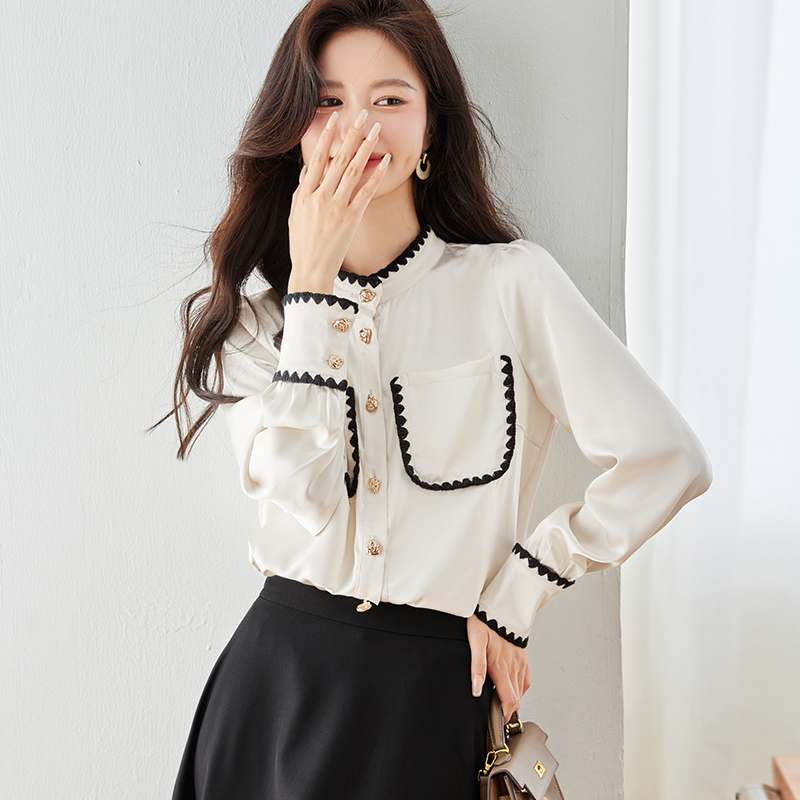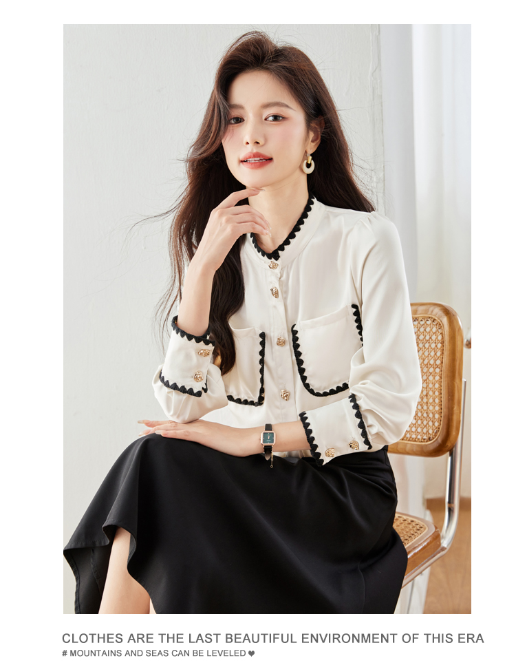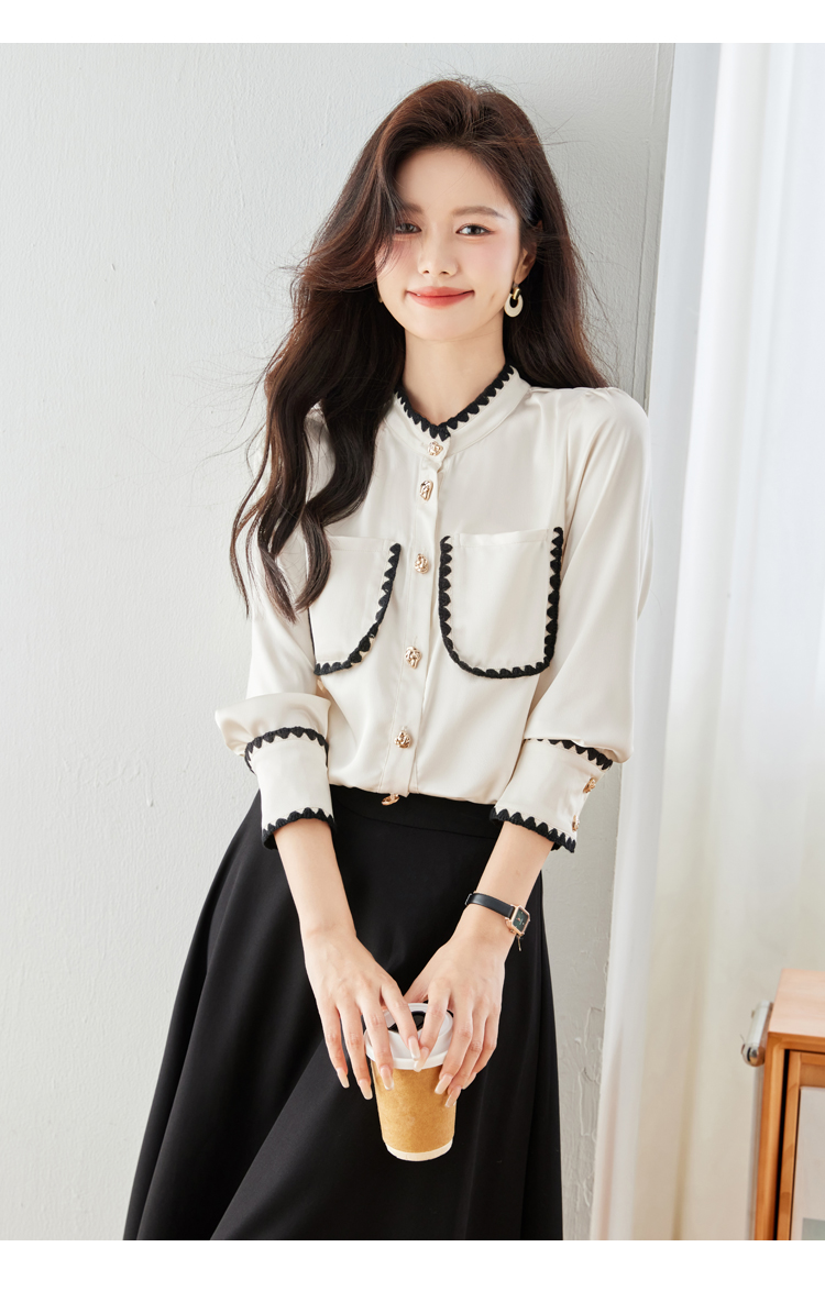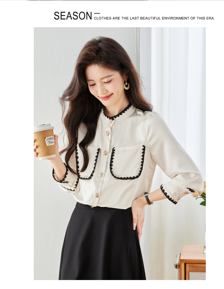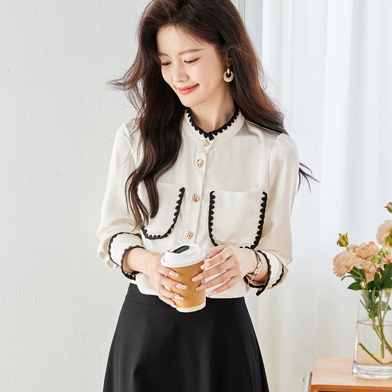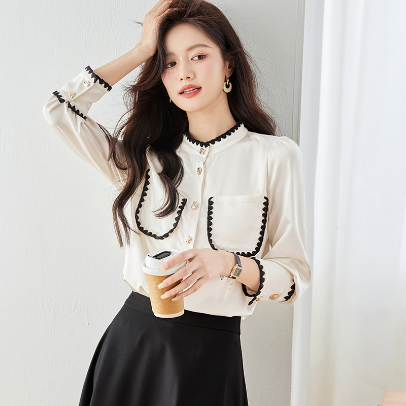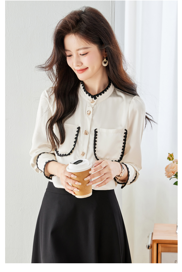 MY16572# 新款撞色边立领小香风衬衫女设计感小众百搭简约上衣女裝貨源服裝批發