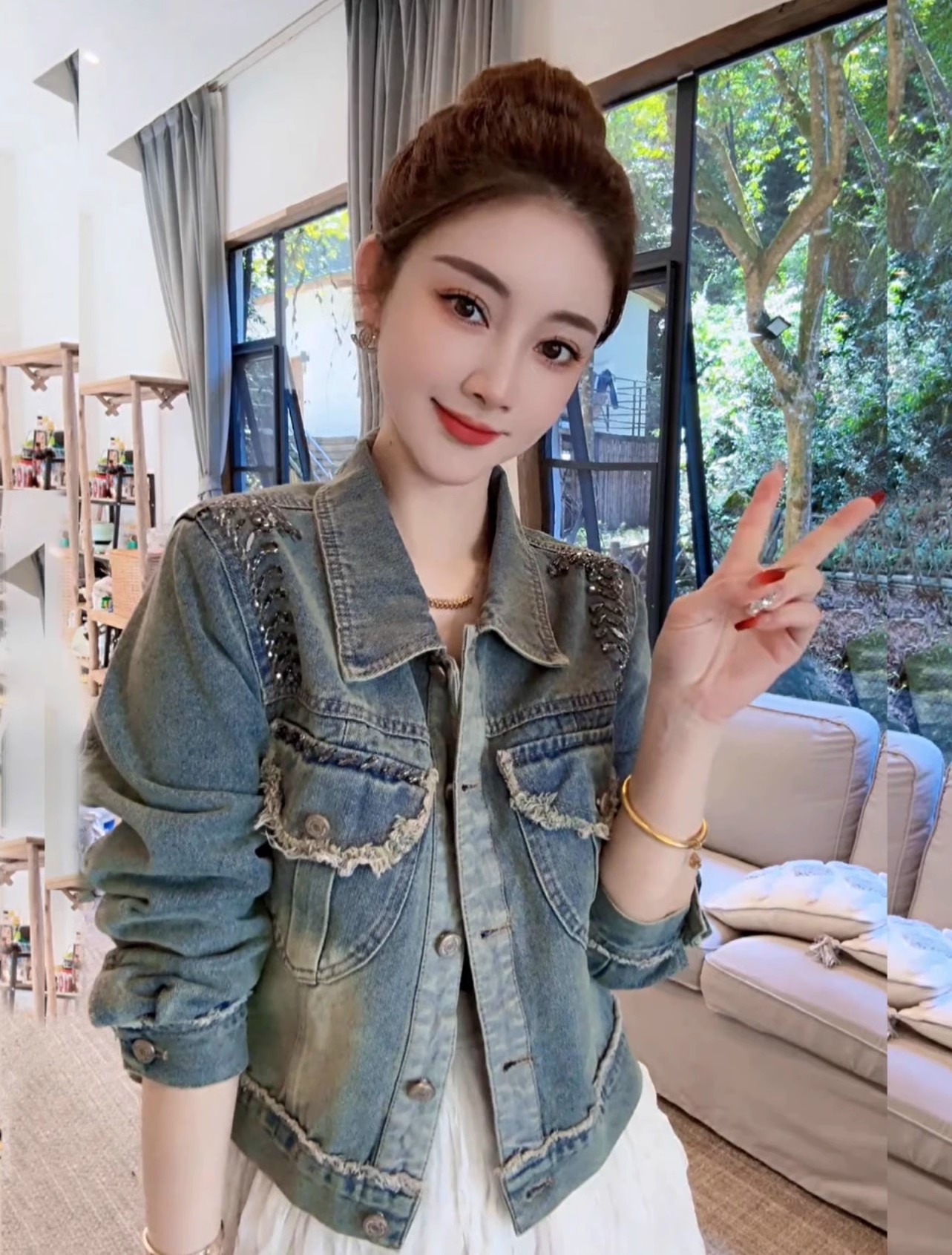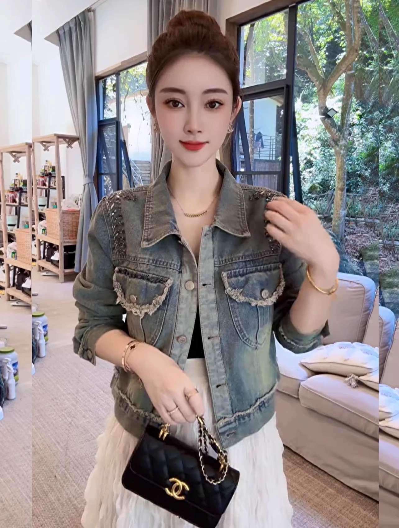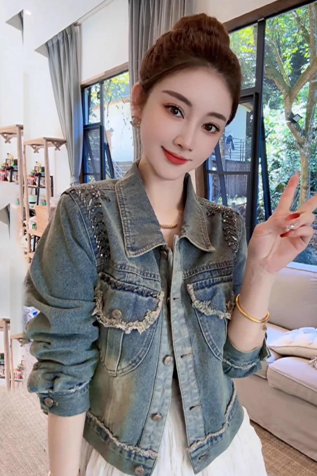 MY16577# 欧货设计感破边流苏工艺钻扣牛仔外套新款复古夹克上衣女裝貨源服裝批發