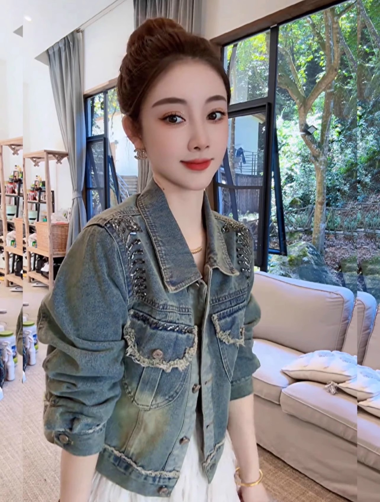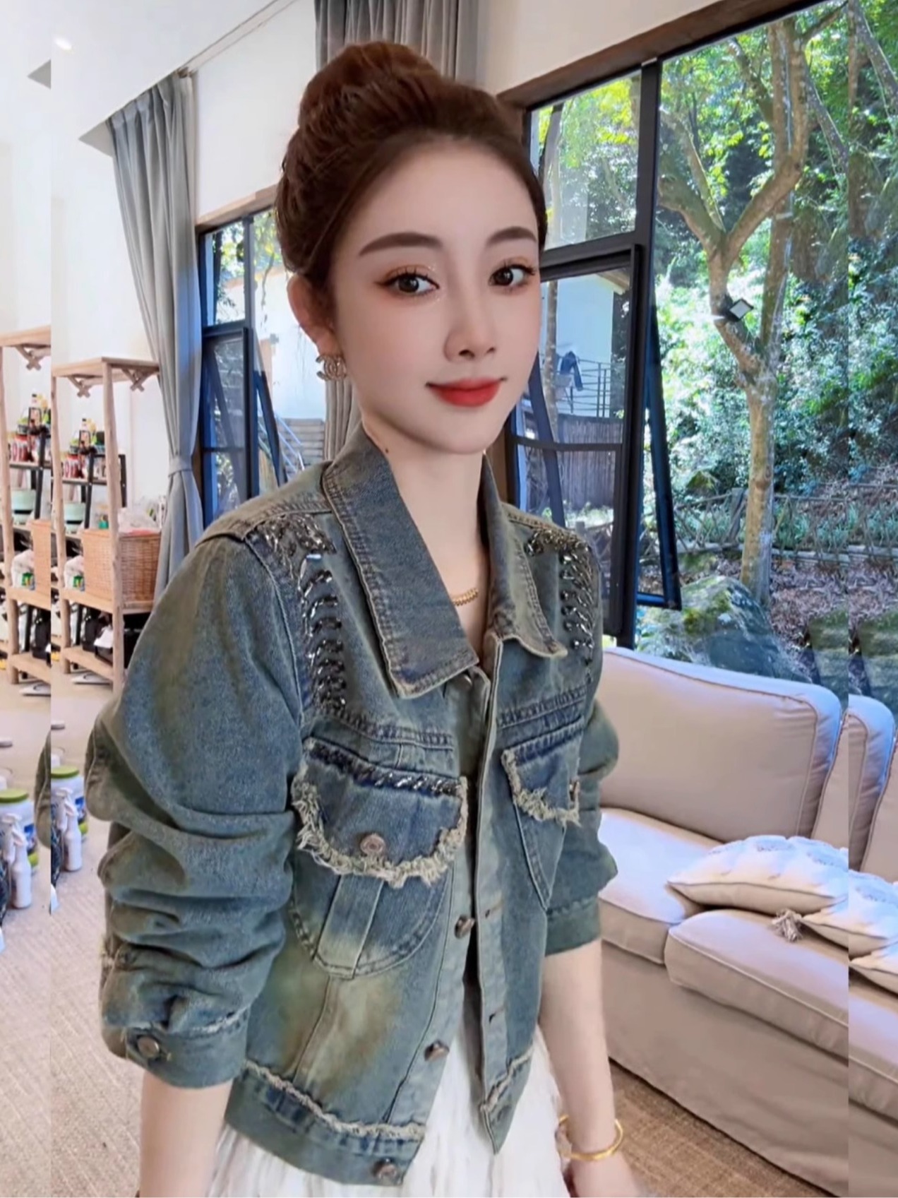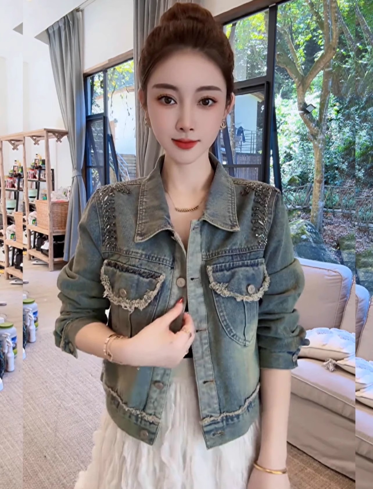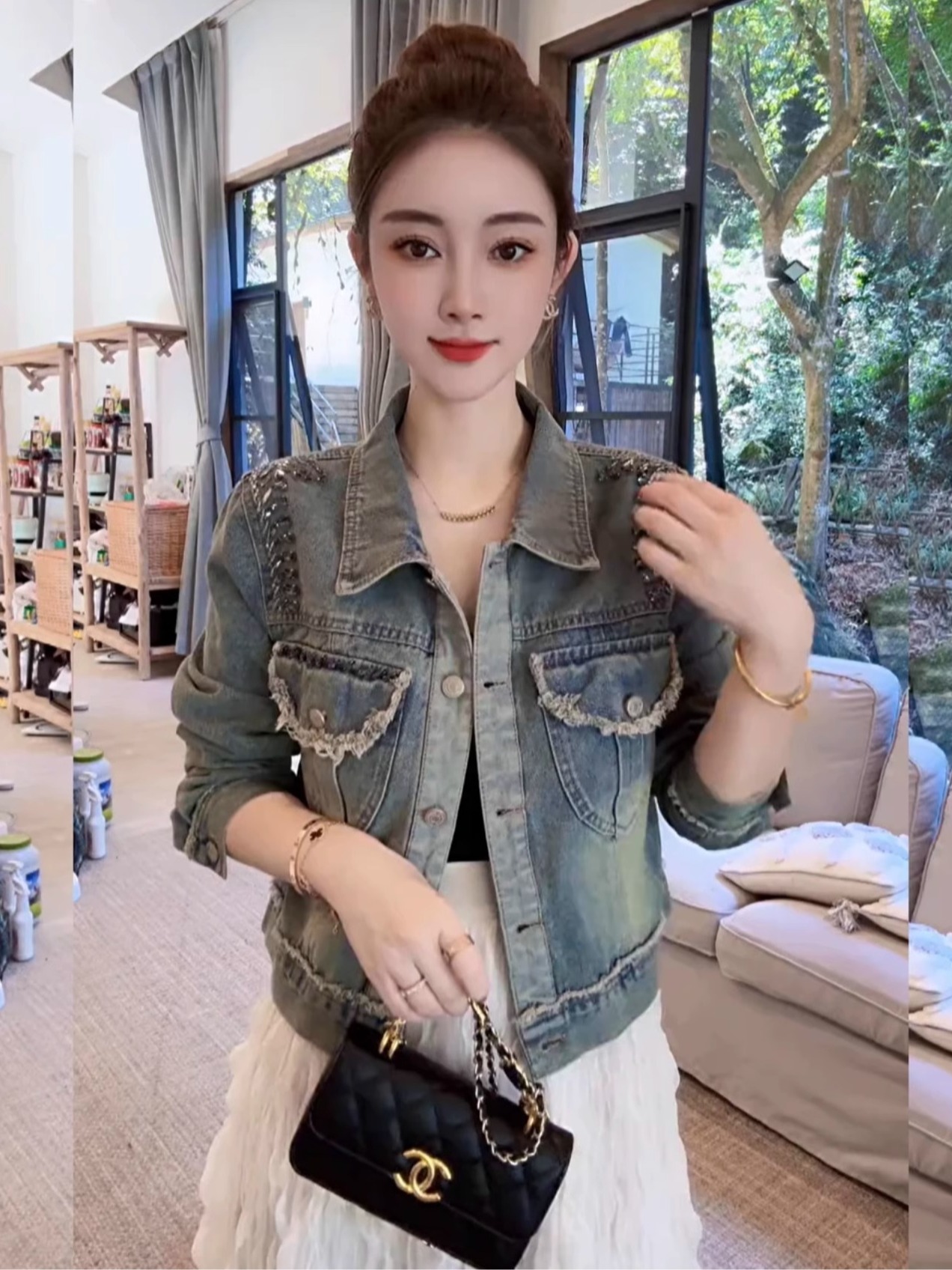 MY16577# 欧货设计感破边流苏工艺钻扣牛仔外套新款复古夹克上衣女裝貨源服裝批發