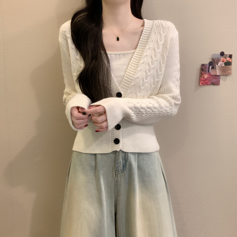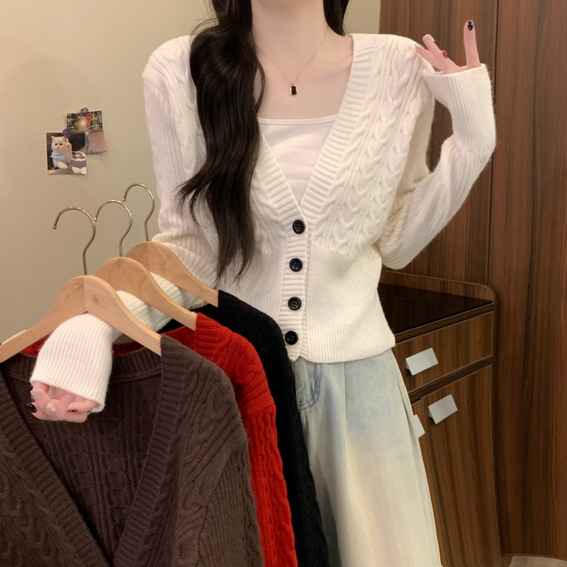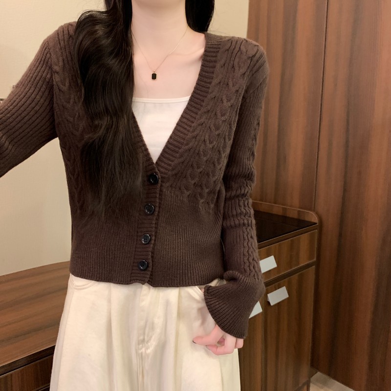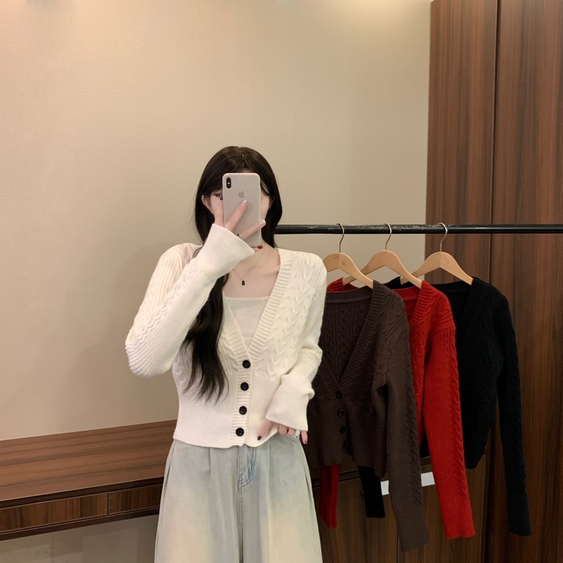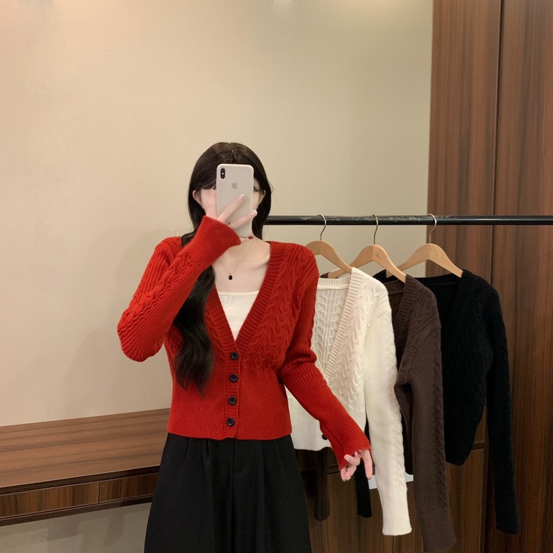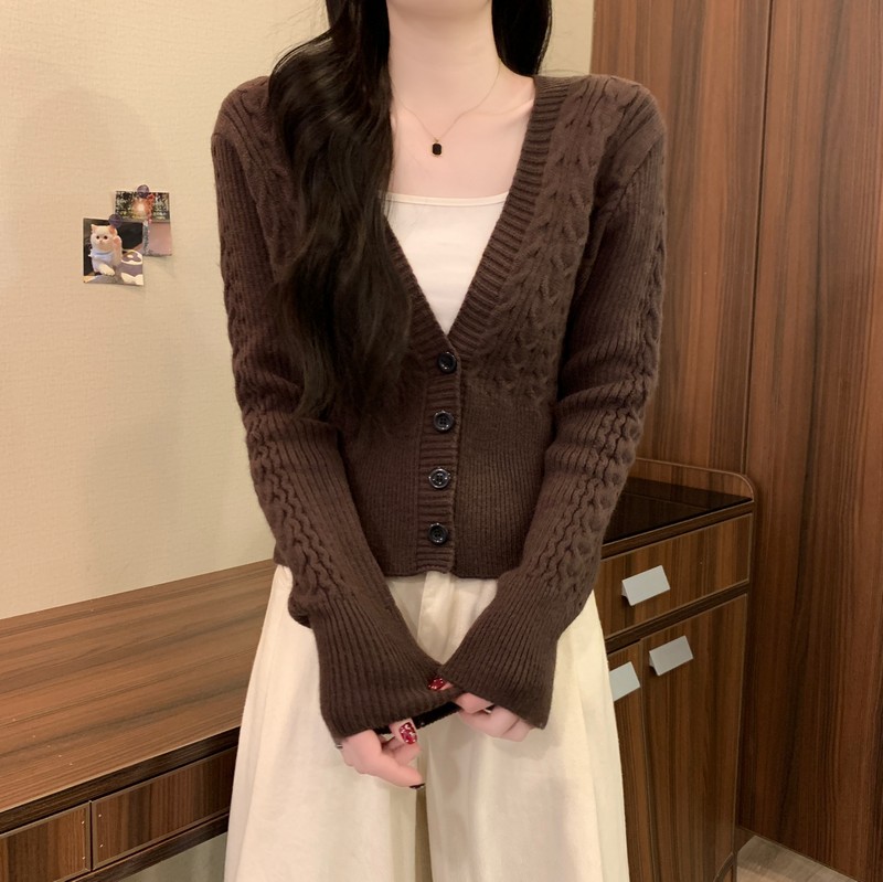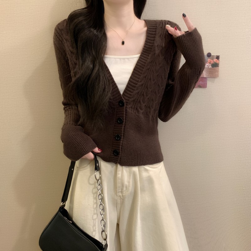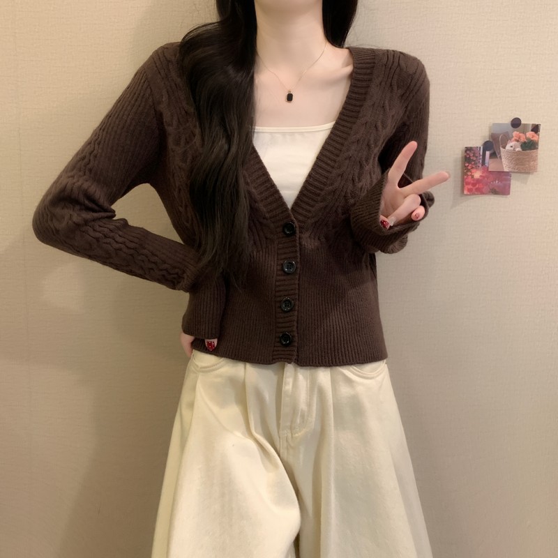 MY16580# 新款美拉德穿搭大V领麻花修身显瘦百搭短款针织开衫女裝貨源服裝批發