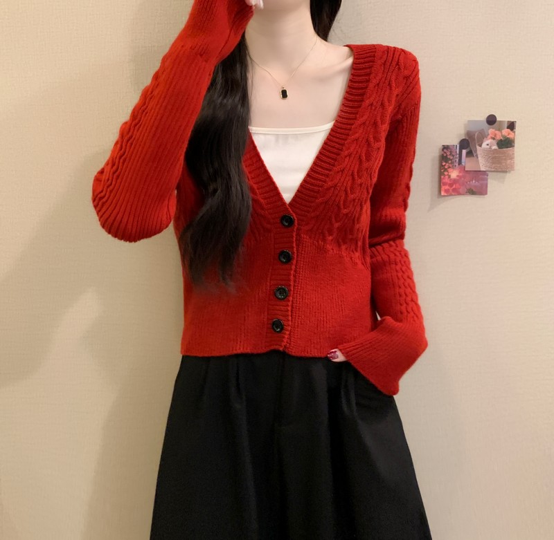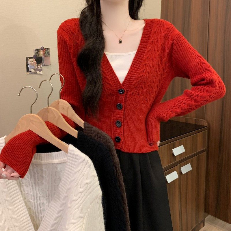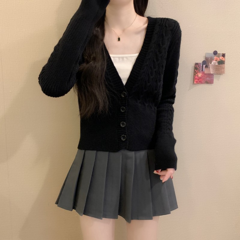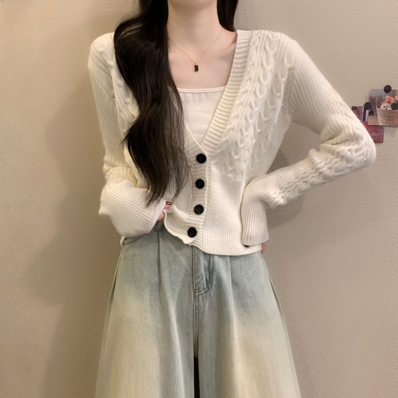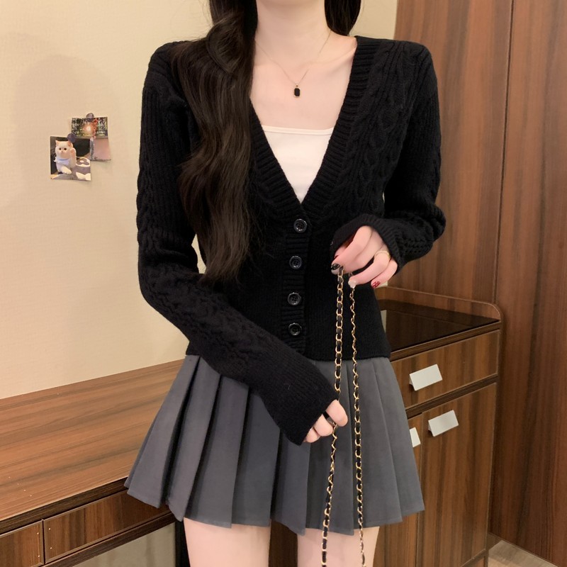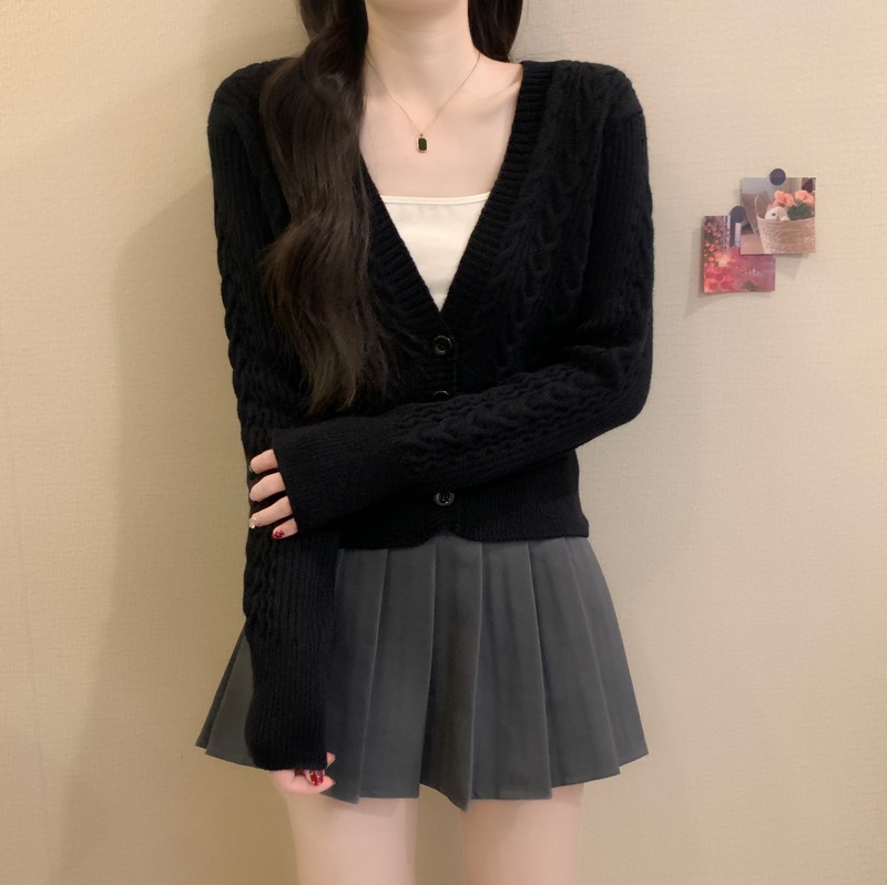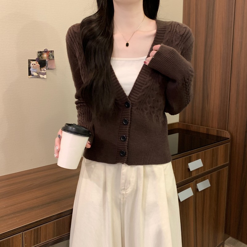 MY16580# 新款美拉德穿搭大V领麻花修身显瘦百搭短款针织开衫女裝貨源服裝批發