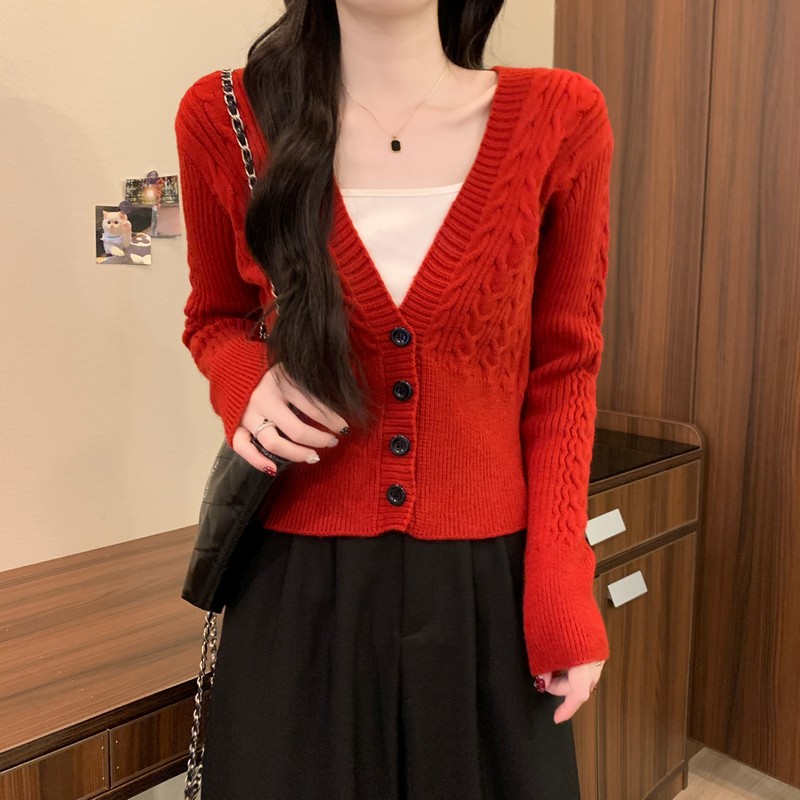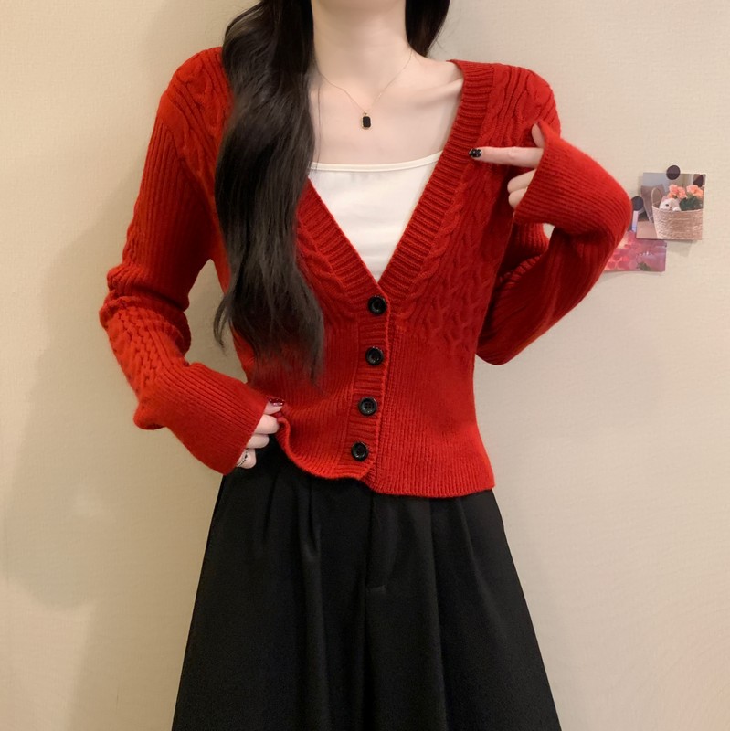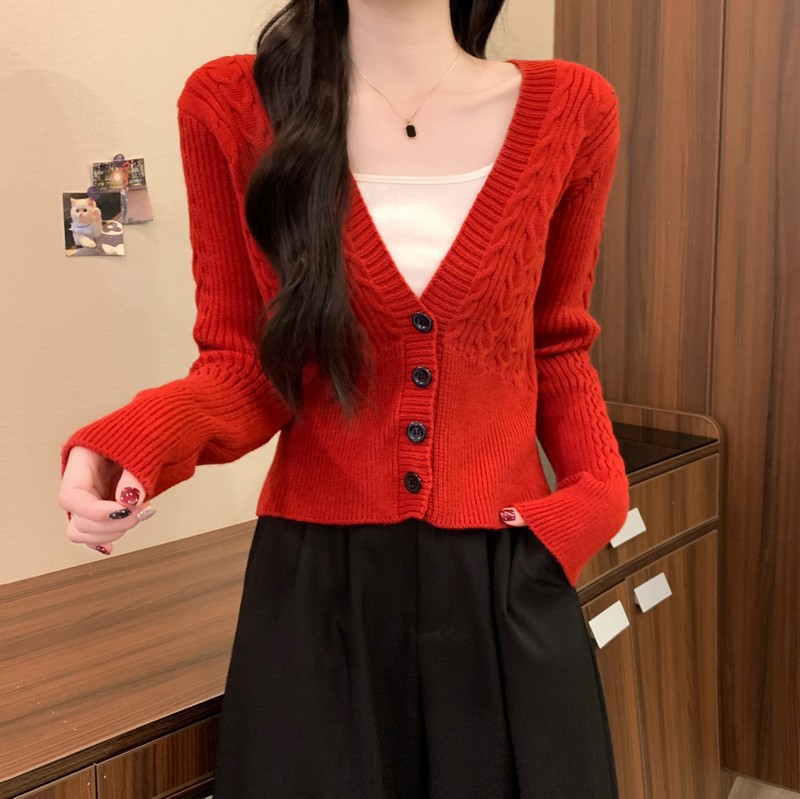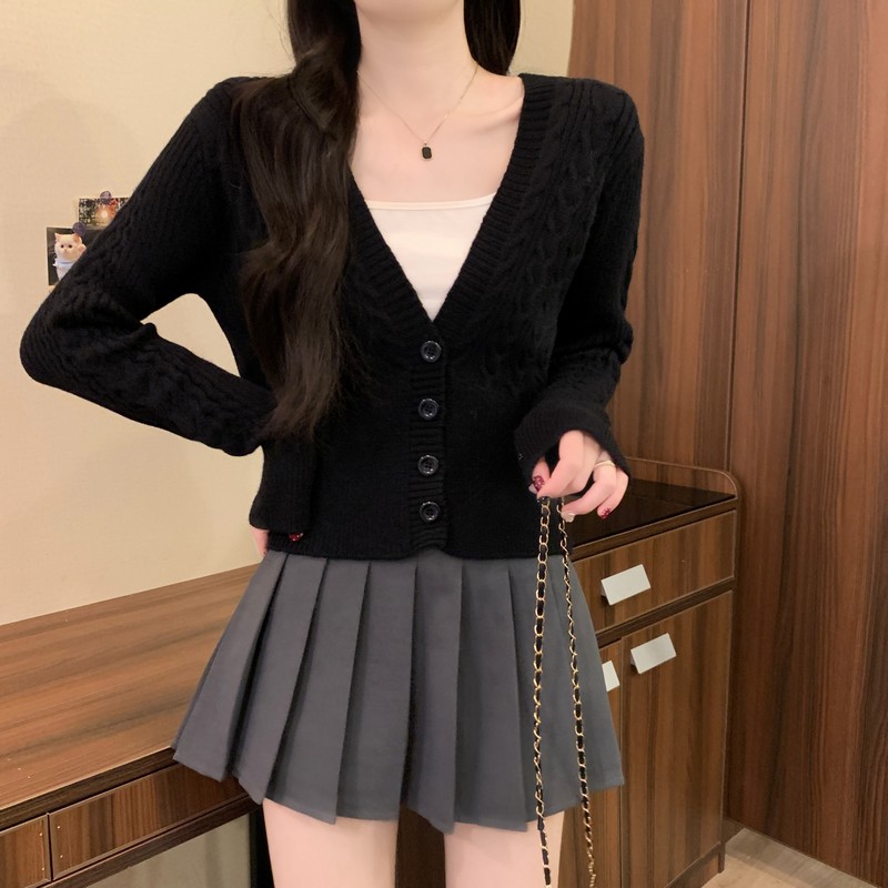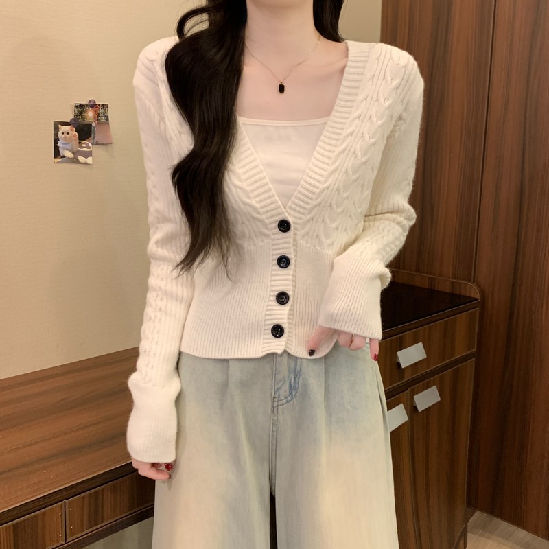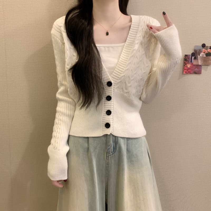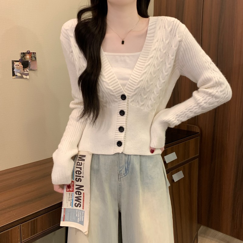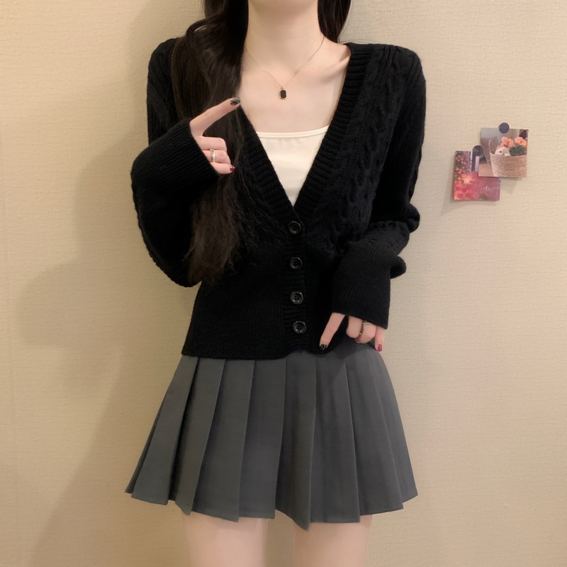 MY16580# 新款美拉德穿搭大V领麻花修身显瘦百搭短款针织开衫女裝貨源服裝批發