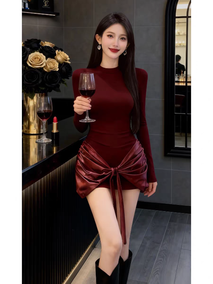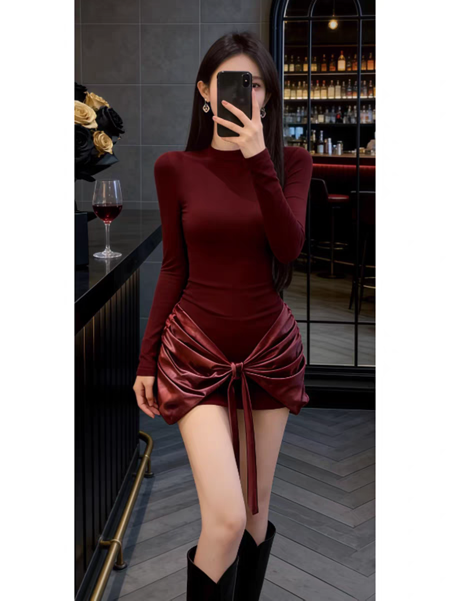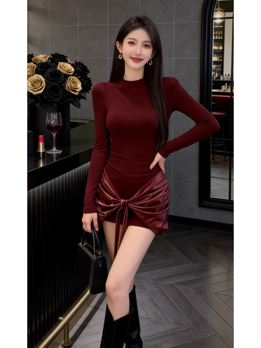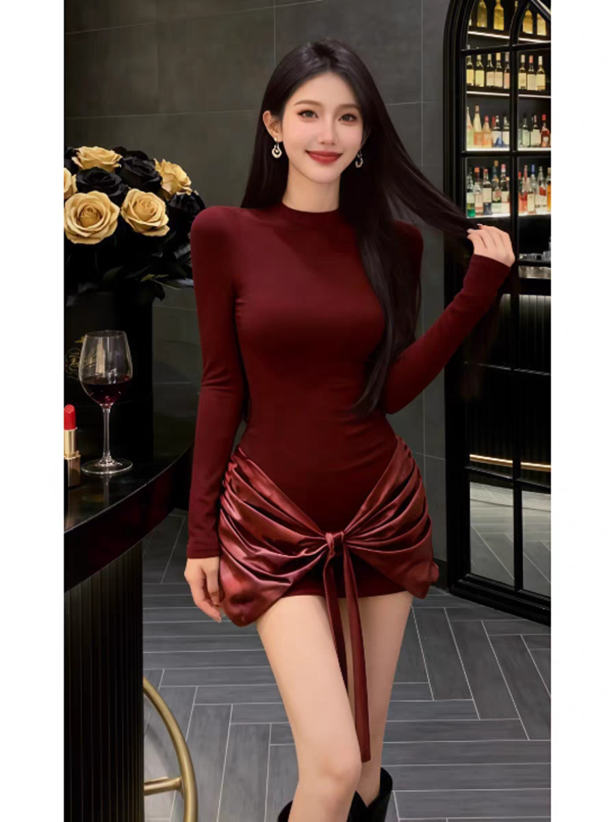 MY16587# 法式气质红色打底连衣裙女绝美巨好看轻熟御姐修身包臀短裙女裝貨源服裝批發