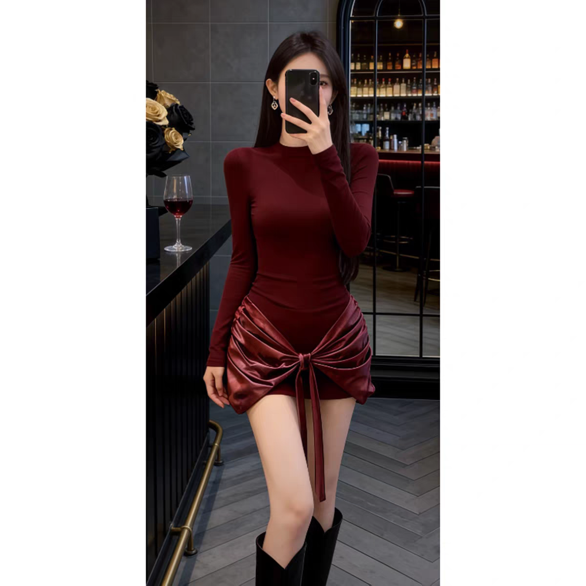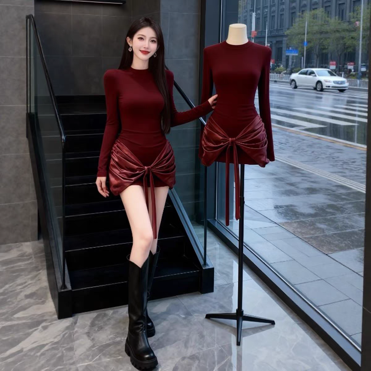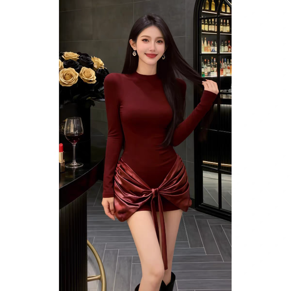 MY16587# 法式气质红色打底连衣裙女绝美巨好看轻熟御姐修身包臀短裙女裝貨源服裝批發