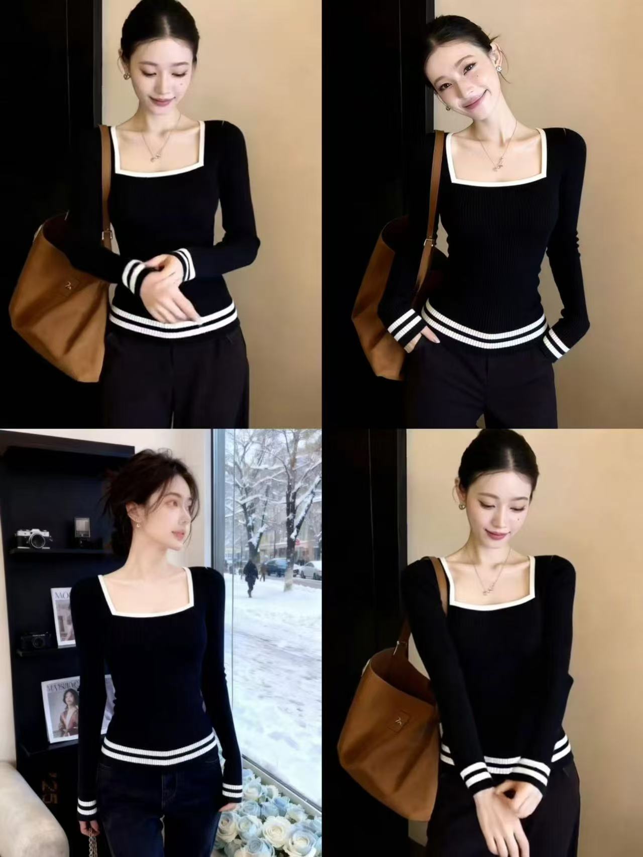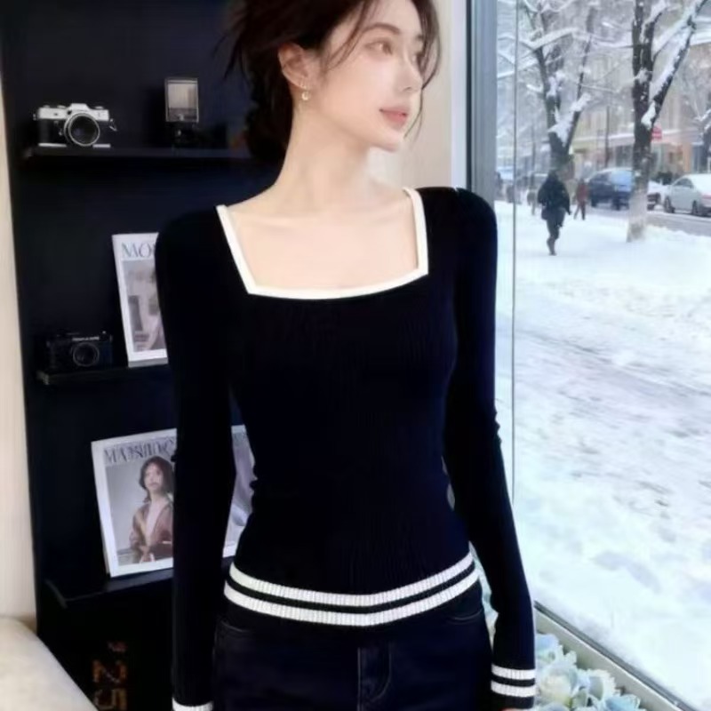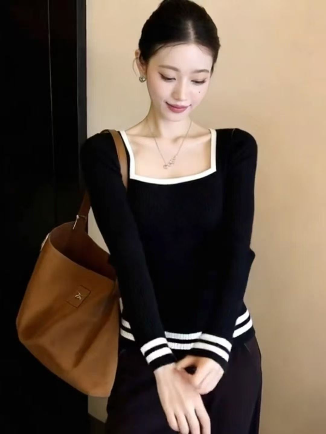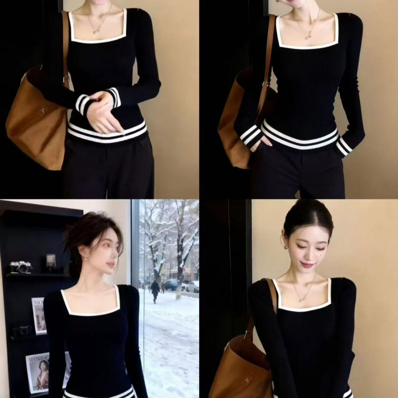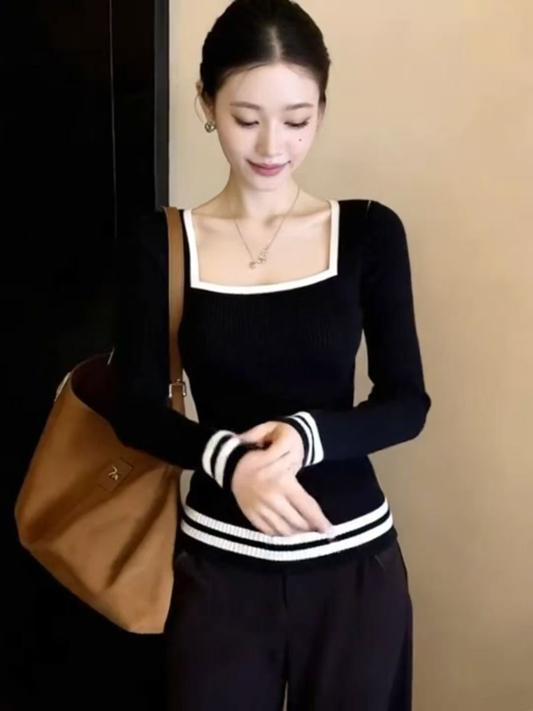 MY16593# 时尚方领撞色条纹针织衫新款纯欲风修身长袖打底衫上衣女裝貨源服裝批發